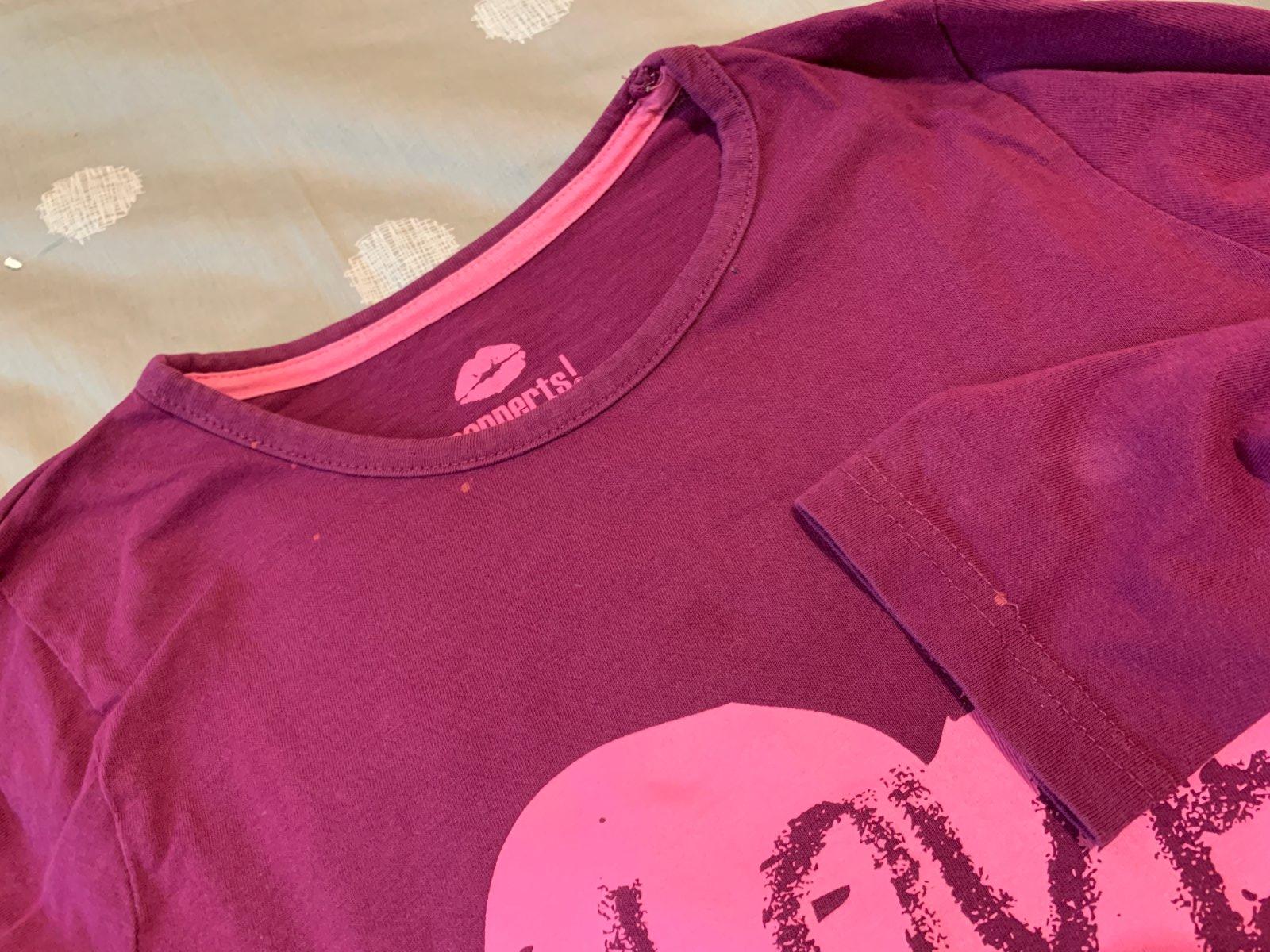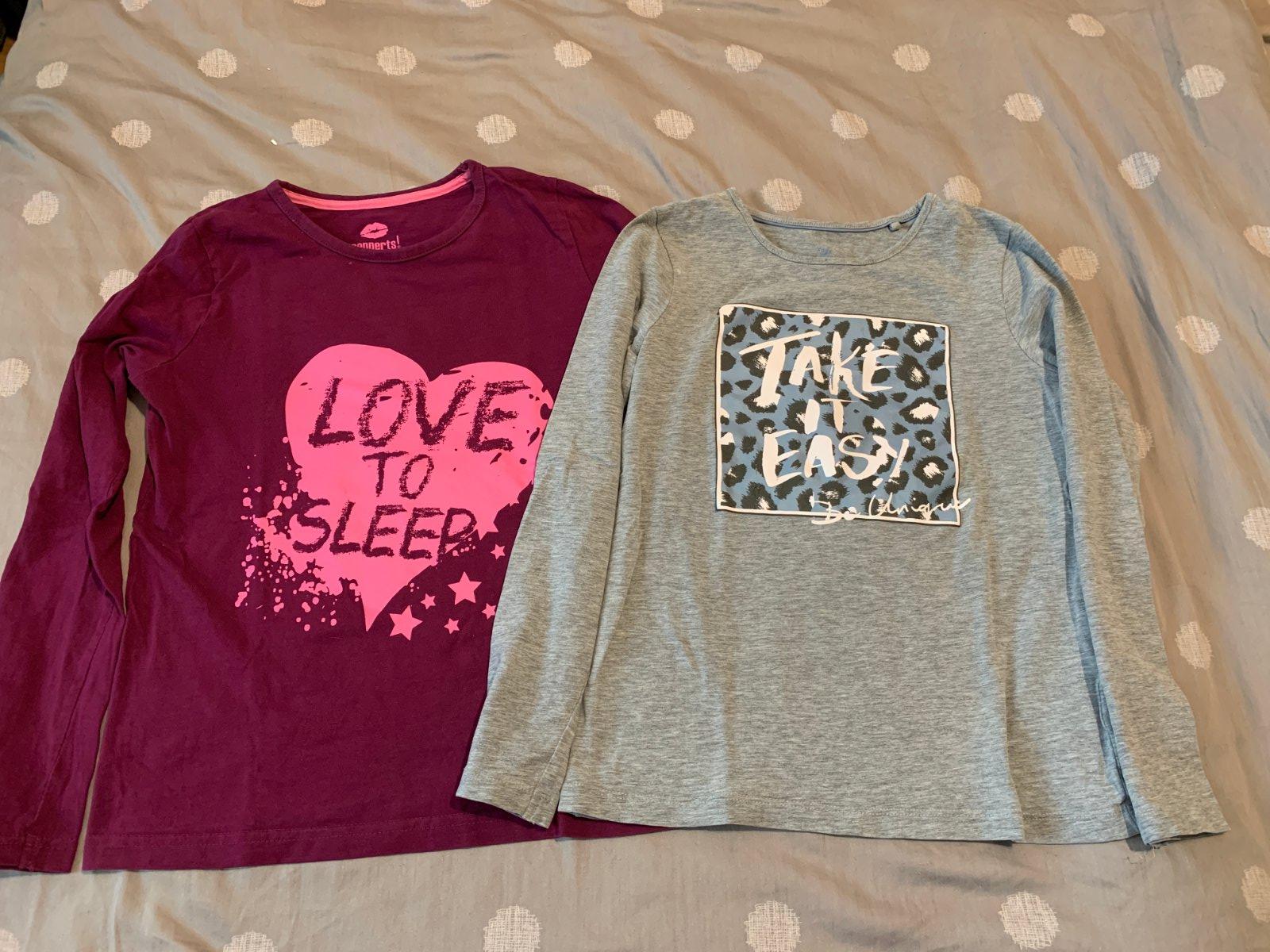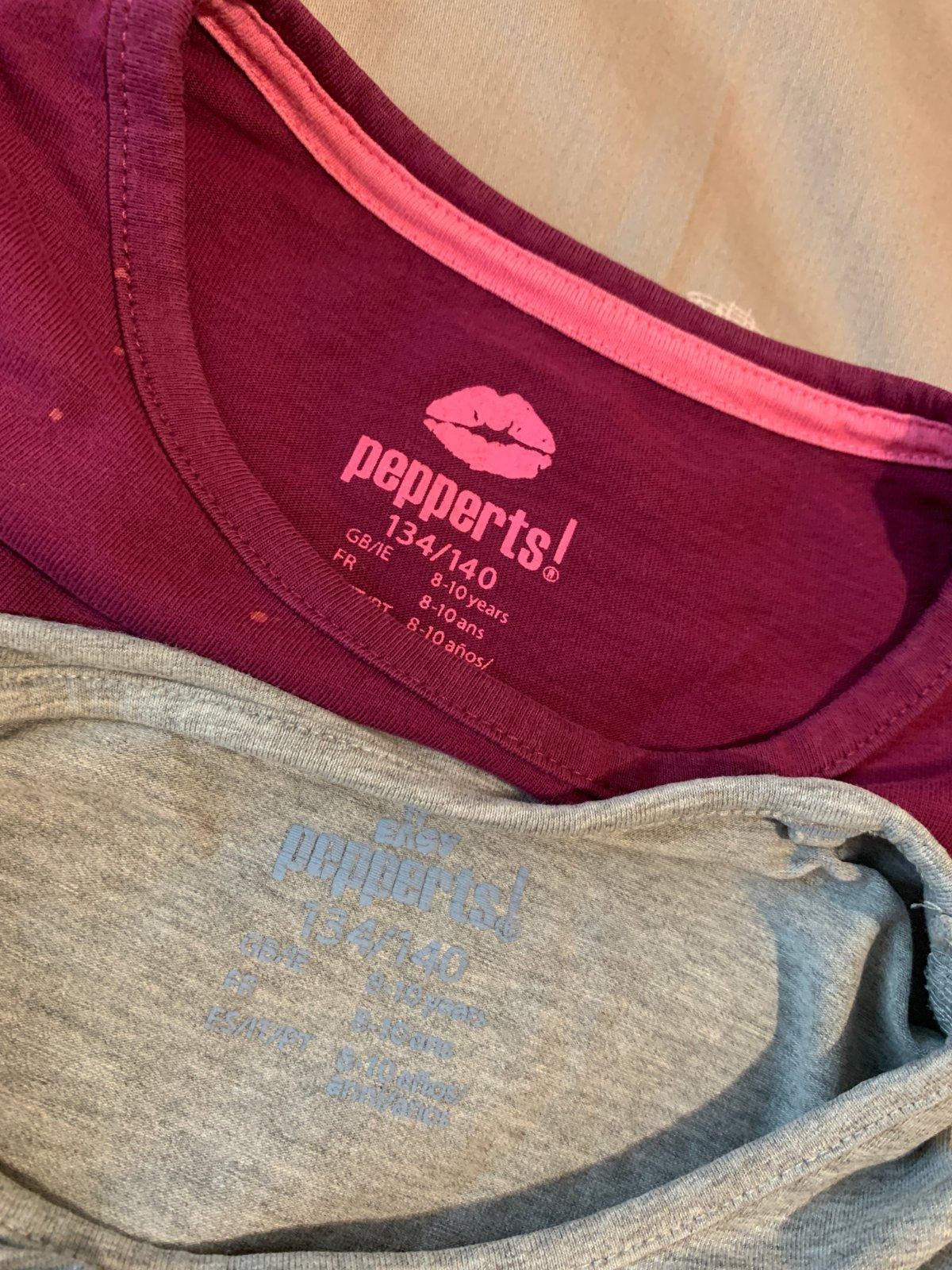 2 tričká bordové má malinké fliačky a 1 zašitá mini dierka a sivé jeden fliačik a jedna mikro dierka - všetko nafotené. Veľkosť 134/140.