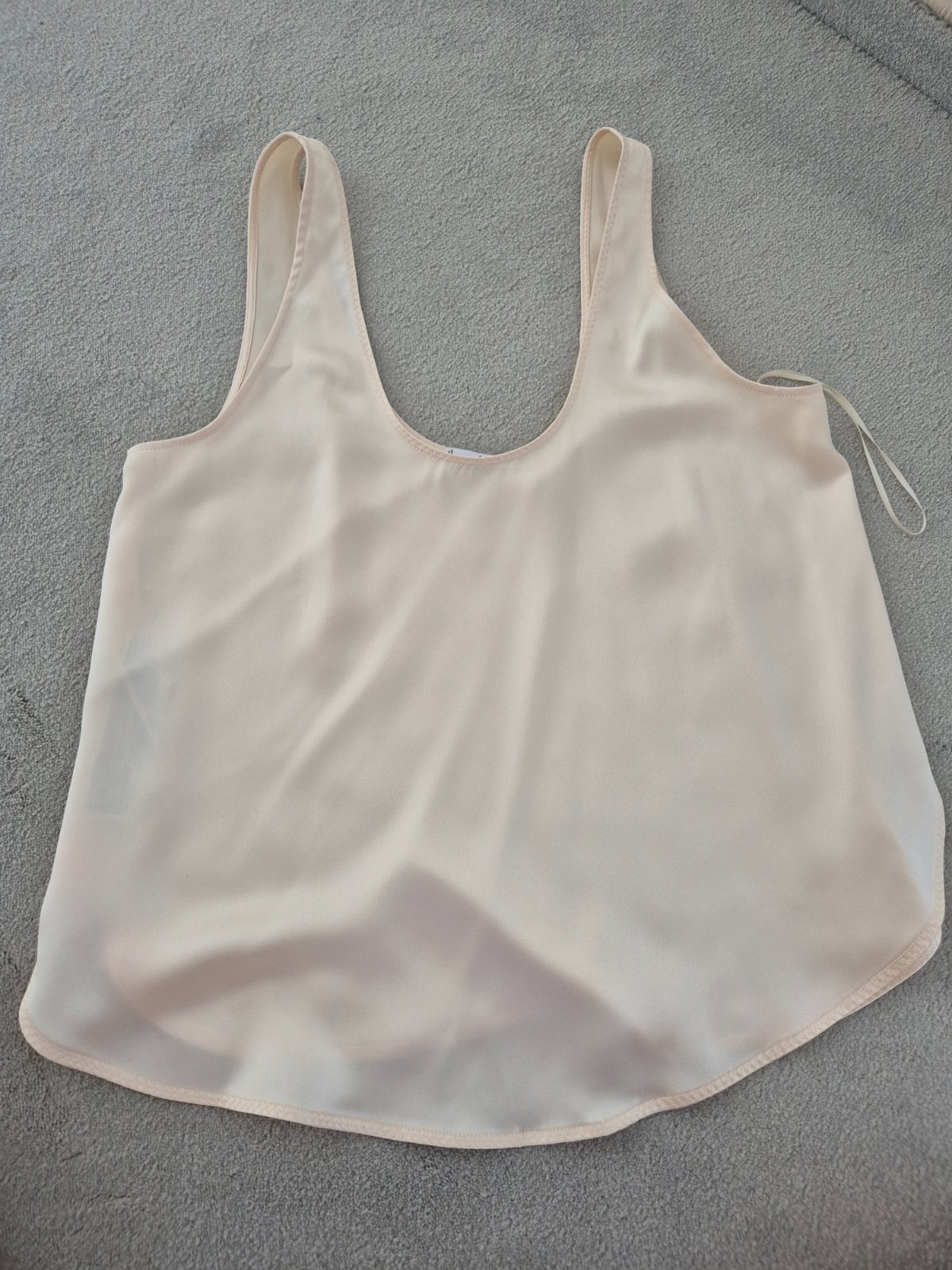 krasne tielko so spagetovymi ramienkami. Znacka M, ale skor by som ho ponukla ak ste na rozharani S/M, pretoze aj ho posuvam lebo mi je krakte. Farba krasna taka tmavocervena, vystrih ako do V.