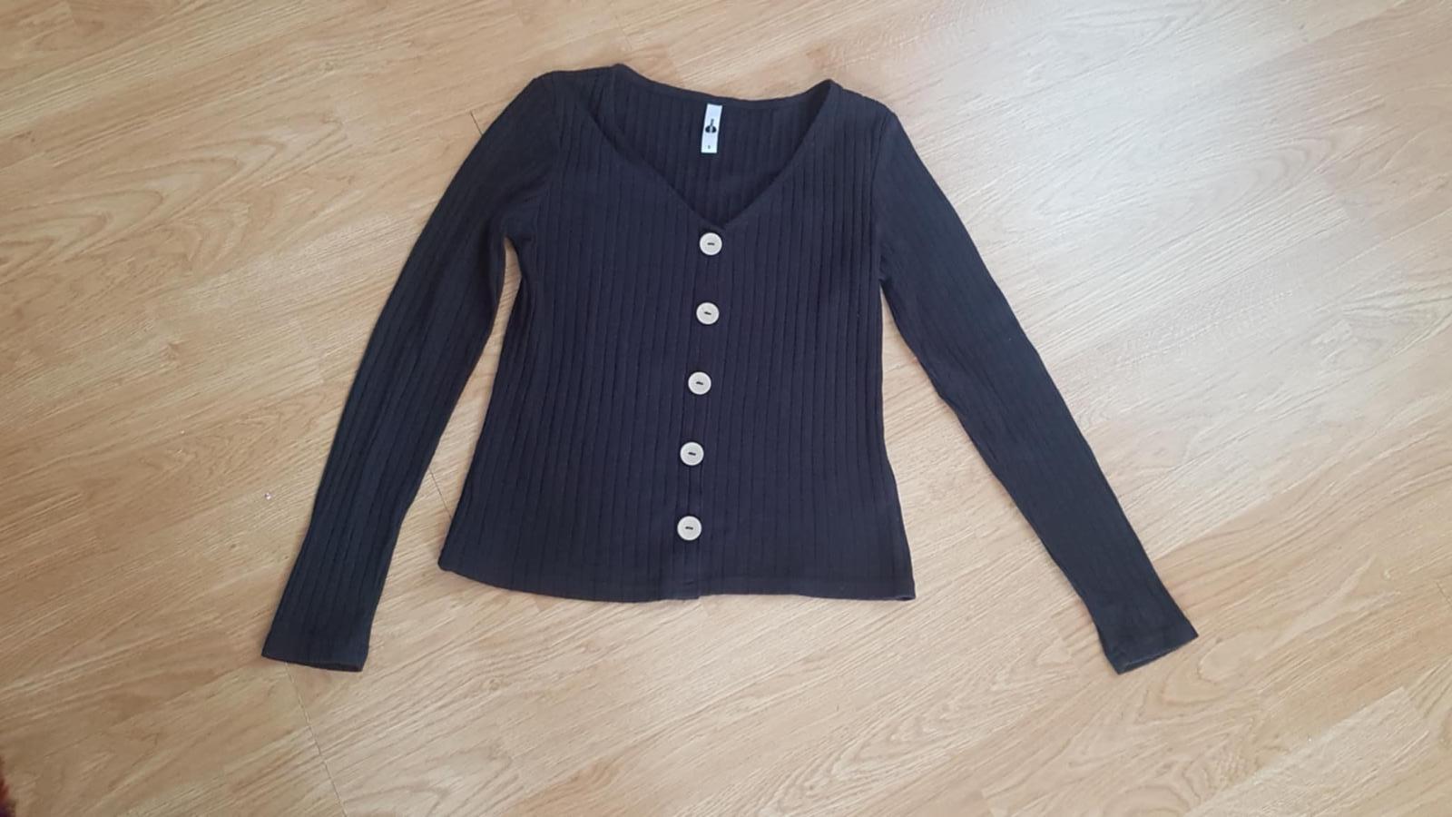 bez žmolkov a poškodení, výborný stav, gombíky sú imitácia dreva, nedá sa rozopínať. Šírka popod paže je 42 x 2 cm, celková dĺžka meraná cez stred chrbta je 49 cm.
