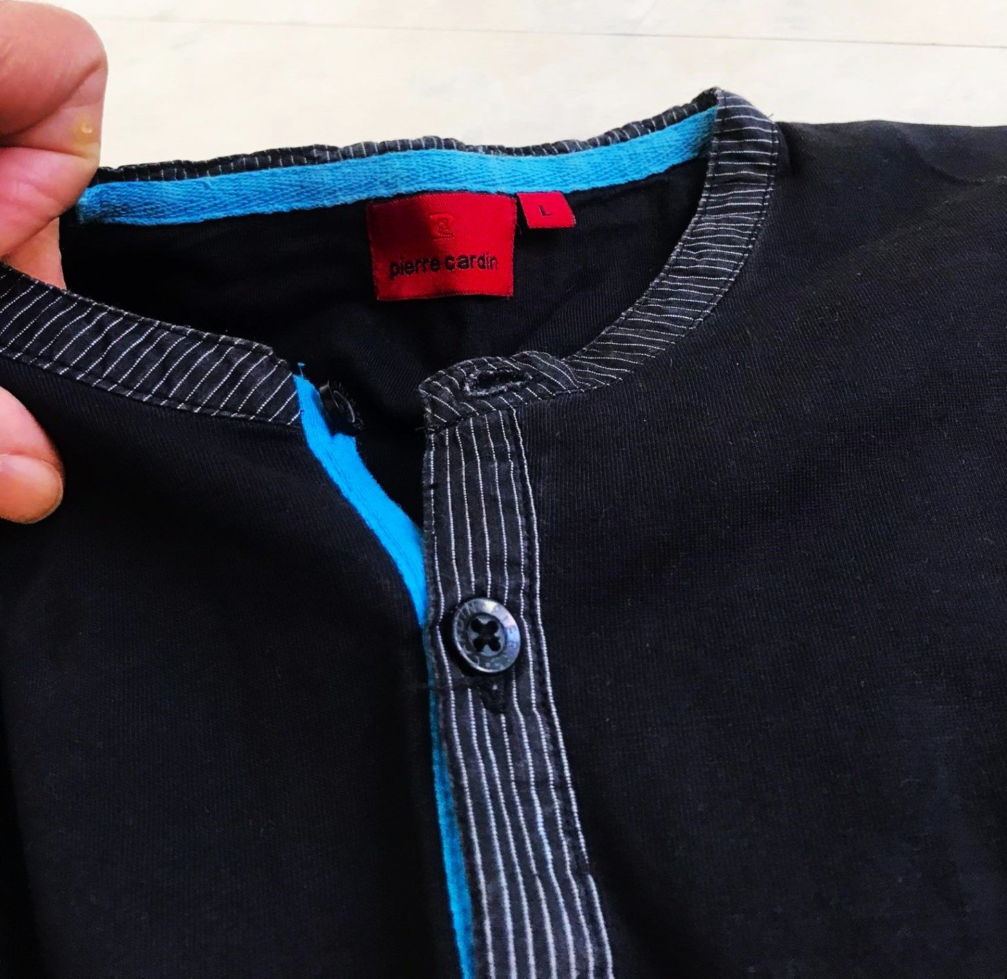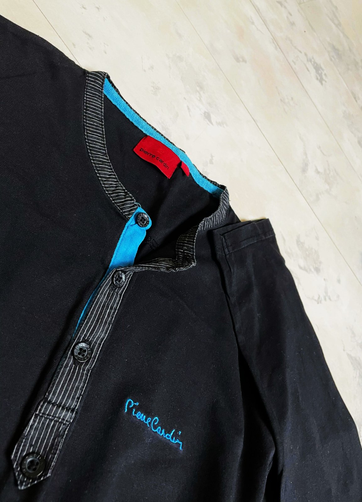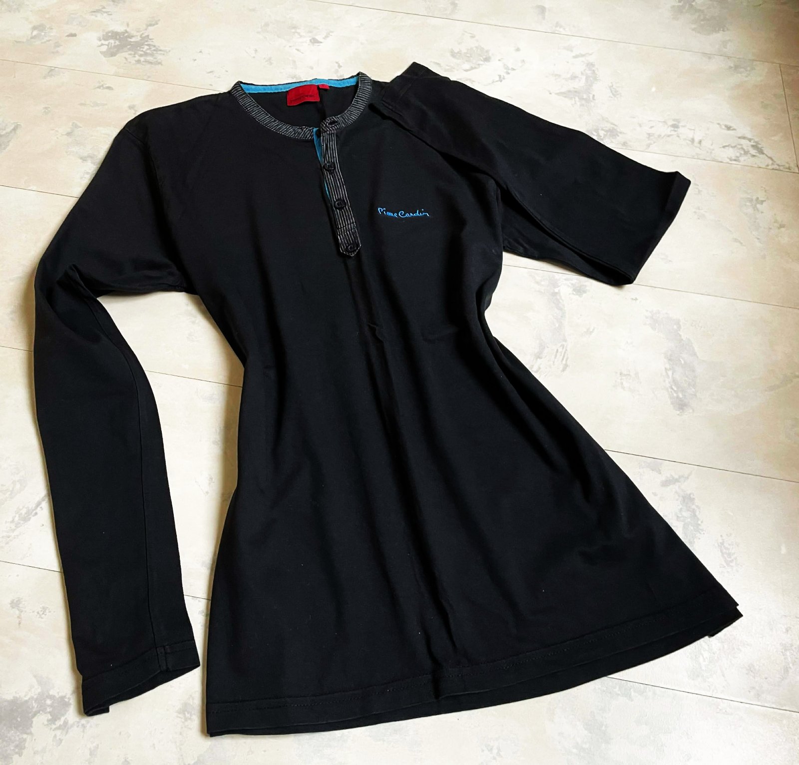 pánske tričko s dlhým rukávom od značky Pierre Cardin,s výstrihom typu Henley, ktorý má zapínanie na gombíky a kontrastné tyrkysové lemovanie na vnútornej strane goliera a légy,