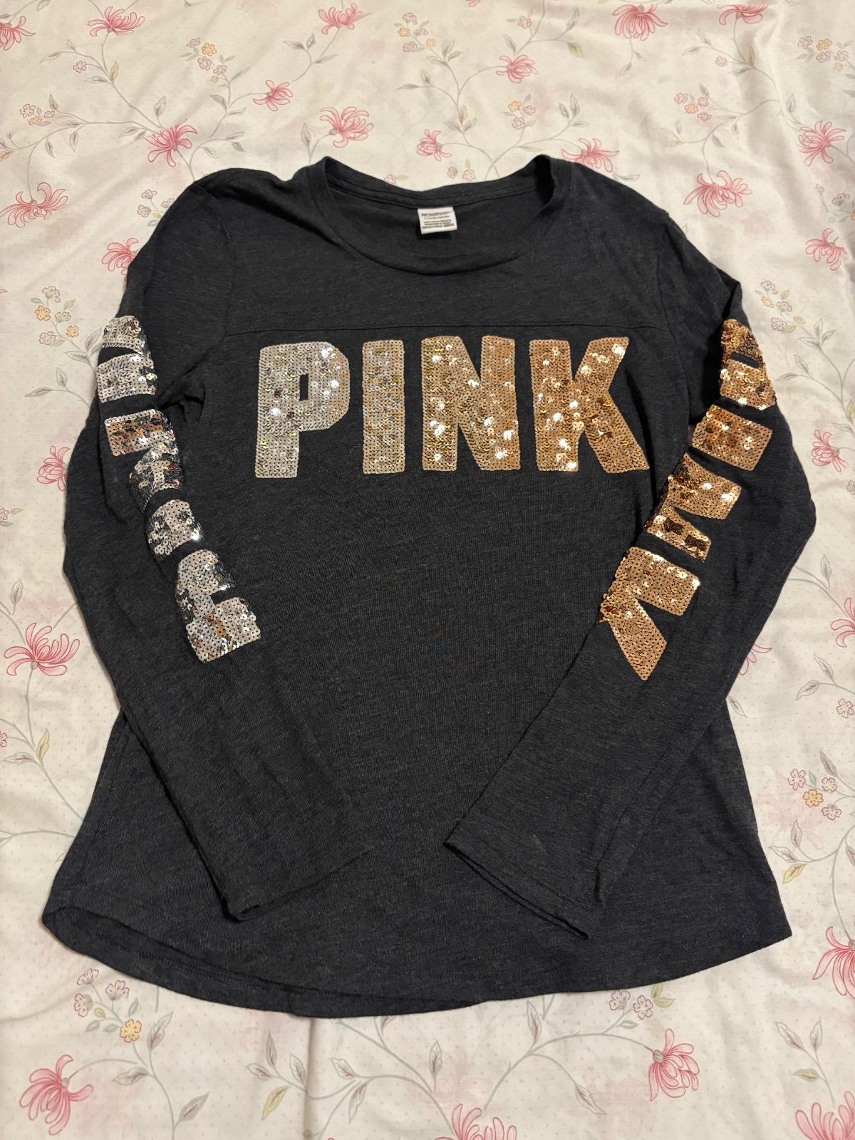 Úplne top Pink nátelnik v tmavosedej farbe s veľkým bling nápisom na chrbte ( zlato strieborný ) oblečený asi 2 x ako nový . Velkost pisana xs sedí skôr na s a m . Ja už nevyuzijem posuvam ďalej . ...