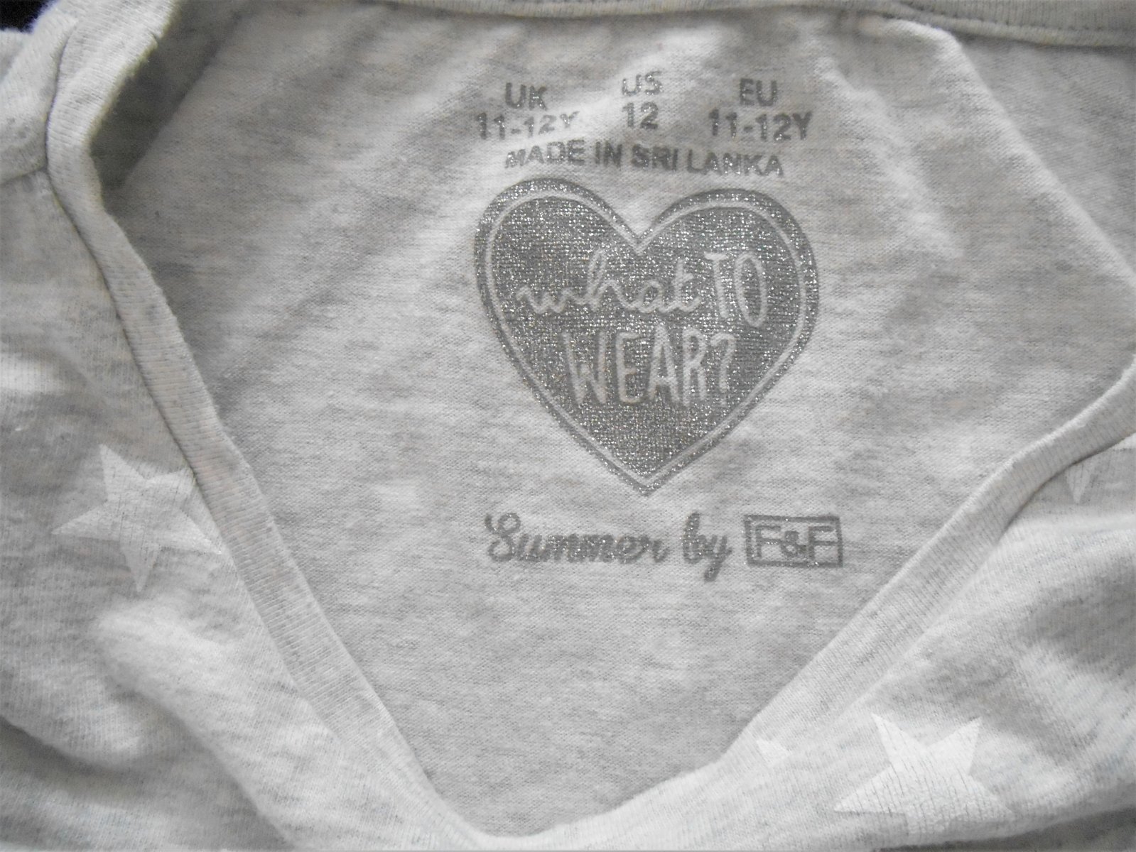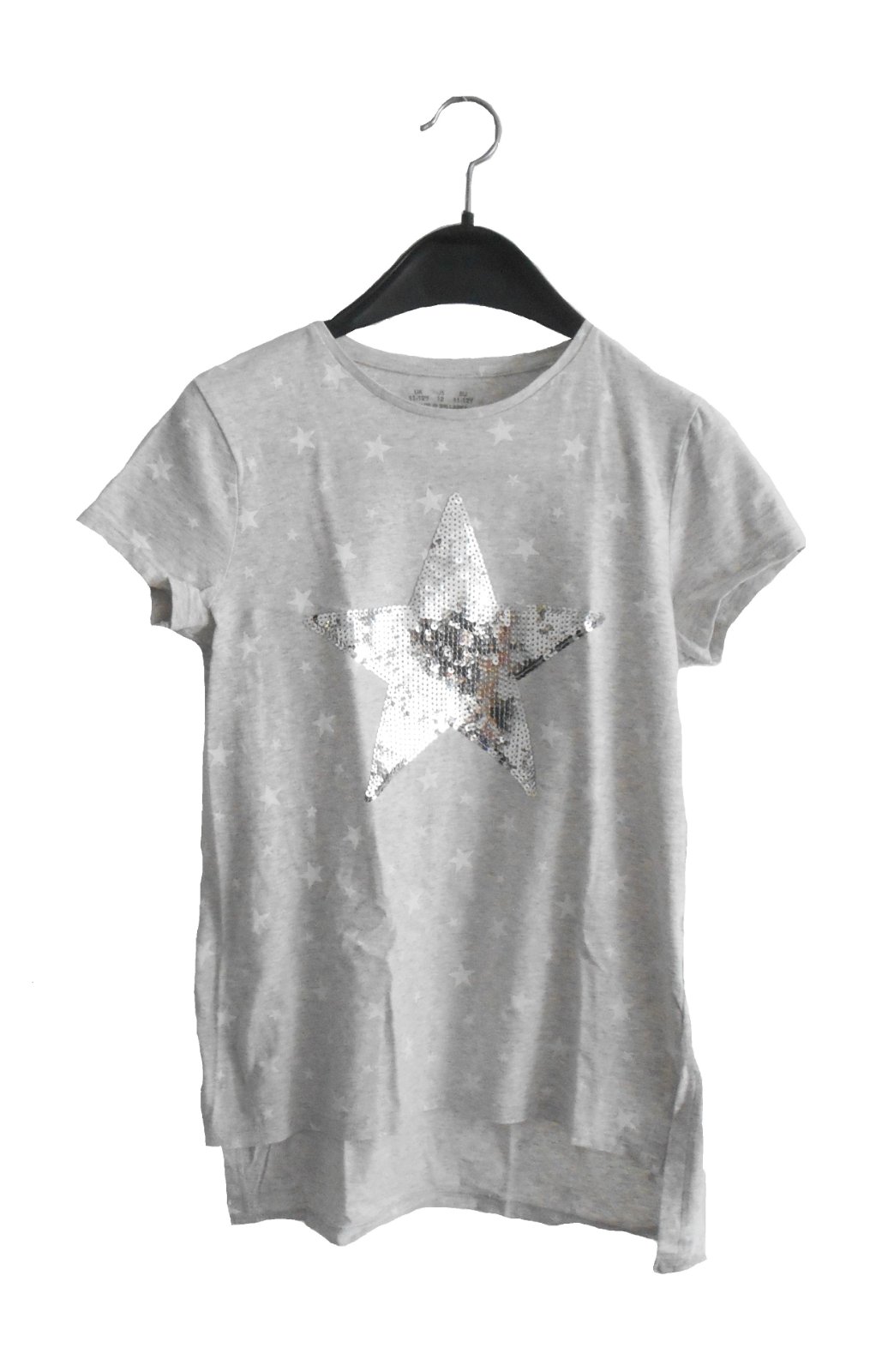 predám dievčenské tričko s flitrami v dobrom nosenom stave, píšu veľkosť 11-12 rokov, 152, značka F&F, materiál: 95% bavlna, 5% elastan, rovný strih, bočné rozparky, predľžený zadný diel o 7 cm, farba bledučká šedá