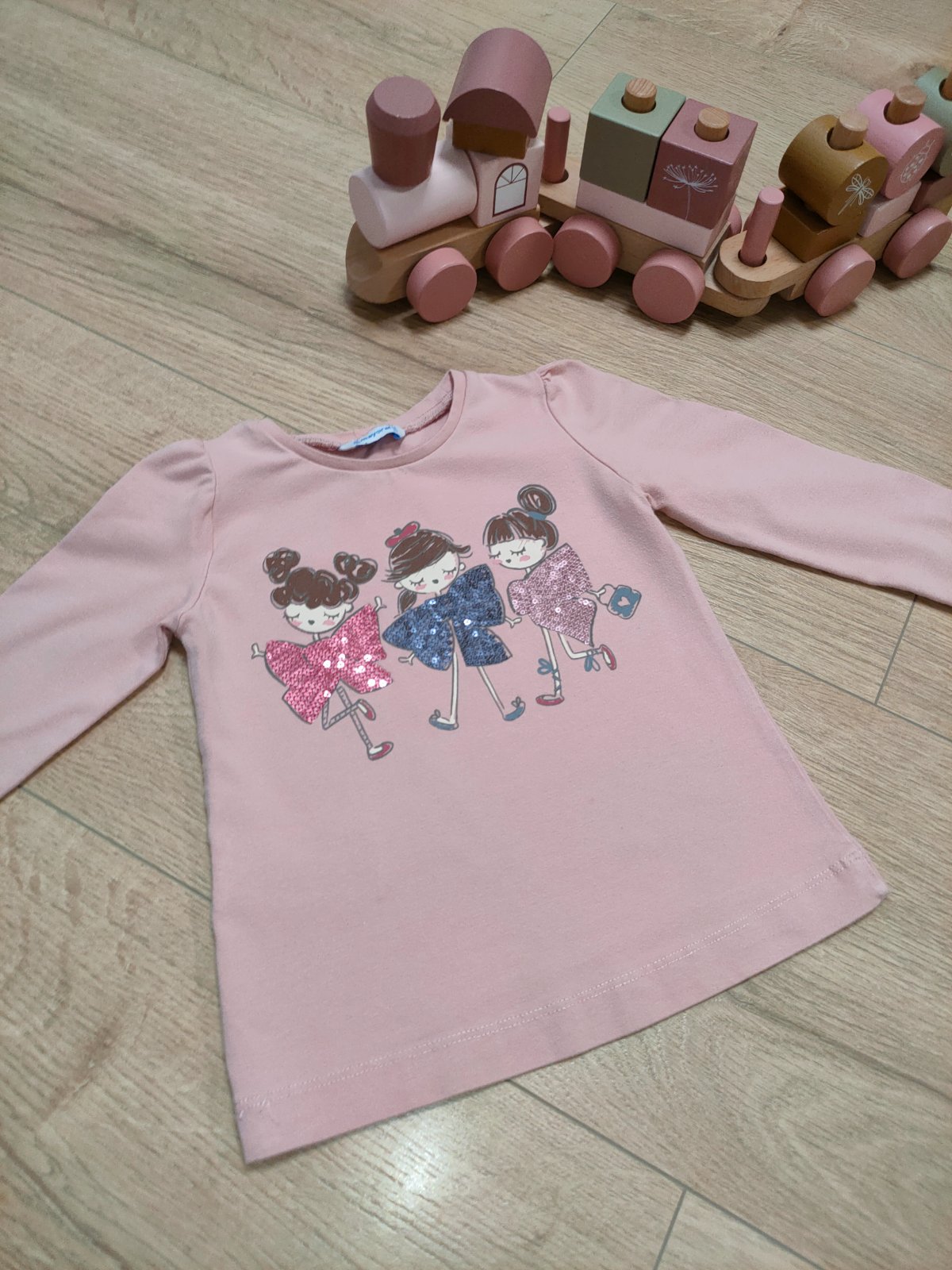 Predám dlhorukávové ružové tričko s obrázkom značky Mayoral, veľkosť: 98. Bežné známky nosenia a prania.