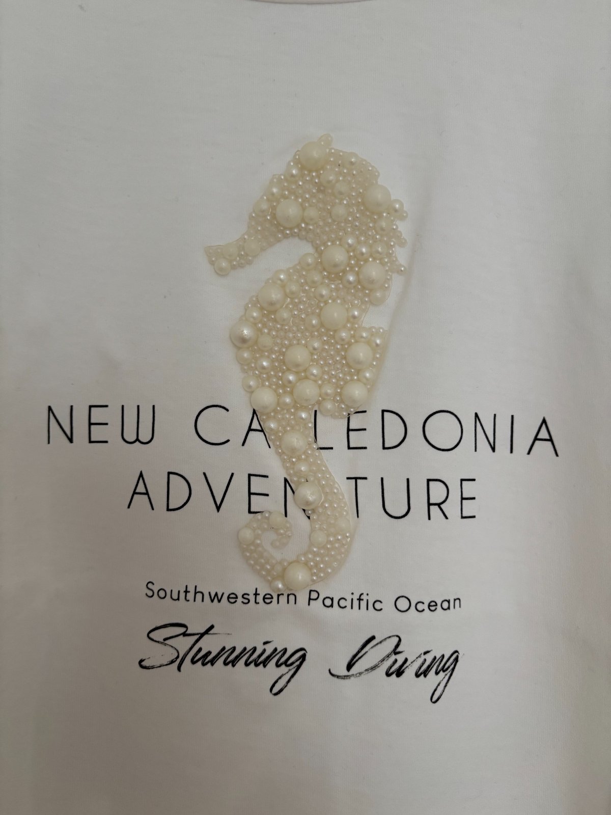 Biele tričko značky Zara, s korálkovou aplikáciou v tvare morského koníka a nápisom. Tričko bolo kupované v Zare v Lisabone. Osobný odber je možný v BA a NR.