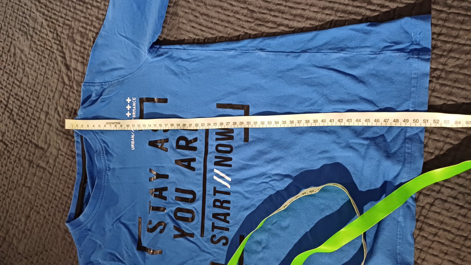 Modré s nápisom - dĺžka je 51 cm a rukáv od krku je 55 cm, cena 2,50 eura.