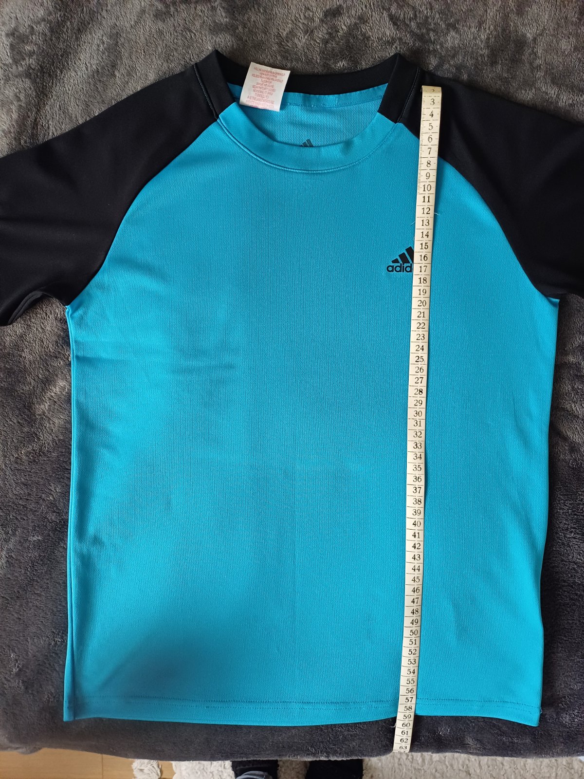 chlapčenské modré tričko, potlač, príjemný kvalitný materiál, zloženie: 100 % bavlna, stav: dobrý, nosený, známky prania na potlači, značka: Adidas, uvádzaná veľkosť na štítku 11-12 rokov, 152 cm, ...