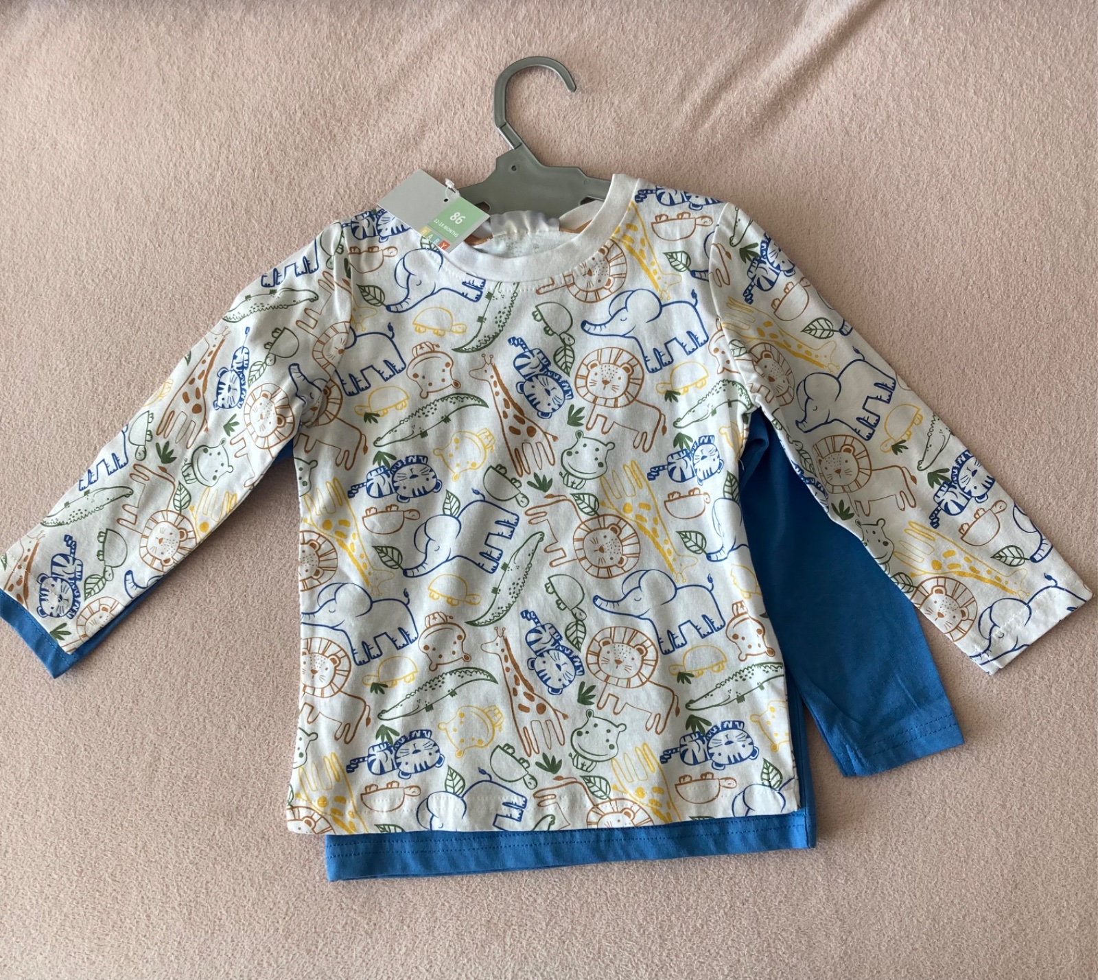 Tričko s dlhým rukávom veľkosť 86, na ľavom pleci gombičky, na prednej strane bledé fliačiky z džúsu. Cena 1€+ poštovné