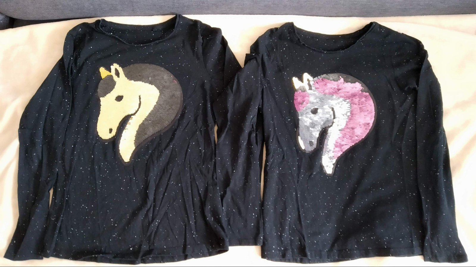 Už len jedno tričko s obrázkom koňa z pretáčacich flitrov, raz je kôň doružova a raz do žlta ako na fotke.