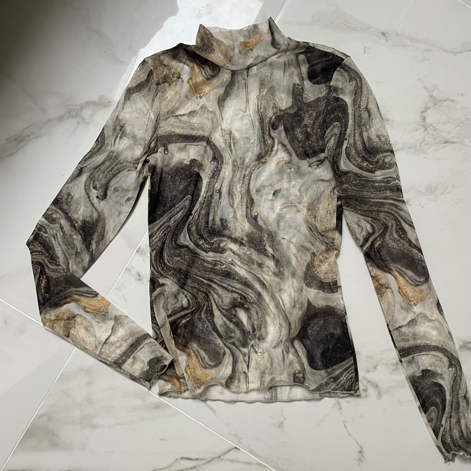 Štýlový priesvitný top značky Green Apple s výrazným marble vzorom v odtieňoch sivej, čiernej a jemných zlatých tónov. Top má dlhý rukáv a vyšší golier, vďaka čomu pôsobí veľmi elegantne a moderne.