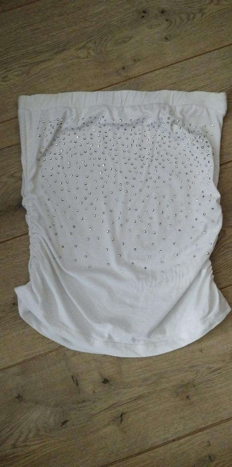 Biely bezramienkový top zdobený jemnými trblietavými kamienkami.