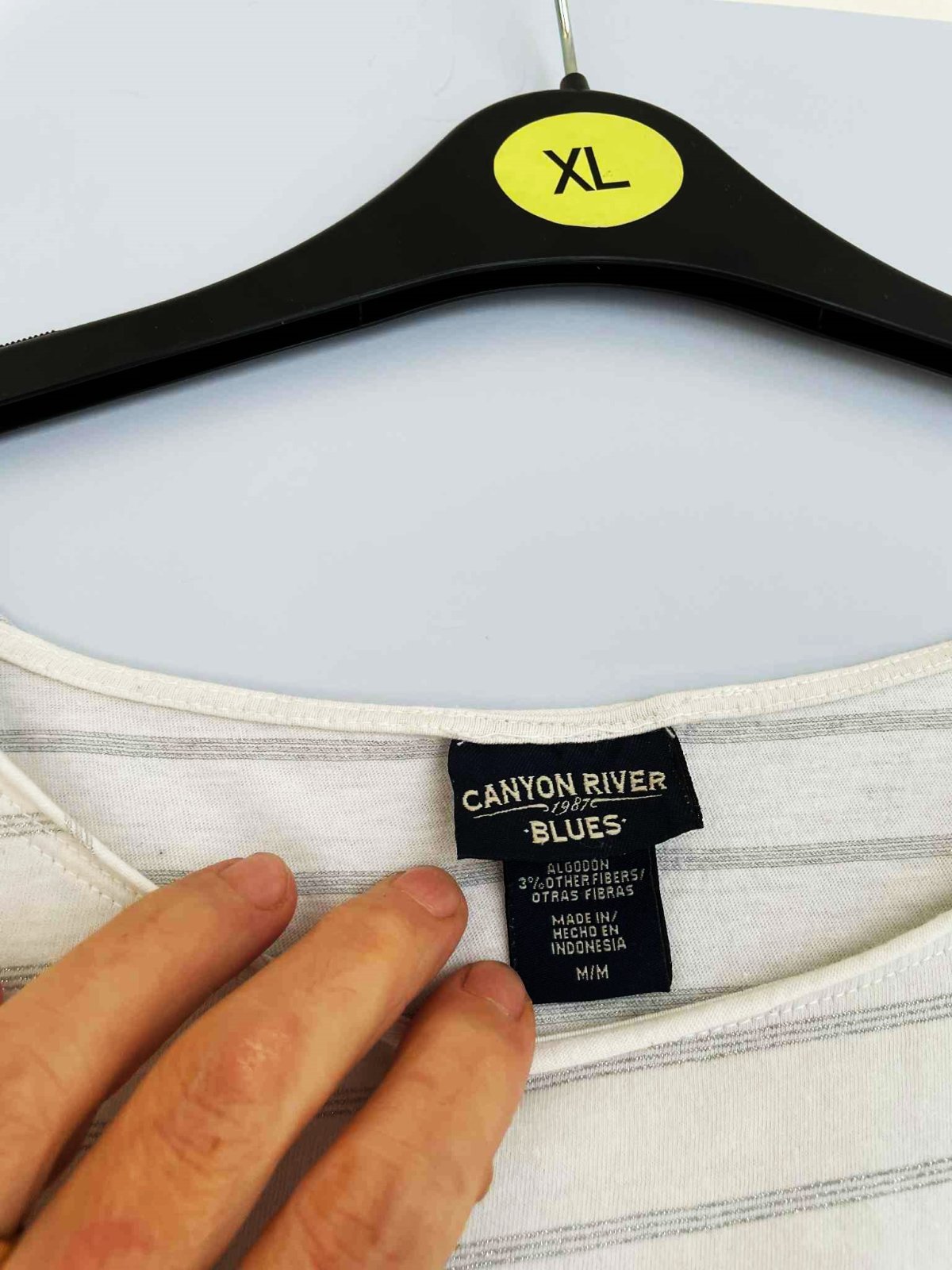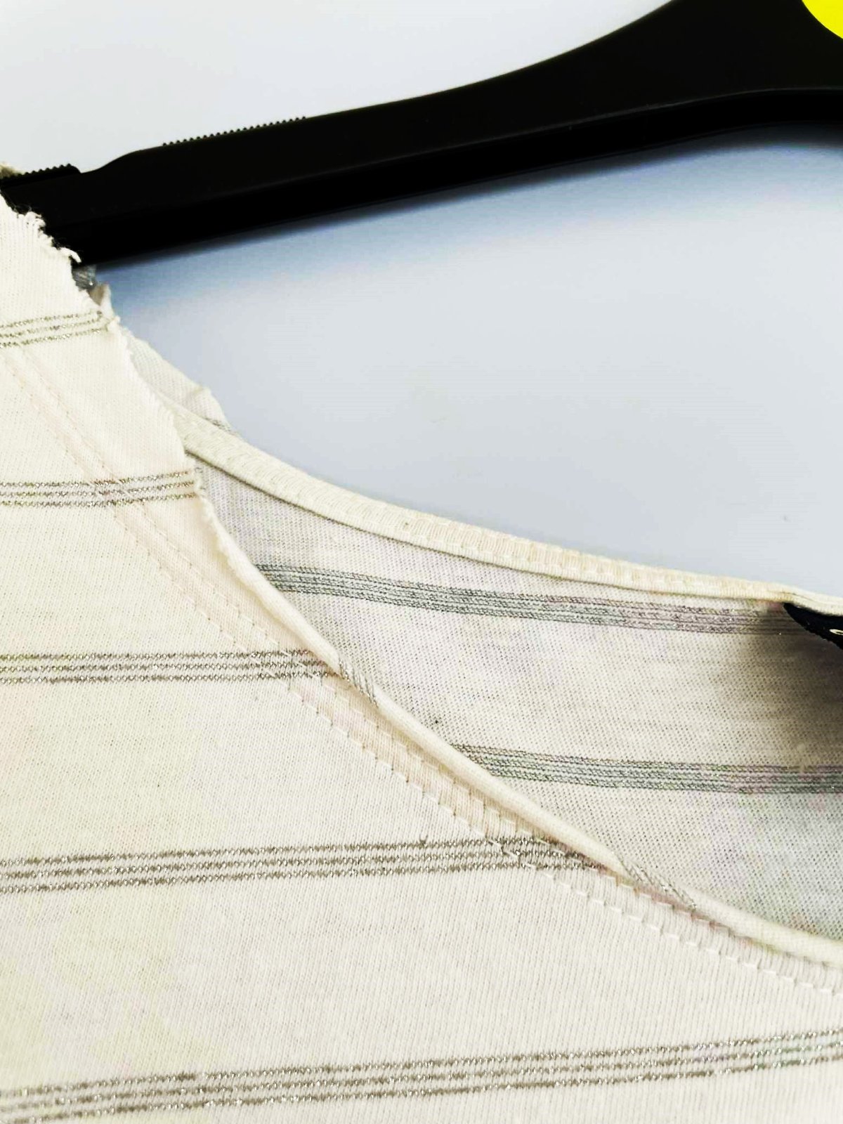 kvalitné tričko,jemné svetlošedé prúžky, so strieborným pretkávaním - veľmi jemným,lem okolo krku akoby neukončený,nosí sa voľné a široké, vhodné od veľkosti S-L,šírka meraná pod pazuchou = 54 x 2 cm, rukáv = 61 cm,dlžka meraná na boku pod pazuchou = 36 cm, dlžka meraná v strede - 60 cm predný diel,63 cm zadný diel - vzadu je trocha dlhšie,je strihané do oblúka,značka vyfotená