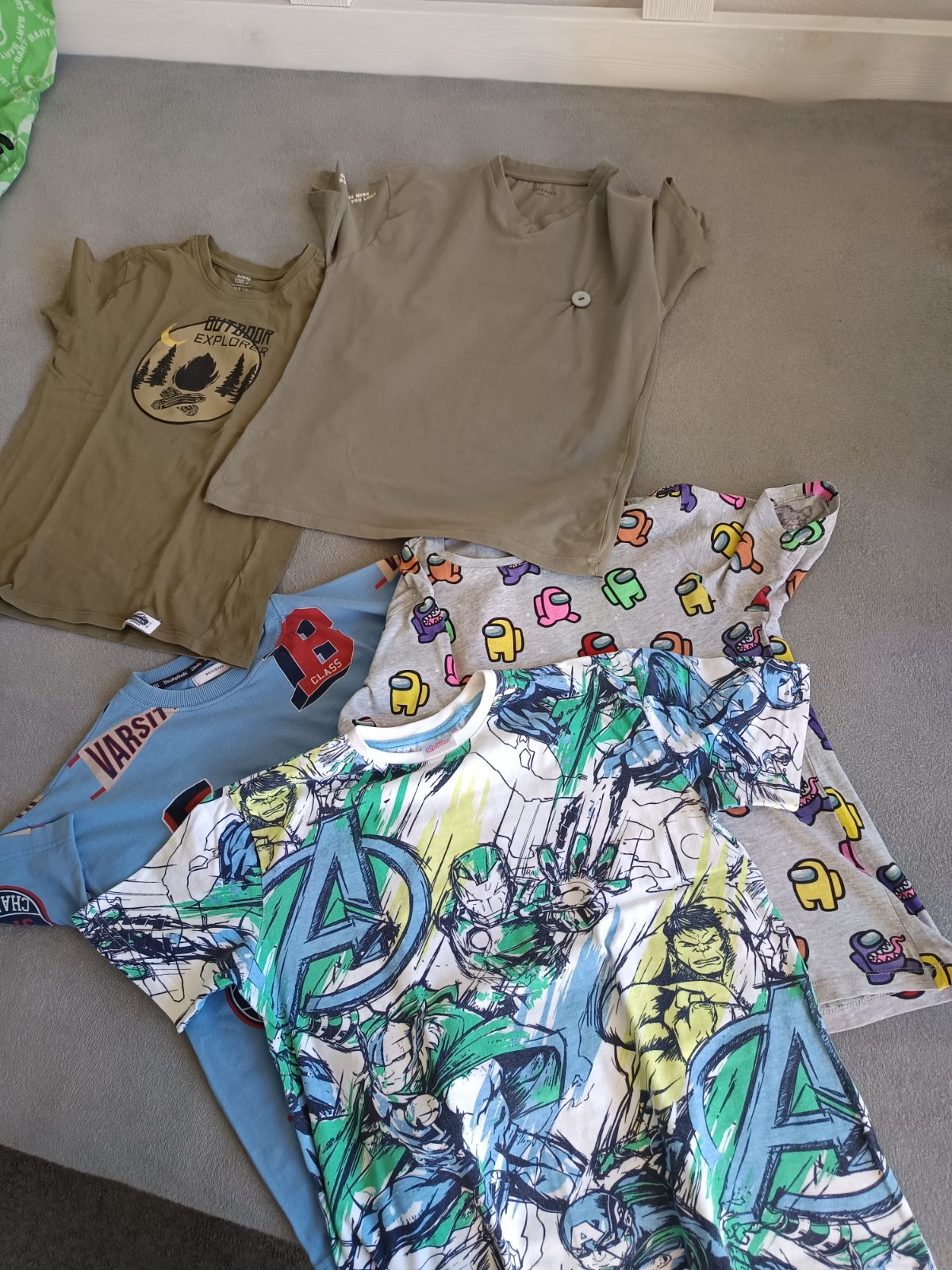 Tri reserved tričká,jedno sinsay a jedno pepco ,,,veľmi pekný nosený stav jedno leto ..gombík opravil dierku na olivovom tričku...cena spolu