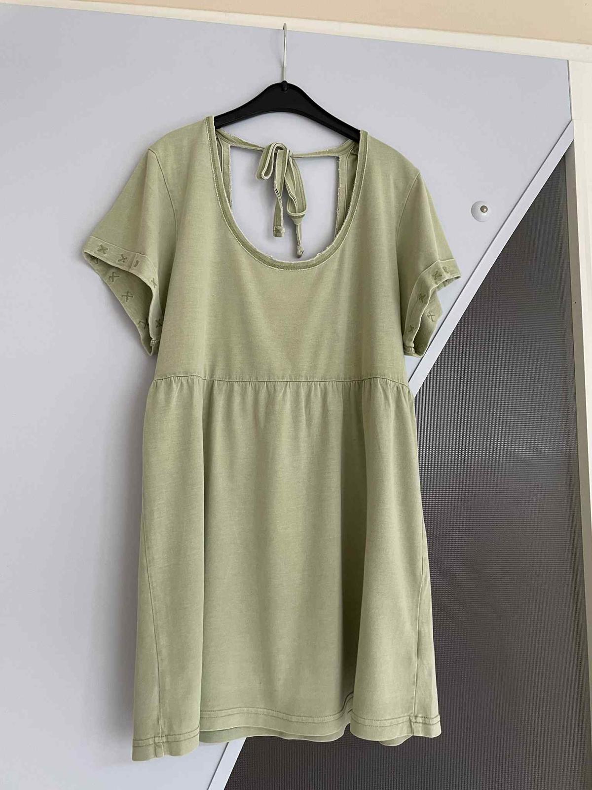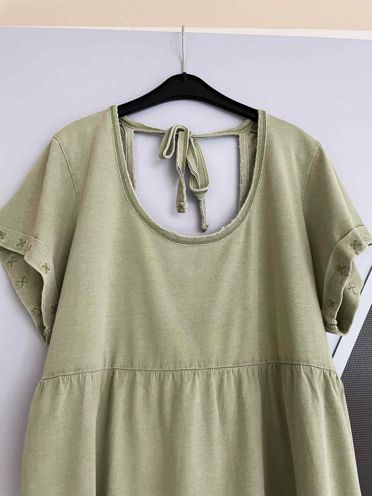 super tričko - vzor vynoseného spraného trička folkového typu,vzadu na uväzovanie,farba akoby vyblednutá zelená do sivej ,studený odtieň,nosí sa voľné,vhodné aj pre tehotné,alebo po tehotenstve,pod prsiami jemne nabraté - voľne padá,krásne zakryje nedostatky (bruško ),