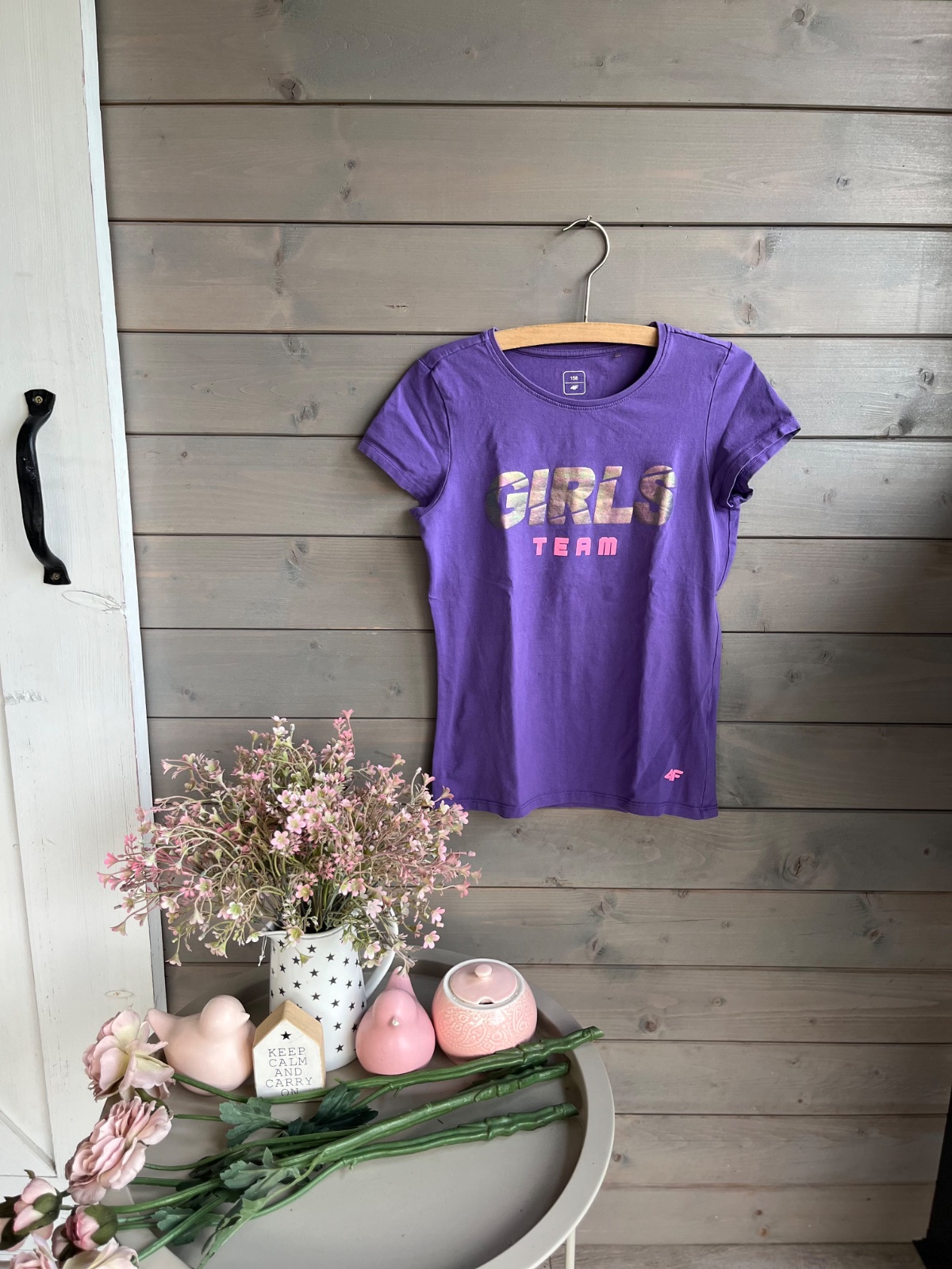 fialový predĺžený bavlnený top so striebornou potlačou, dole zakončený do gumy, pekný, málo nosený, materiál 100 % bavlna, porovnaj si miery. Merajte: šírka pod pazuchami = 35 cm, šírka v páse = 33...