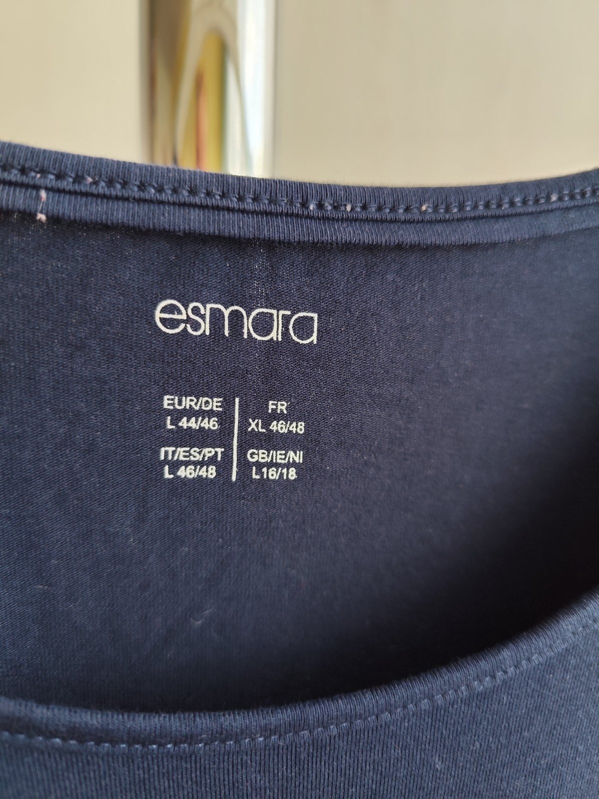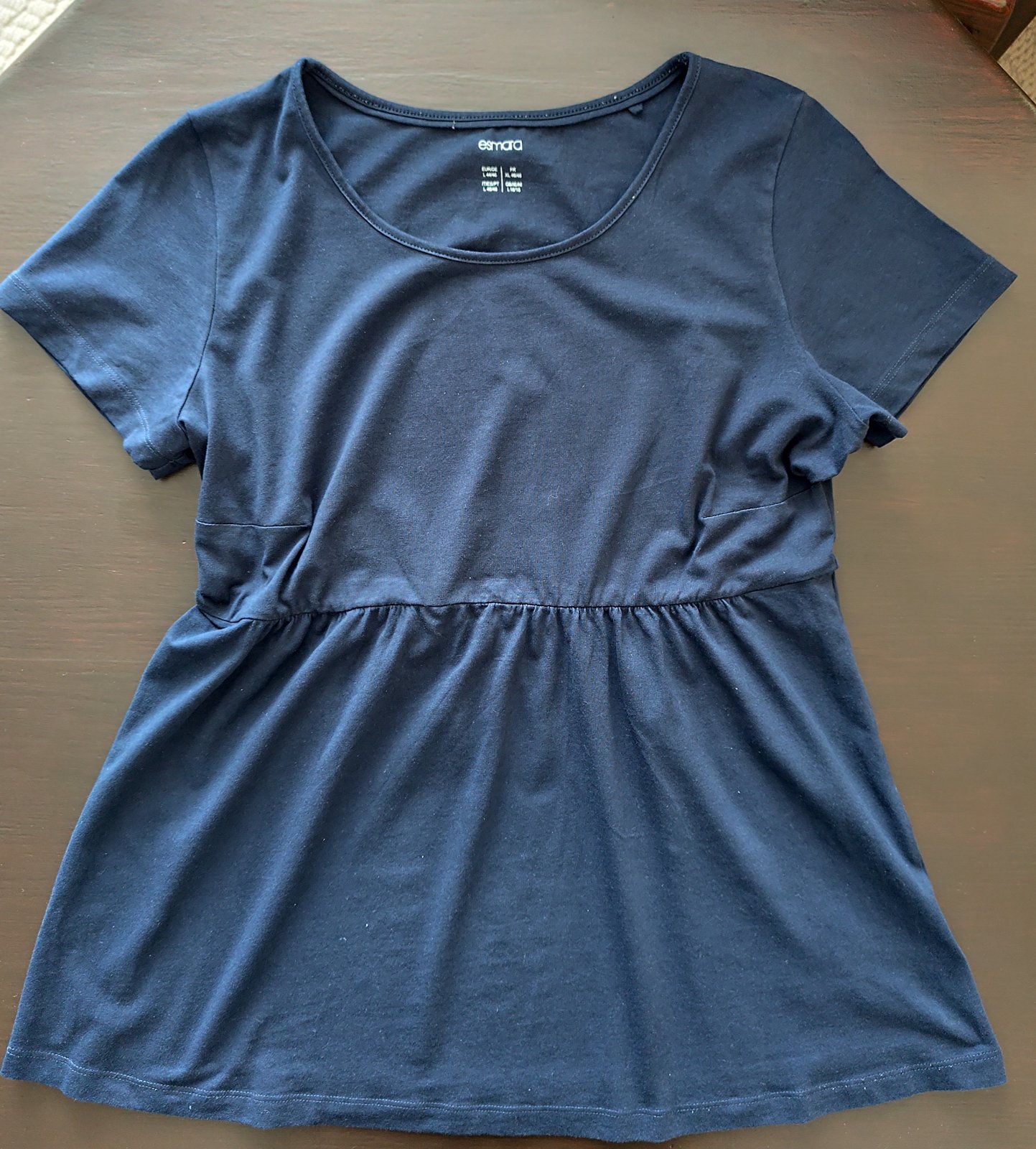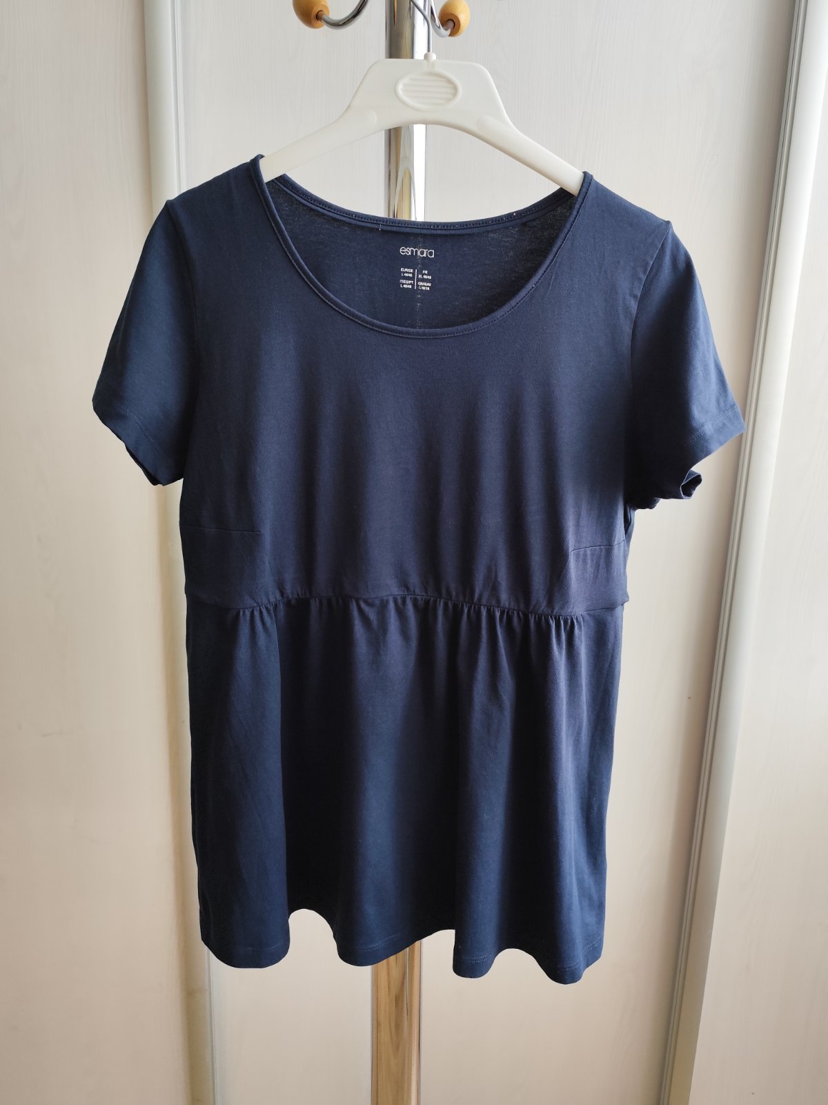 Tenké, veľmi príjemné tričko označené č. 44/46, vo výbornom stave. Elastické, cez prsia 2 x 47 cm (povolí o 2 x 7 cm), dĺžka 71 cm. Pod prsiami s prestrihom, mierne do "A". Zloženie: 95% bavlna + 5% elastan.