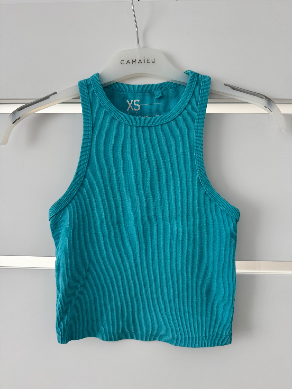dámsky elastický svetlo modrý top so zaväzovaním okolo krku, príjemný kvalitný materiál, zloženie: 90 % polyester, 10 % elastan, stav: výborný, málo nosený, značka: Amisu, uvádzaná veľkosť na štítk...