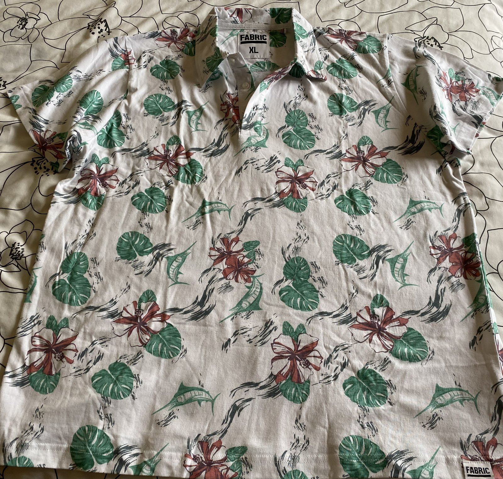 Bavlnená polokošeľa s potlačou FABRIC, písaná v. XL, dávam XXL - premerajte, materiál 100% bavlna, nenosená, iba opratá, nám veľká. Miery: dĺžka od krku dolu:73cm, šírka: 62cmx2 - ešte povolí.