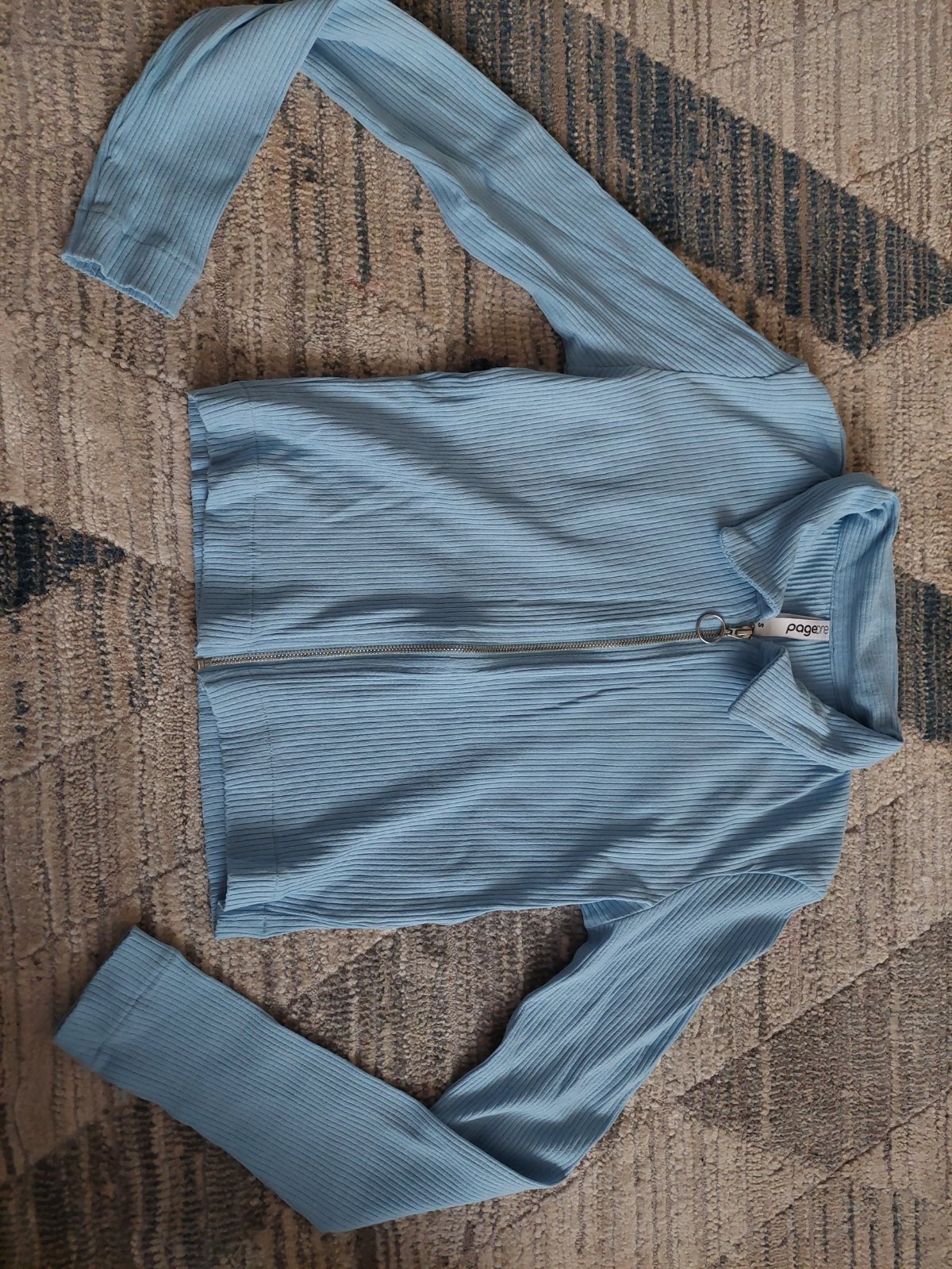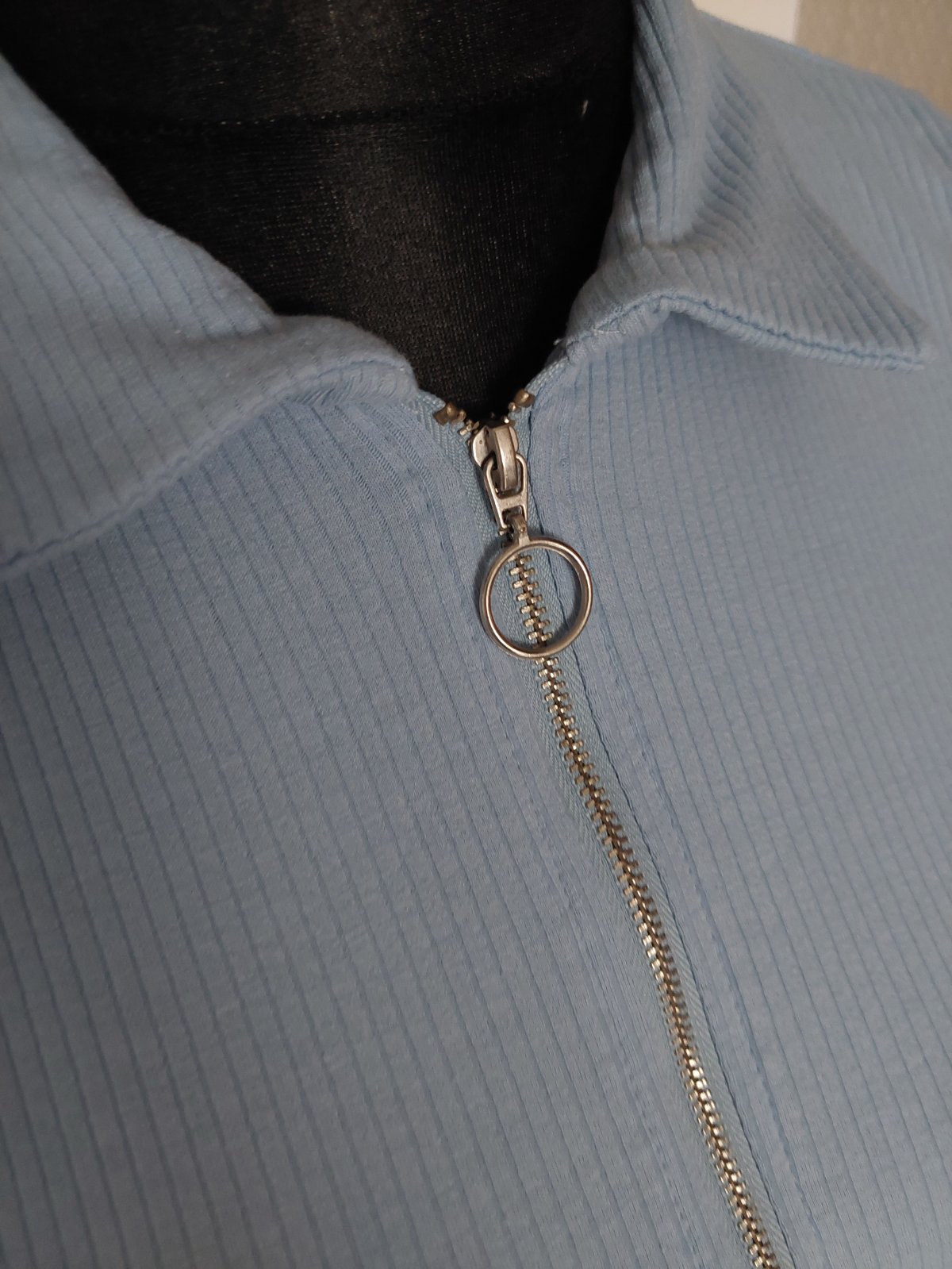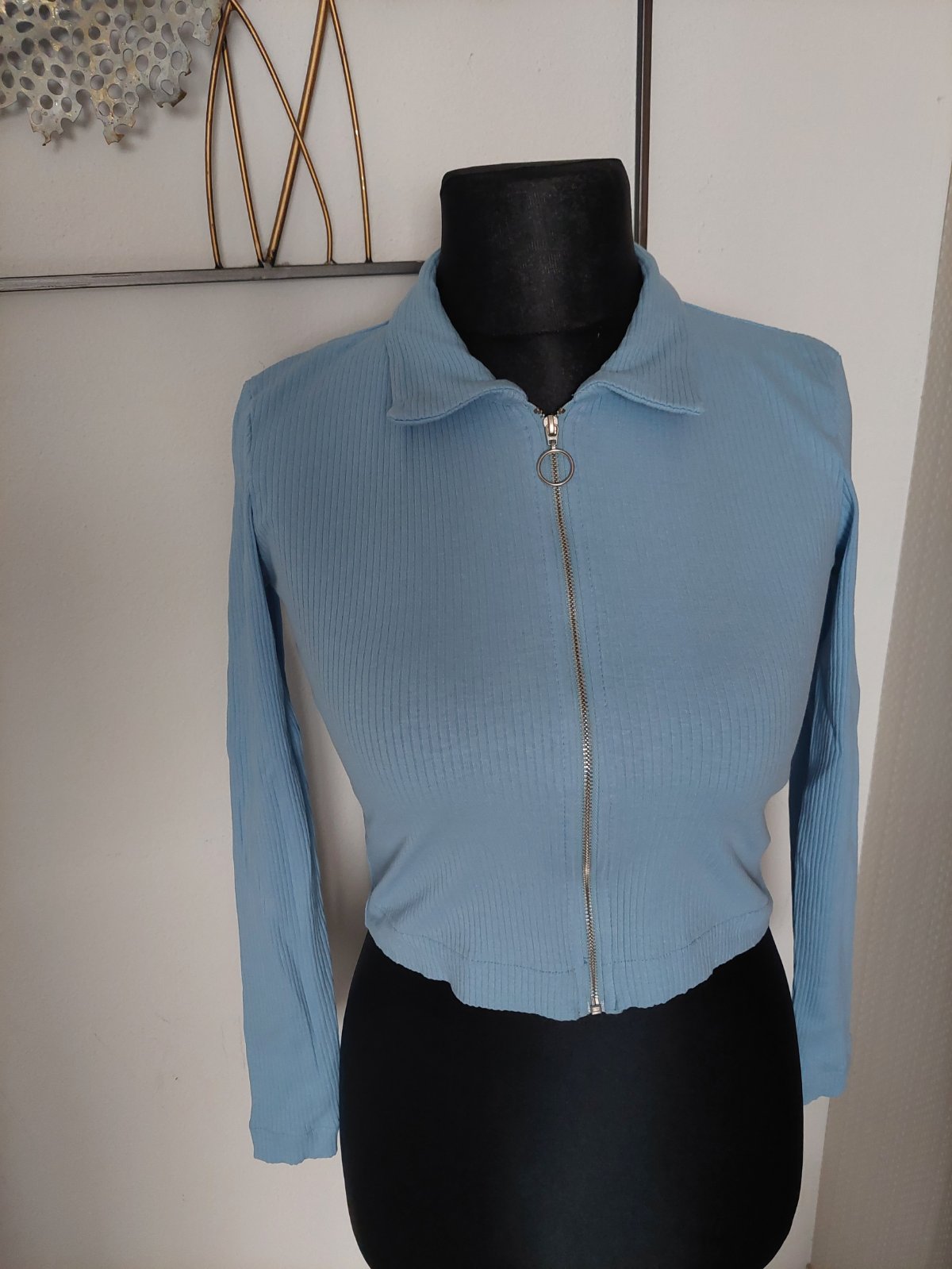 modry crop top, vrch je podšitý a spodok čo je volanik od šnórky je priesvitný rukavy tiež, spodok rukávov je rozšírený, nie je elastický