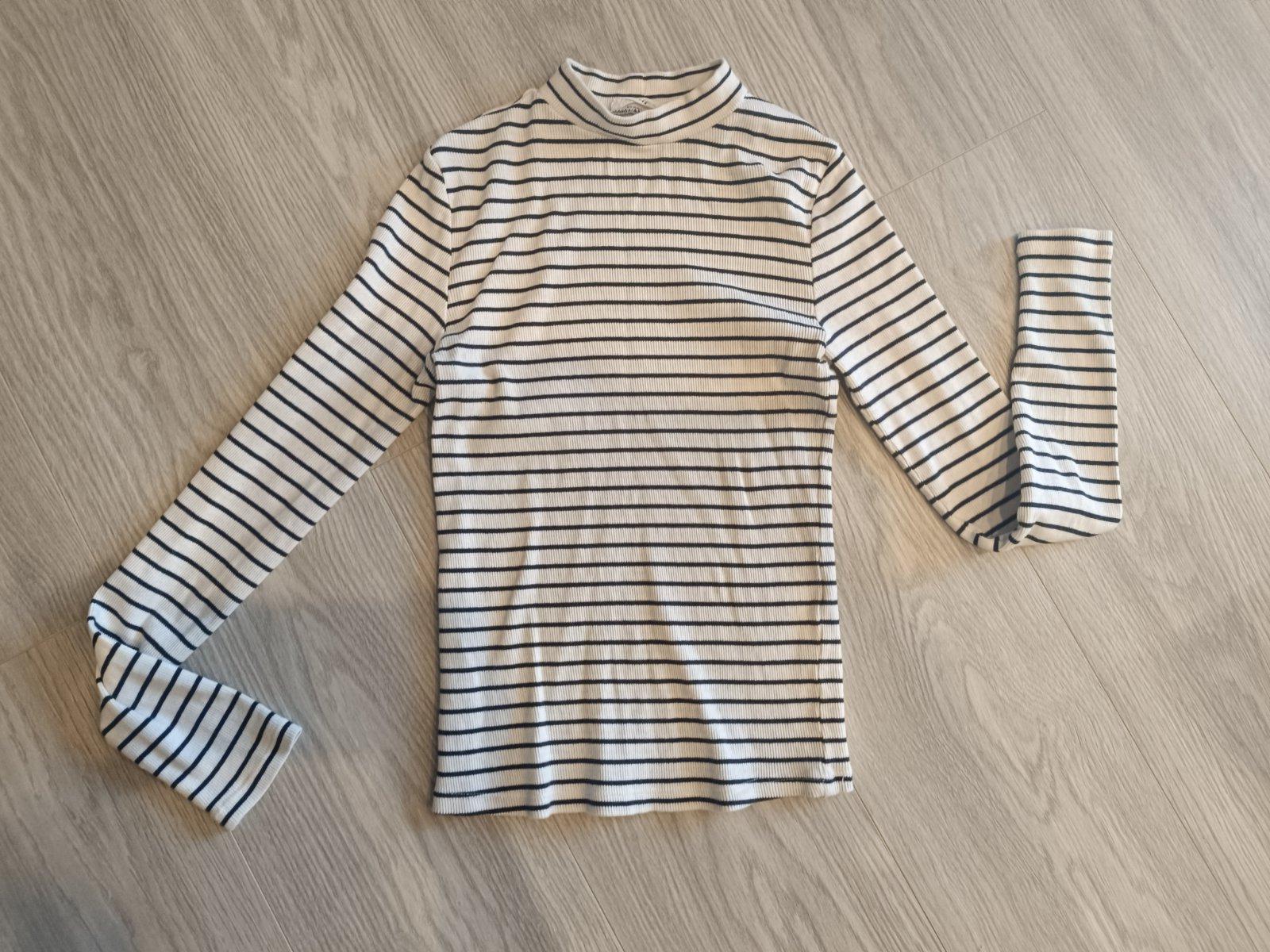 Moderný top pružný malo nosené bez poskodenia,dĺžka trupu 30cm,s rukávmi cca 40cm,šírka pod pazuchami v kľude 32x2cm povolí dosť ,rukáv 47cm.pisu v.m sadne od XS po M.