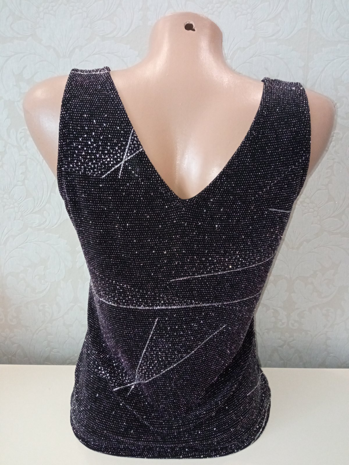 Čierno-strieborný elegantný trblietavý top s hlbokým výstrihom.