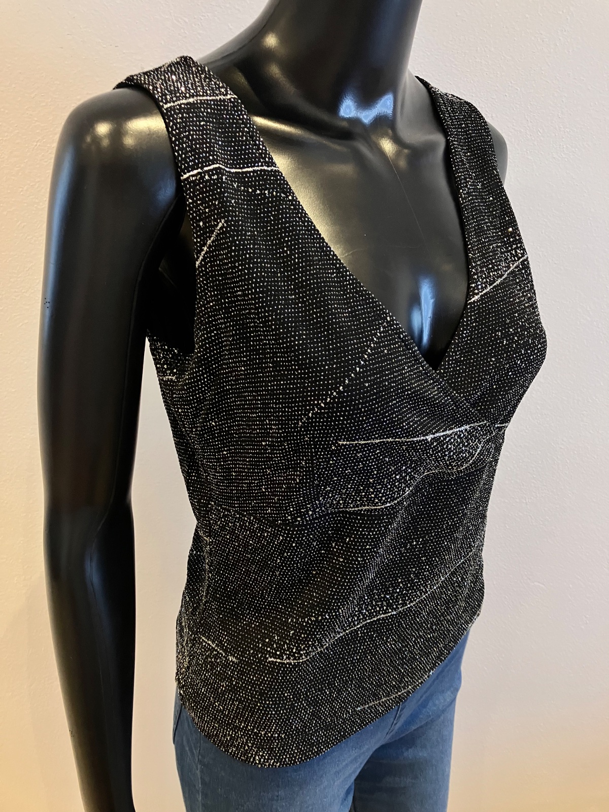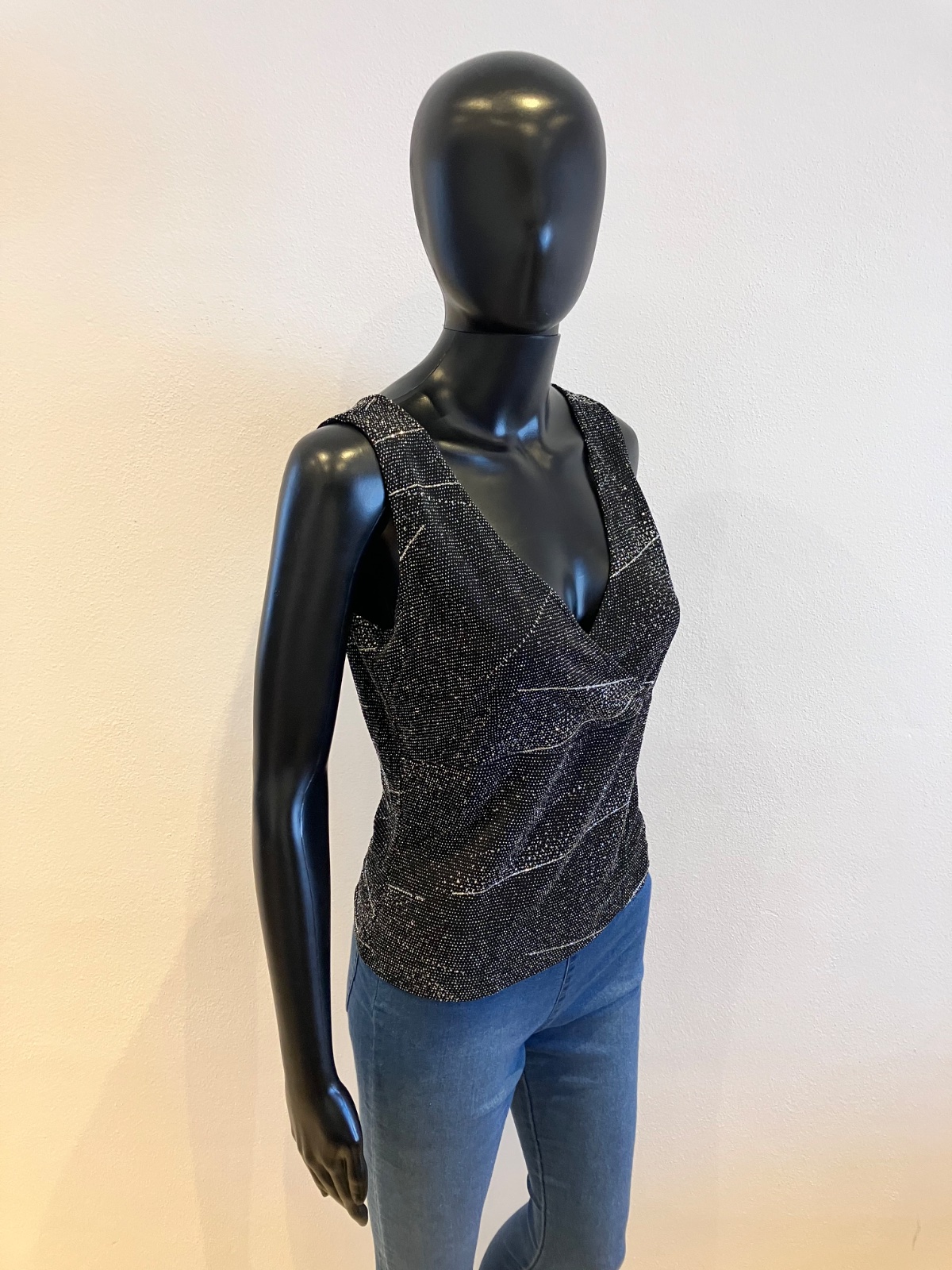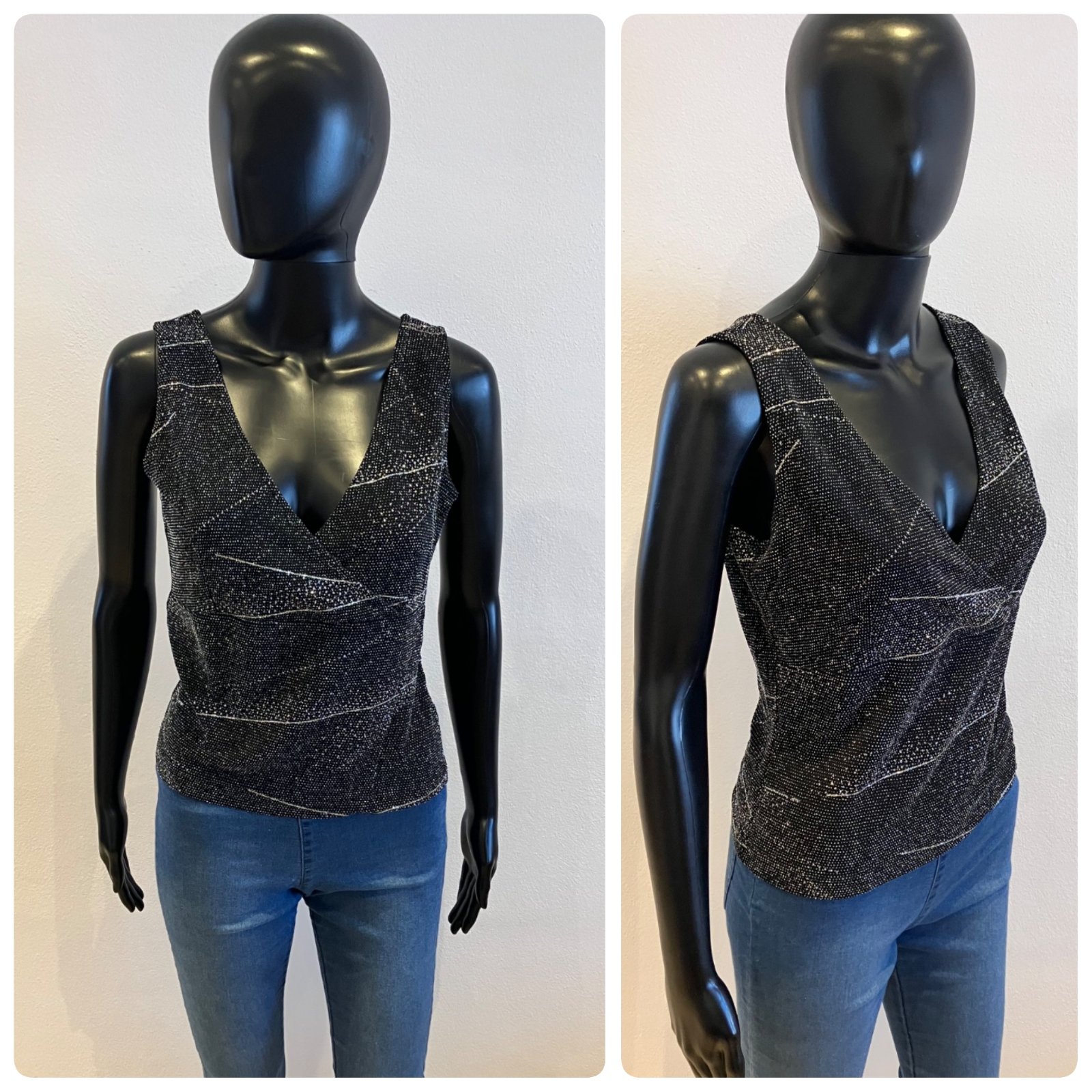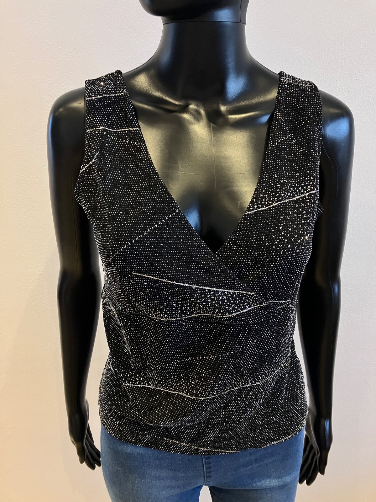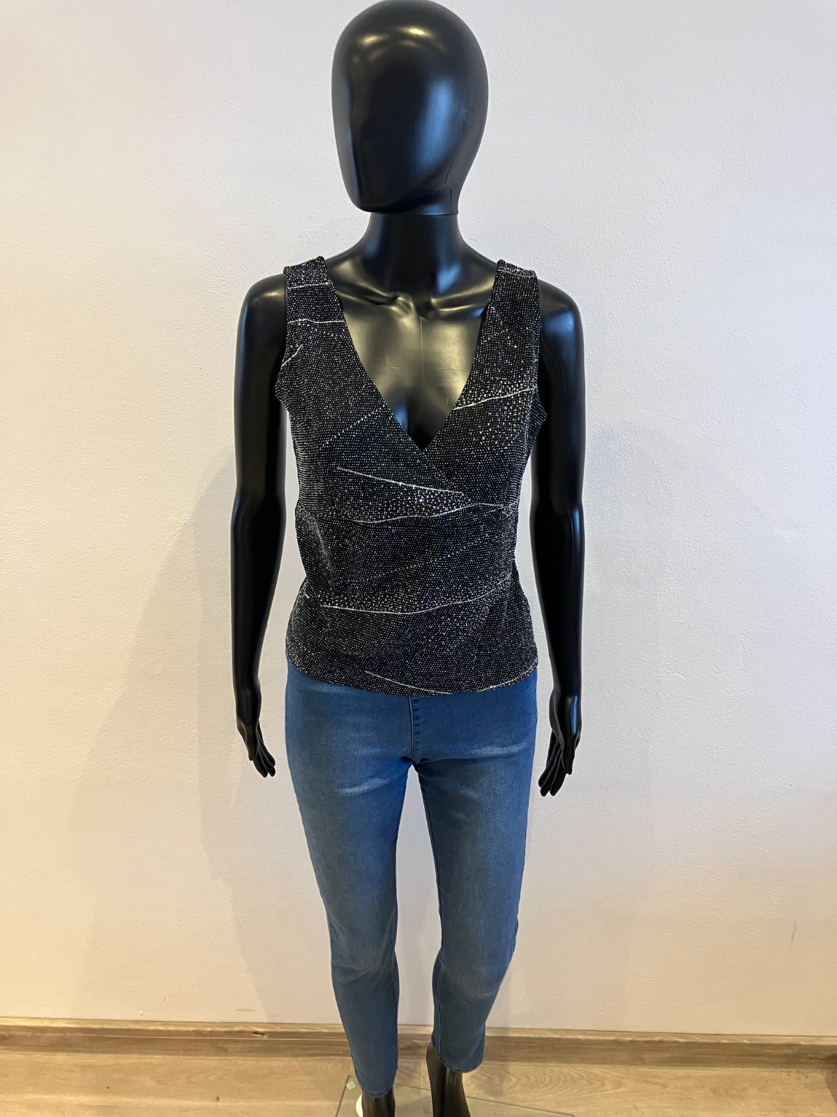 Dámsky čierno-strieborný elegantný trblietavý top s hlbokým výstrihom. Elastický. Materiál 100%polyester.
