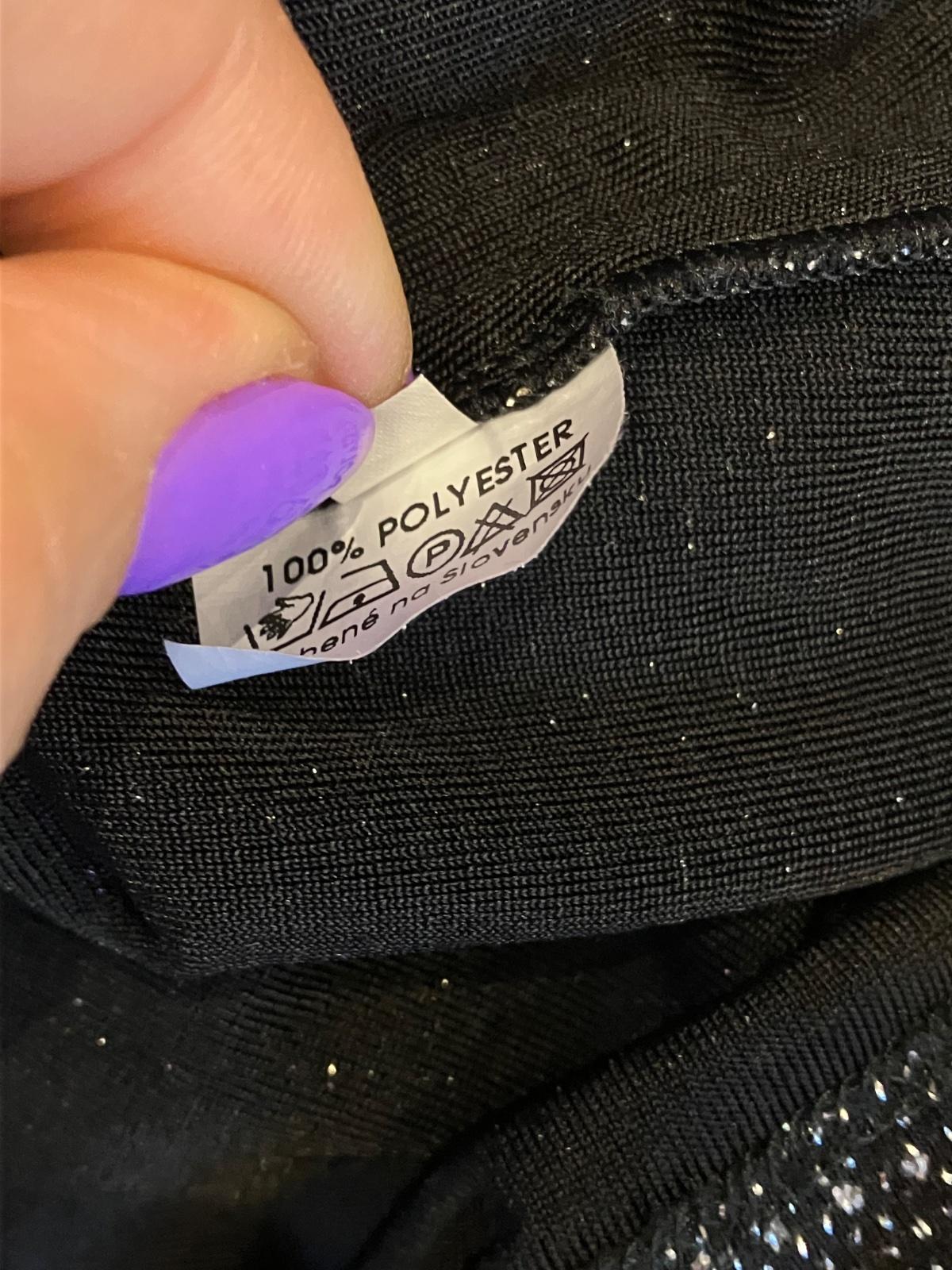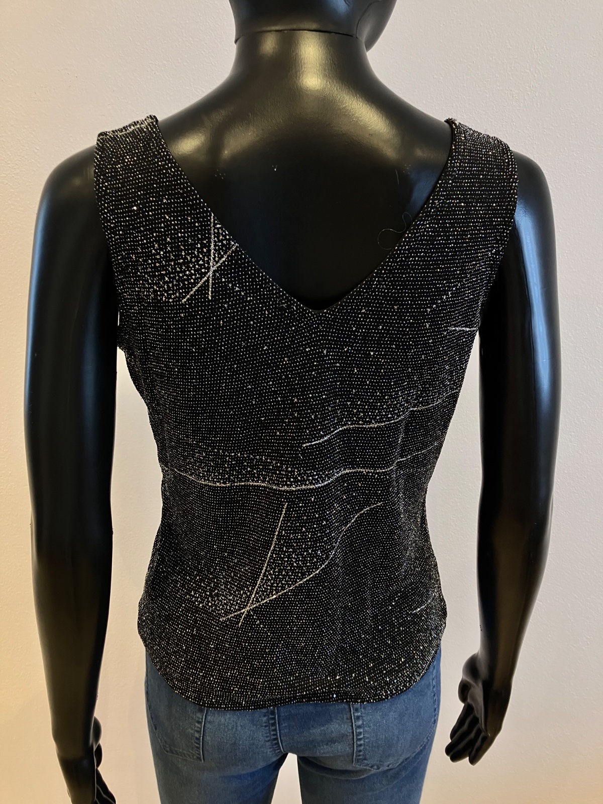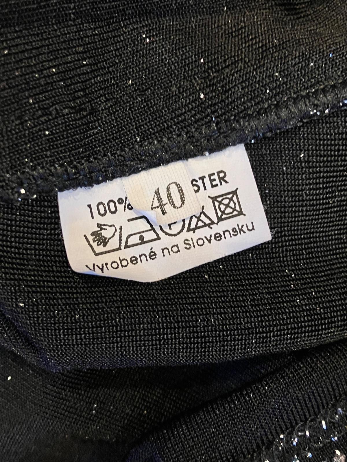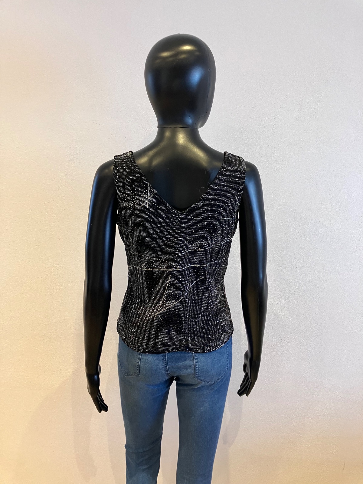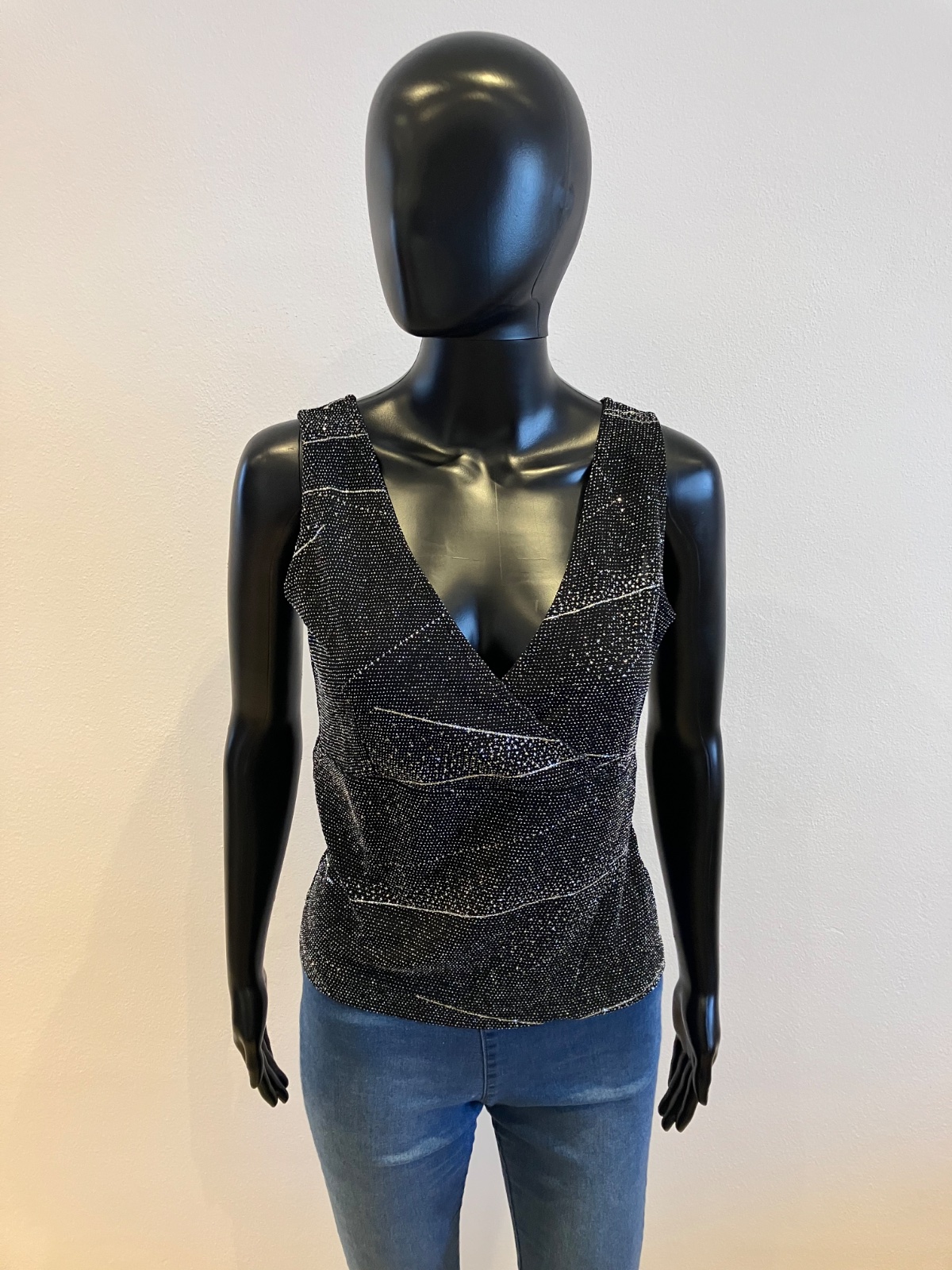 Dámsky čierno-strieborný elegantný trblietavý top s hlbokým výstrihom. Elastický. Materiál 100%polyester.