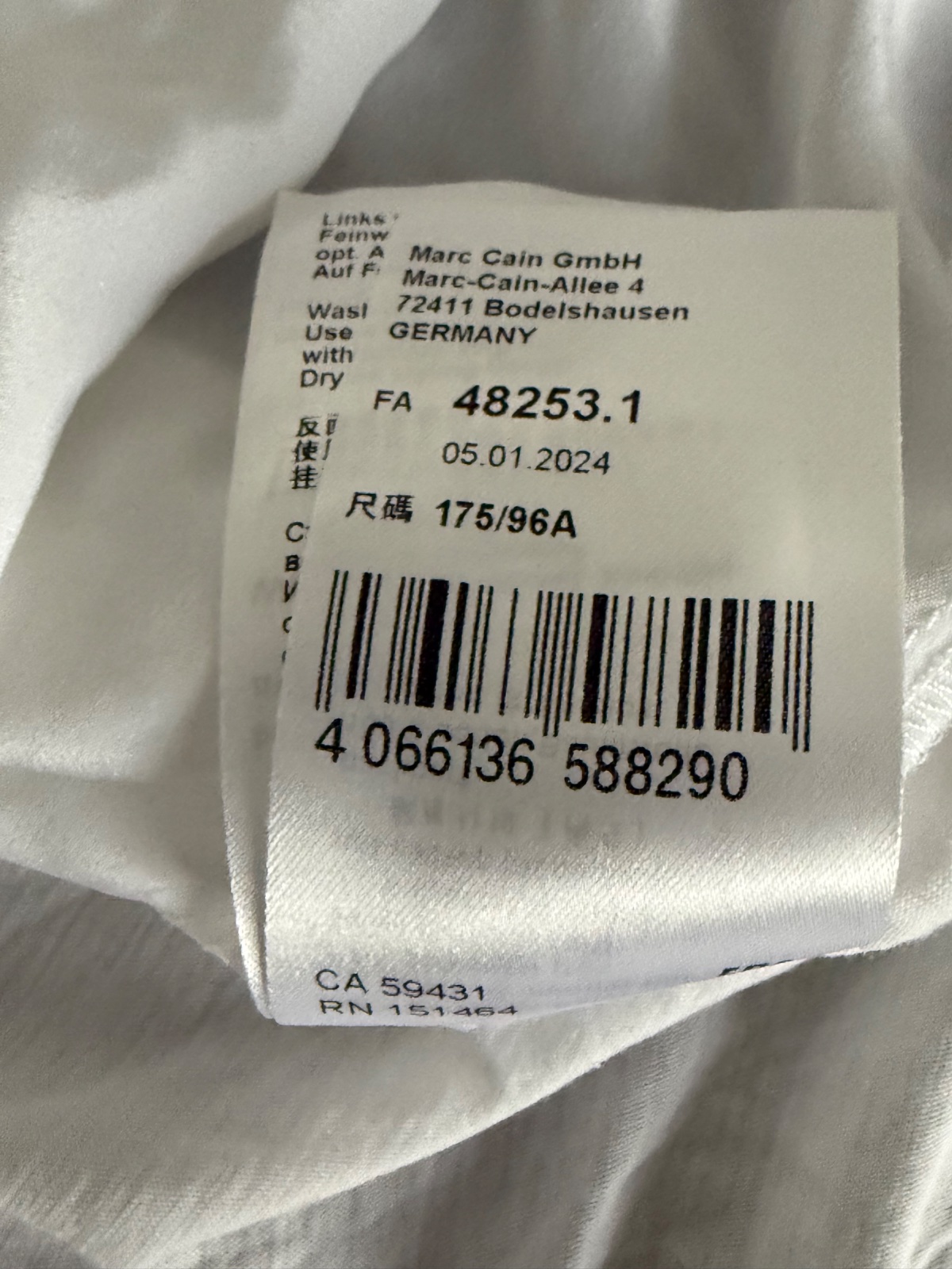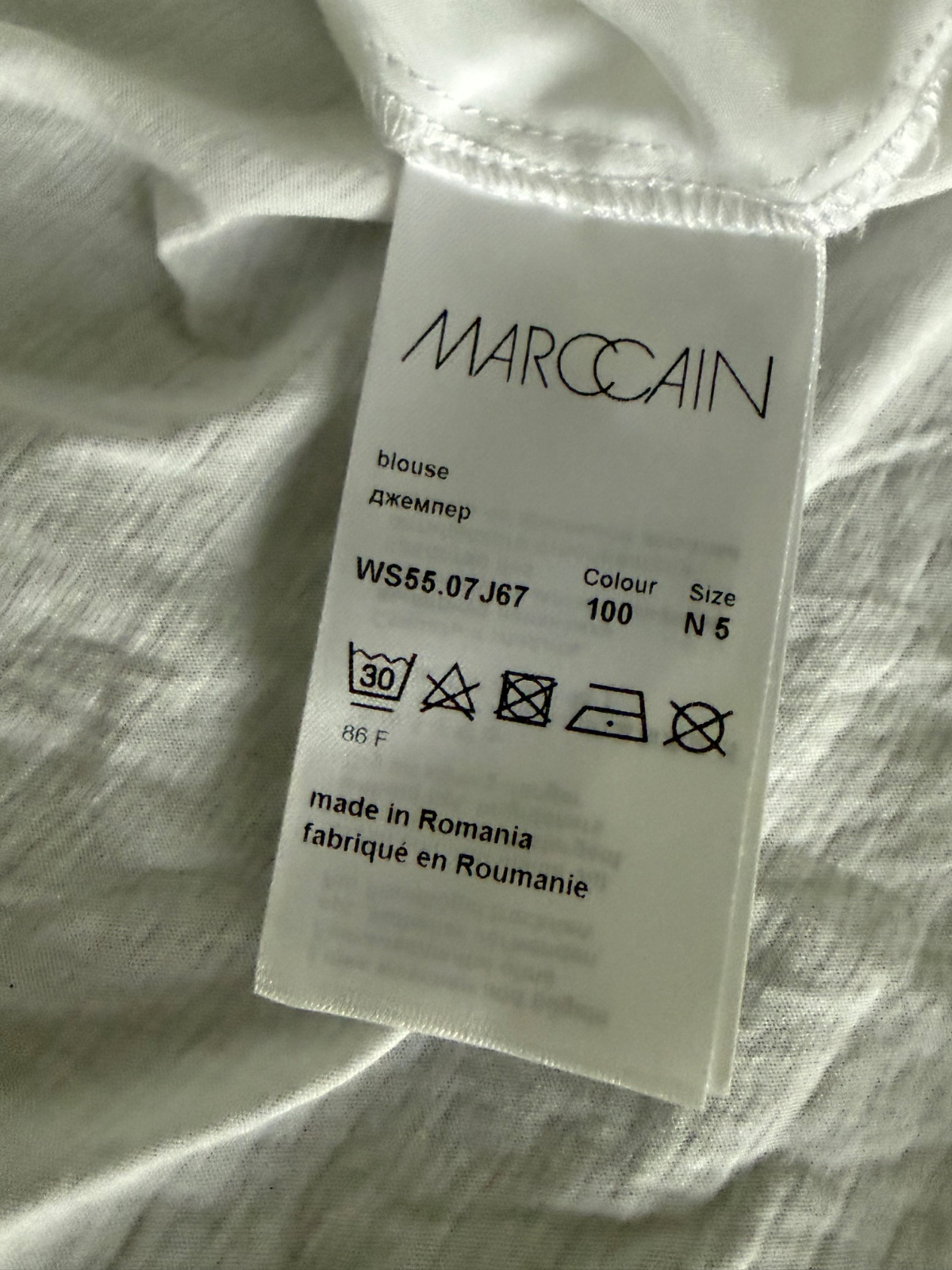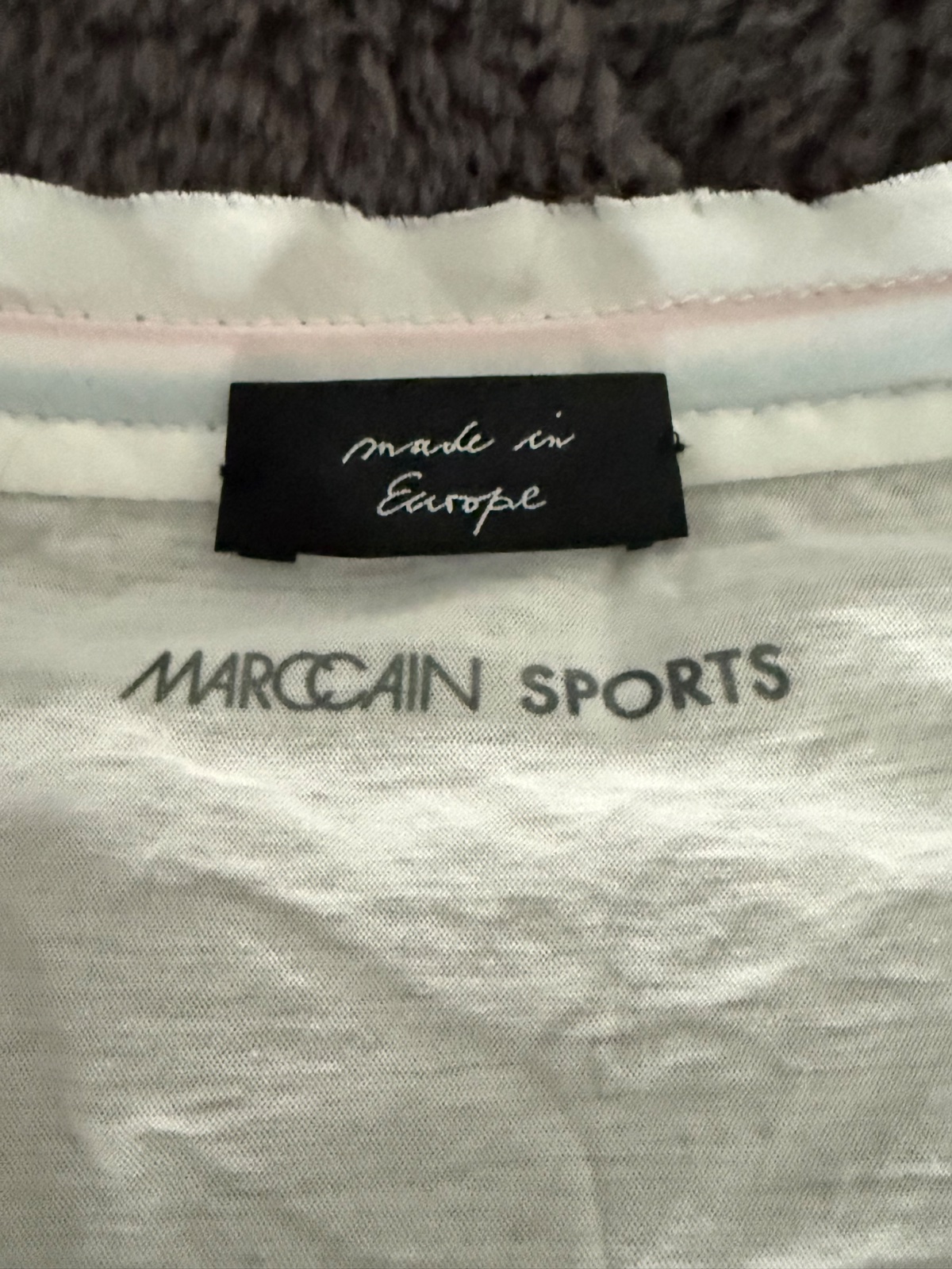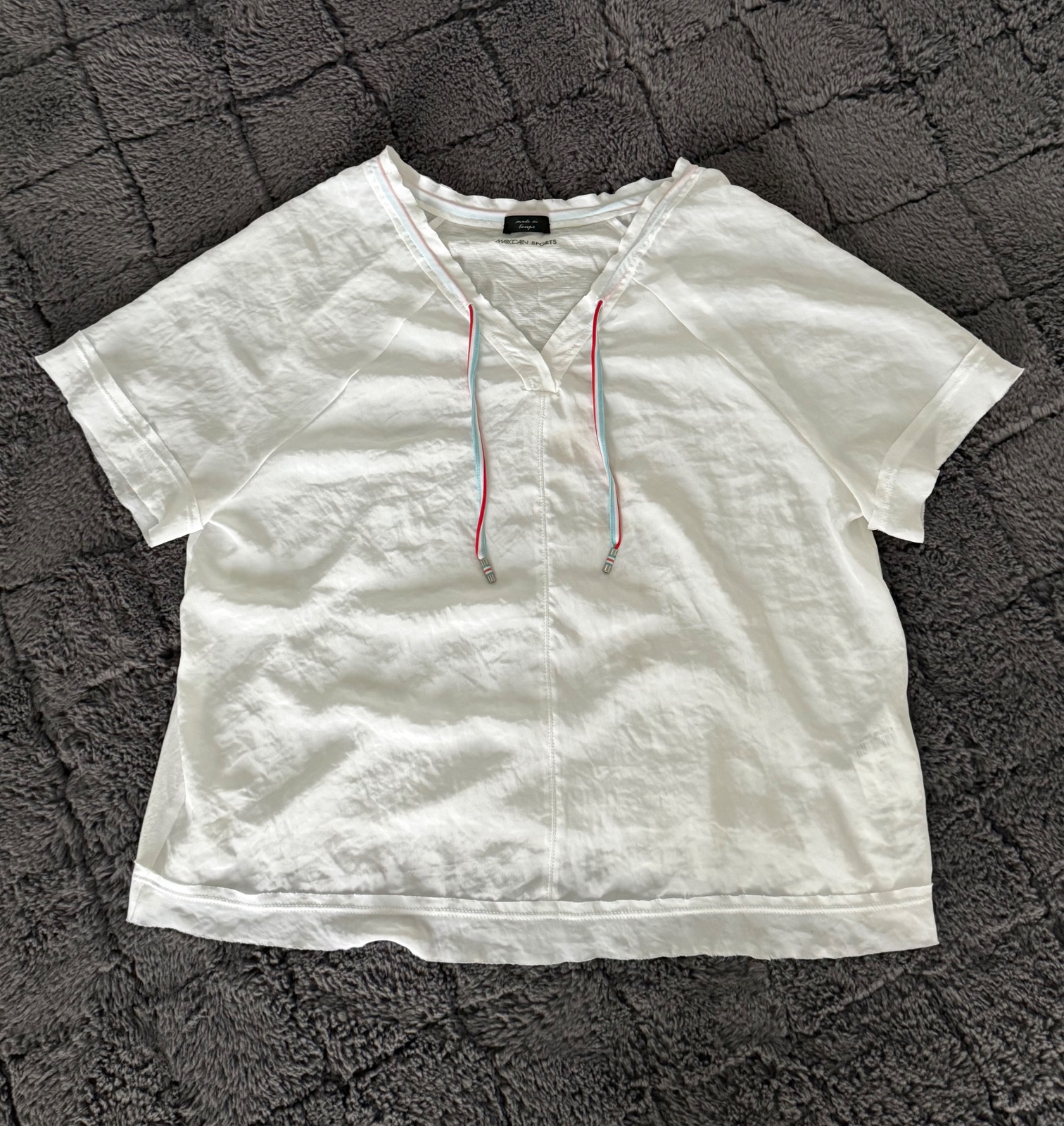 Krásne lahučké tričko Marc Cain. Kombinácia dvoch látok. Predný diel aho hodváb, zadná ako tričko. Biela farba, kontrastná farebná šnúrka. Velkosť 5, sedí XL. Ako nové.