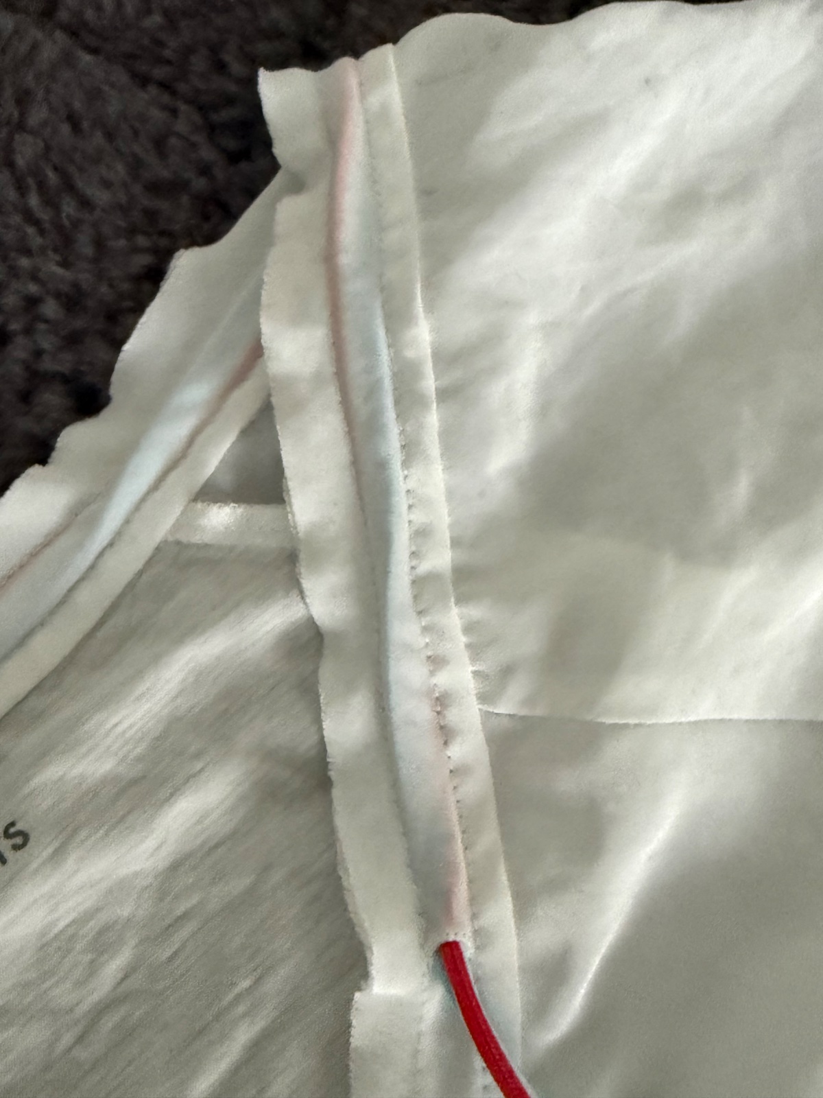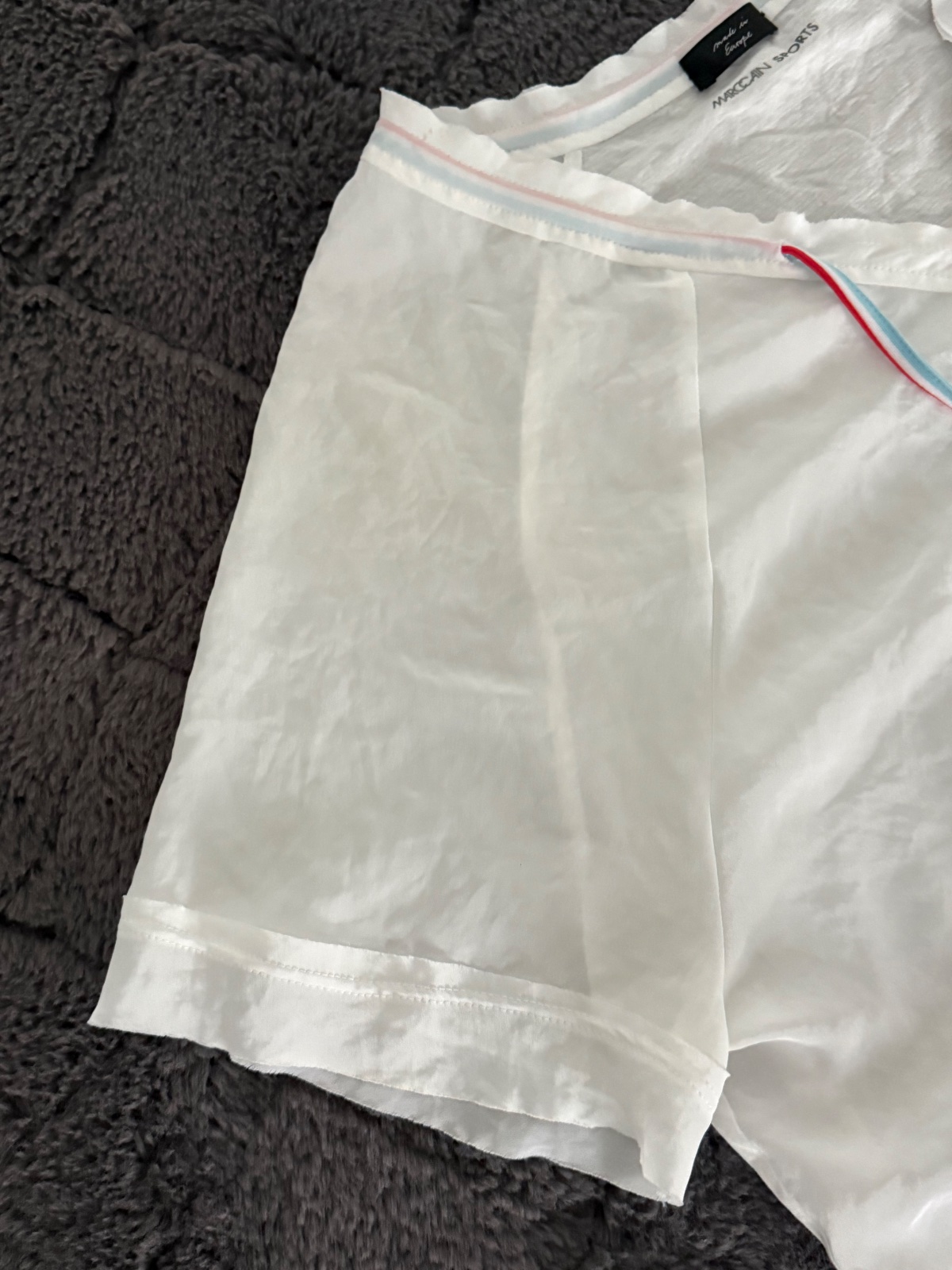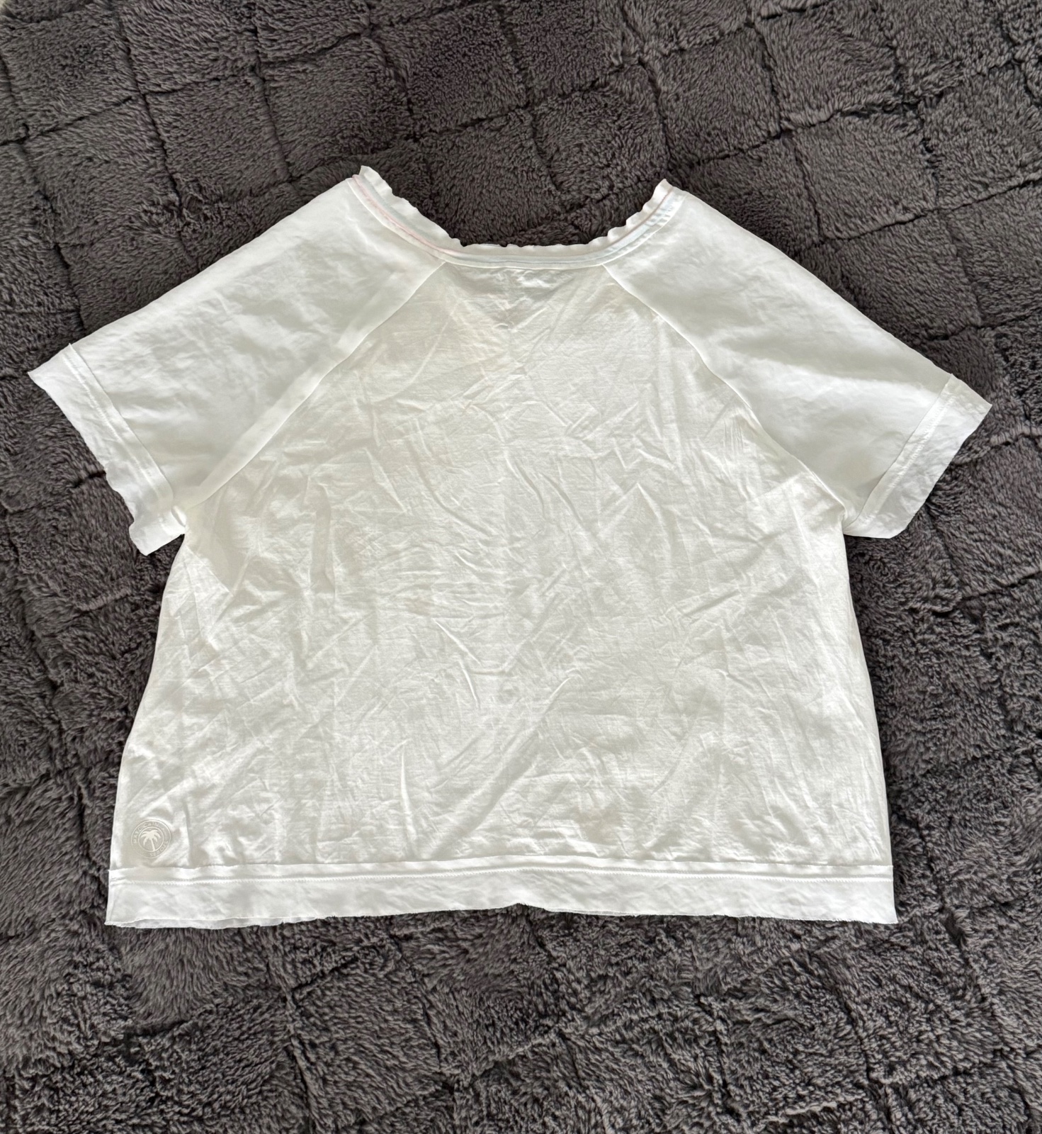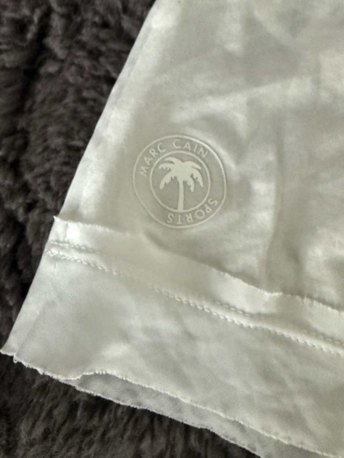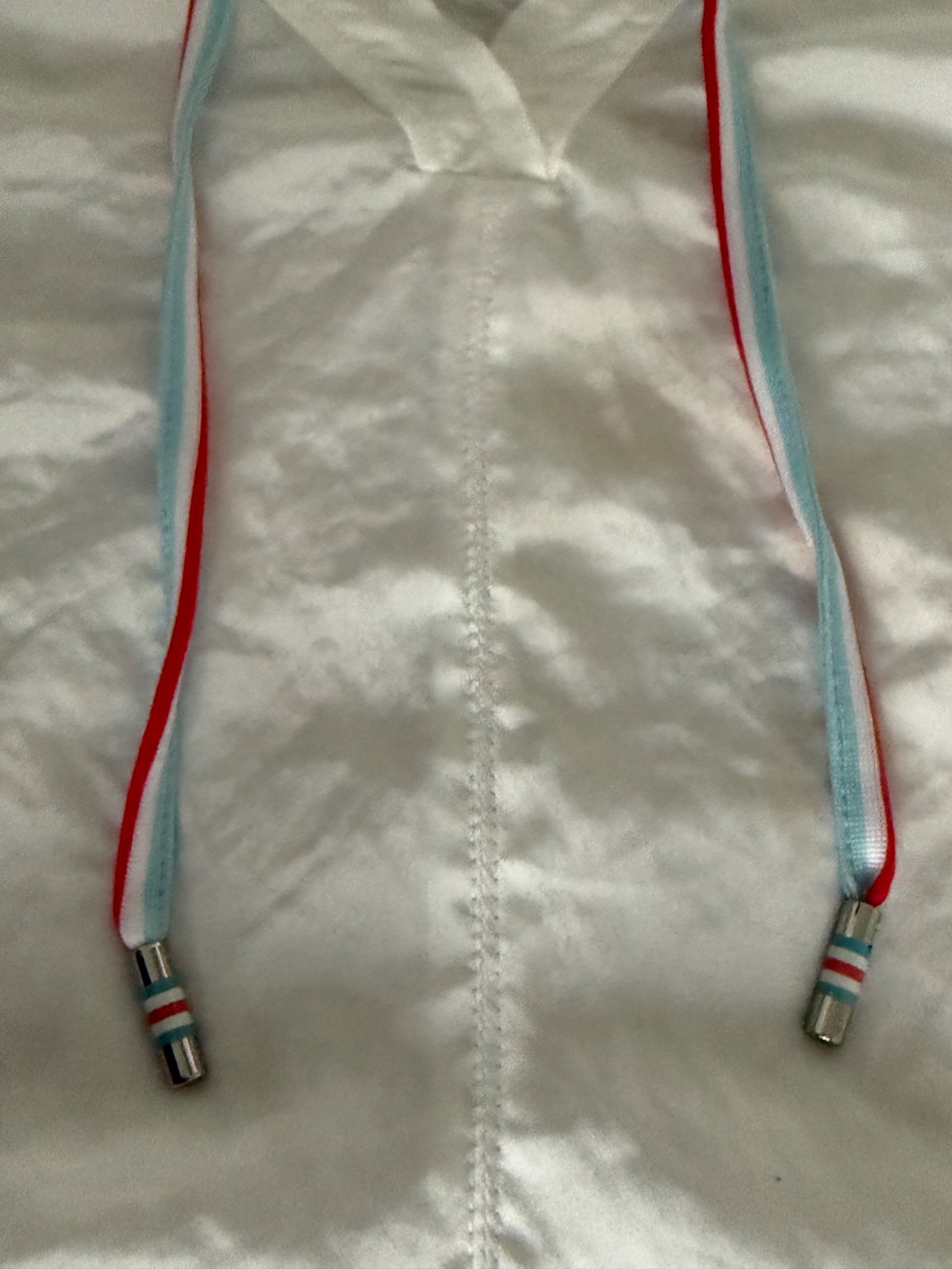 Krásne lahučké tričko Marc Cain. Kombinácia dvoch látok. Predný diel aho hodváb, zadná ako tričko. Biela farba, kontrastná farebná šnúrka. Velkosť 5, sedí XL. Ako nové.