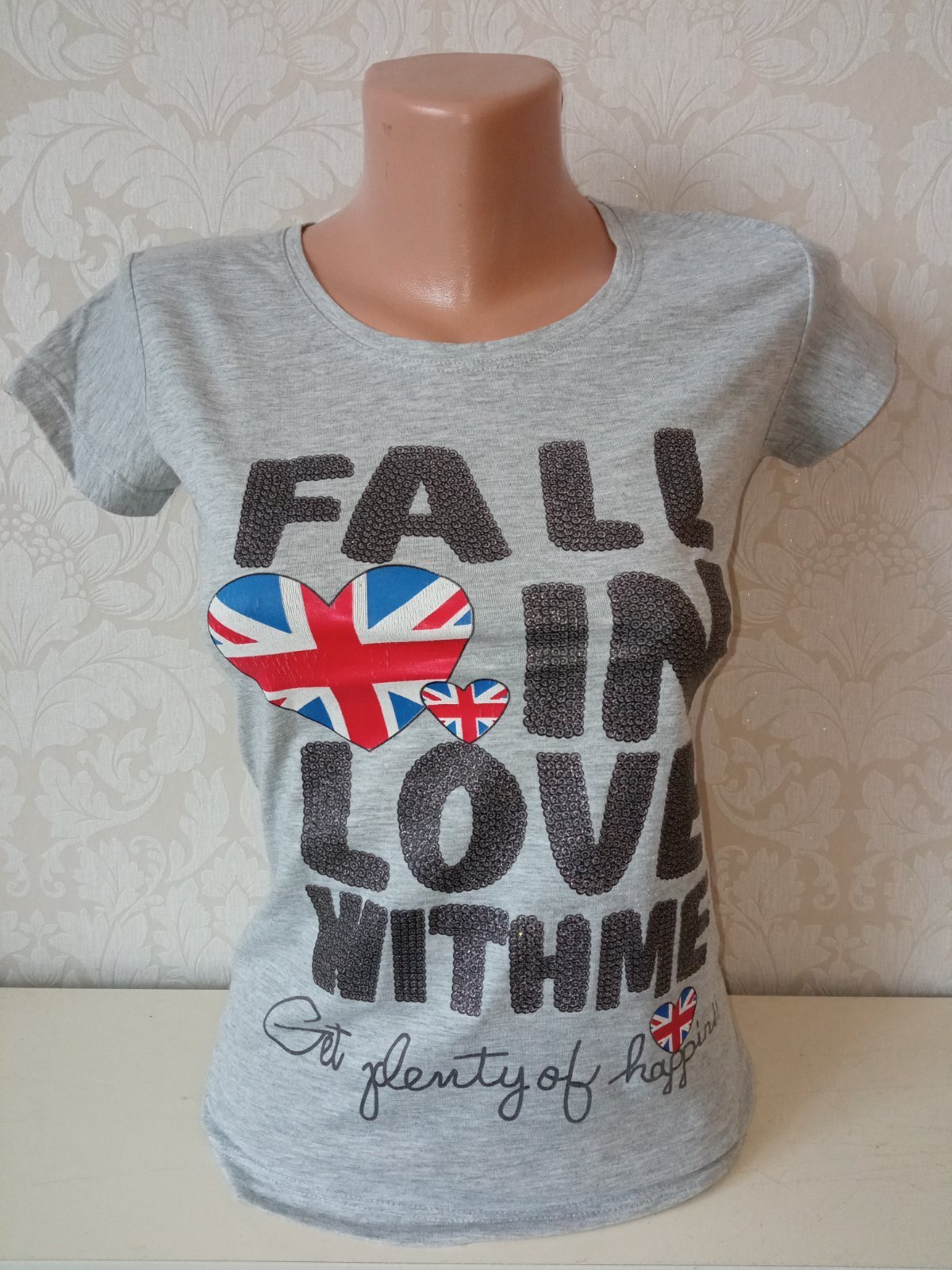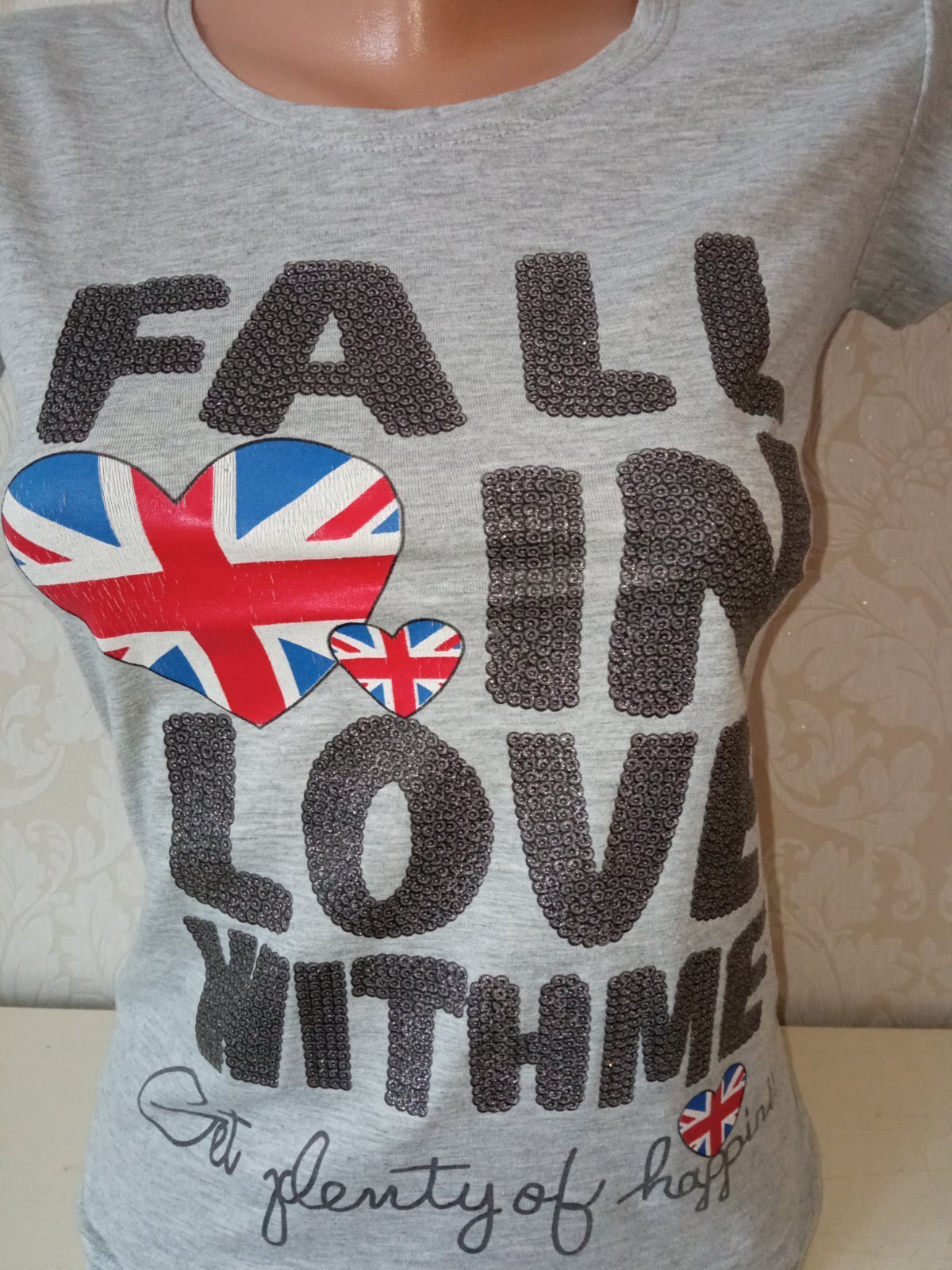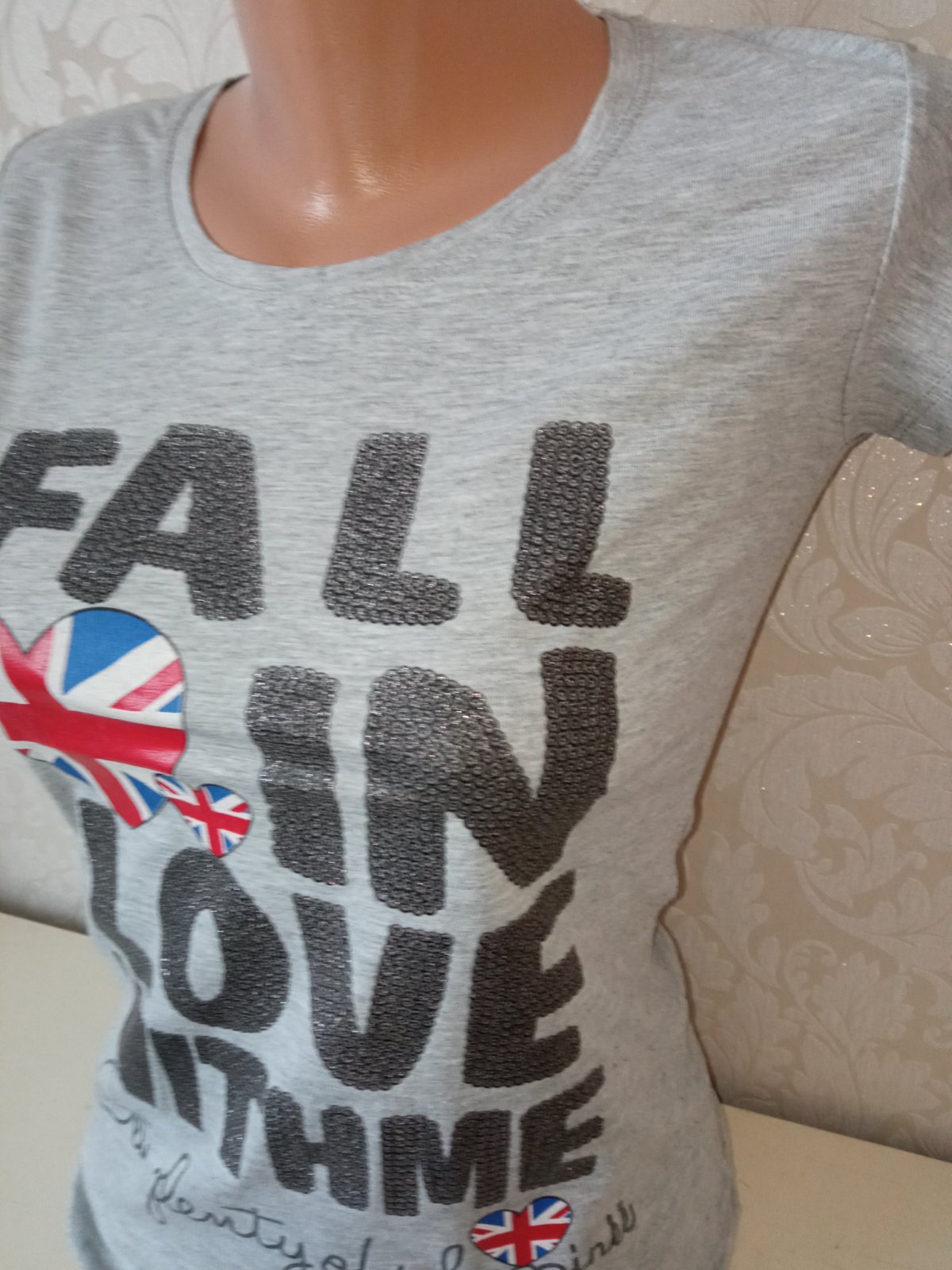 Dievčenské tričko s krátkym rukávom, okrúhly výstrih, potlač, trblietavý nápis, jemne elastické, veľkosť cca 158.