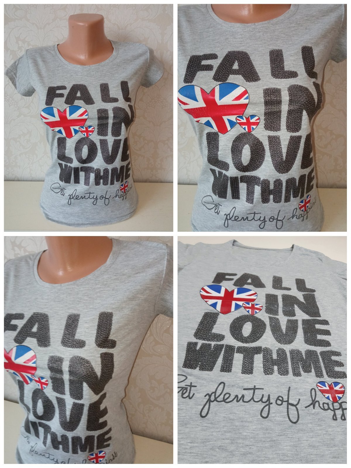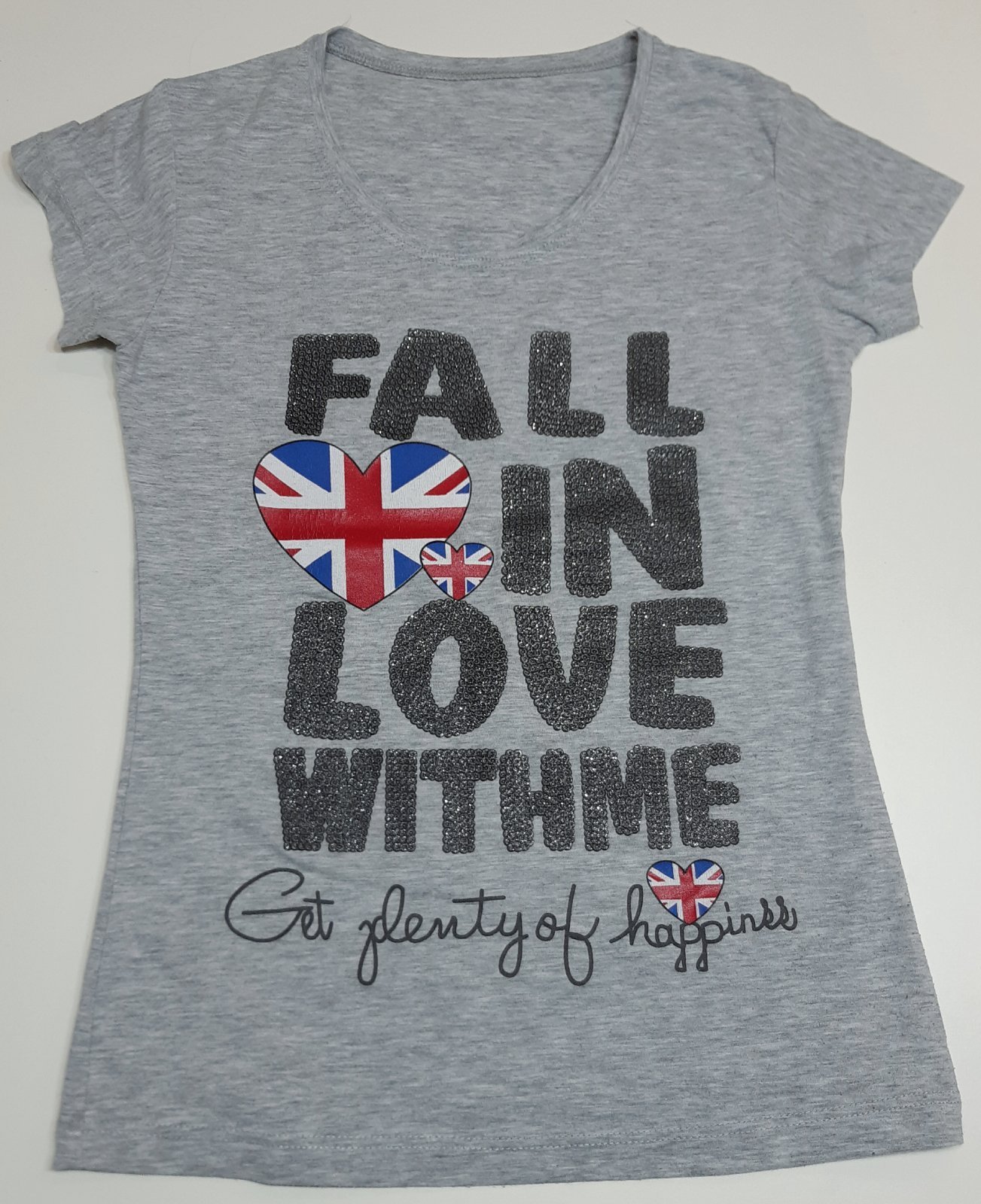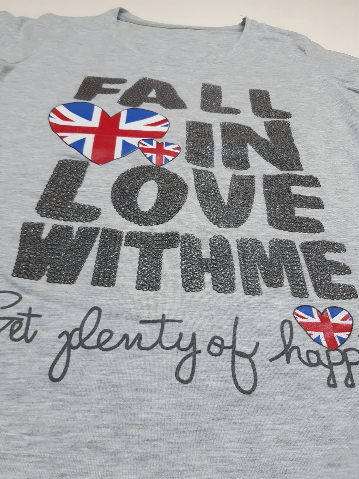 Dievčenské tričko s krátkym rukávom, okrúhly výstrih, potlač, trblietavý nápis, jemne elastické, veľkosť cca 158.