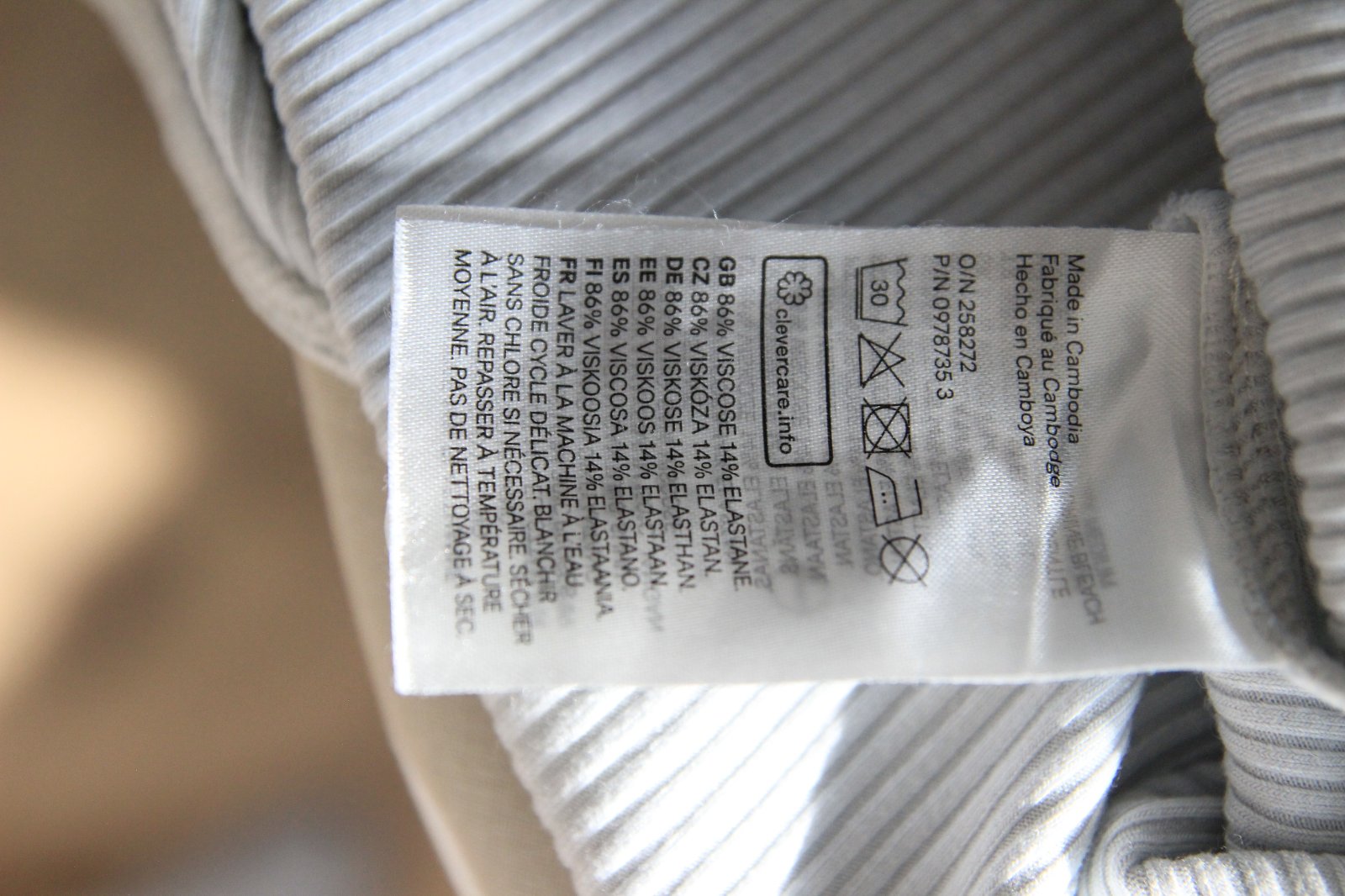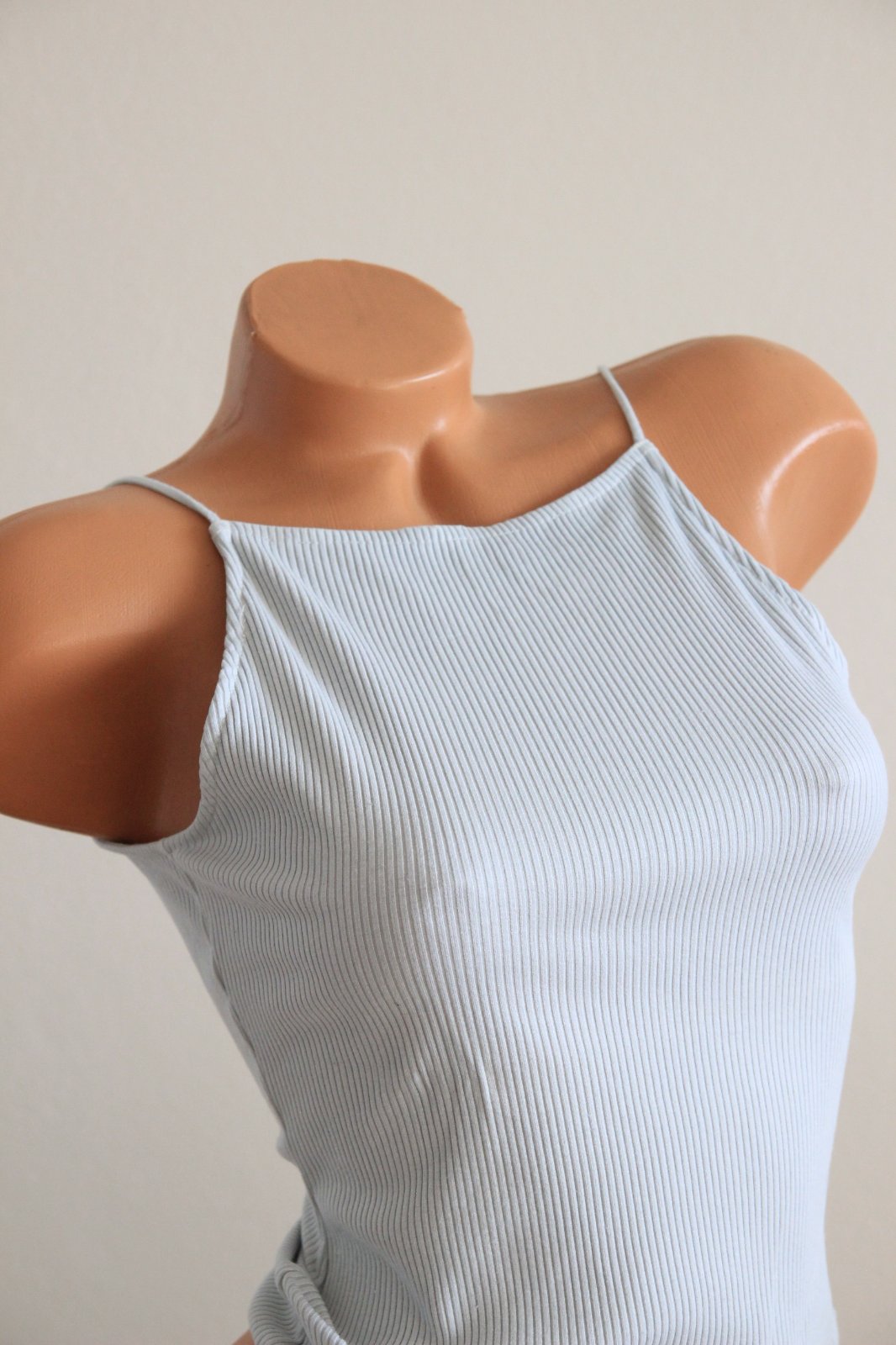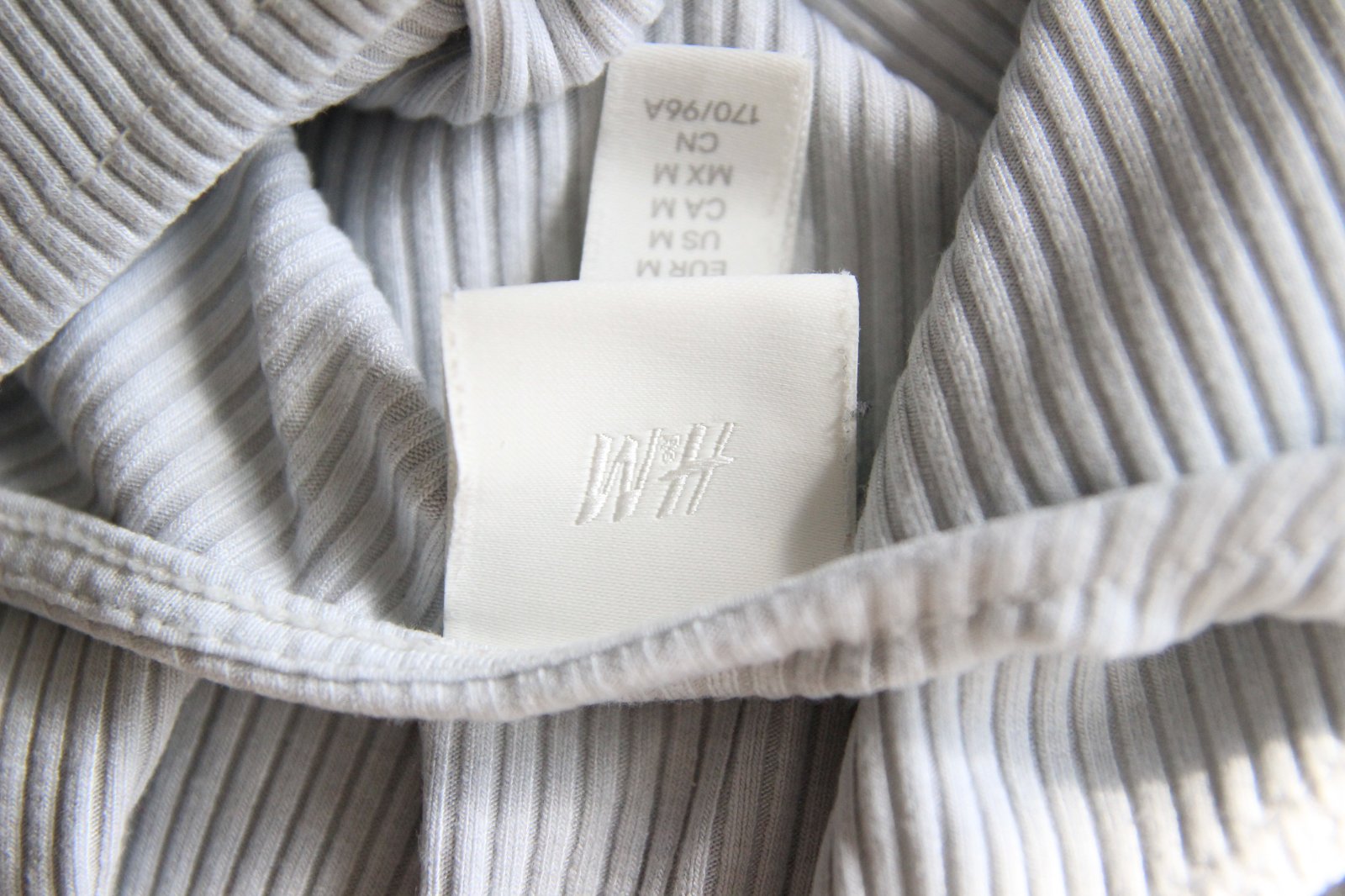 Bledo šedý body top s výstrihom na chrbte, veľkosť M, značka H&M, materiál je 86% viskóza a 14% elastan. Látka ma rebrovanú štruktúru.