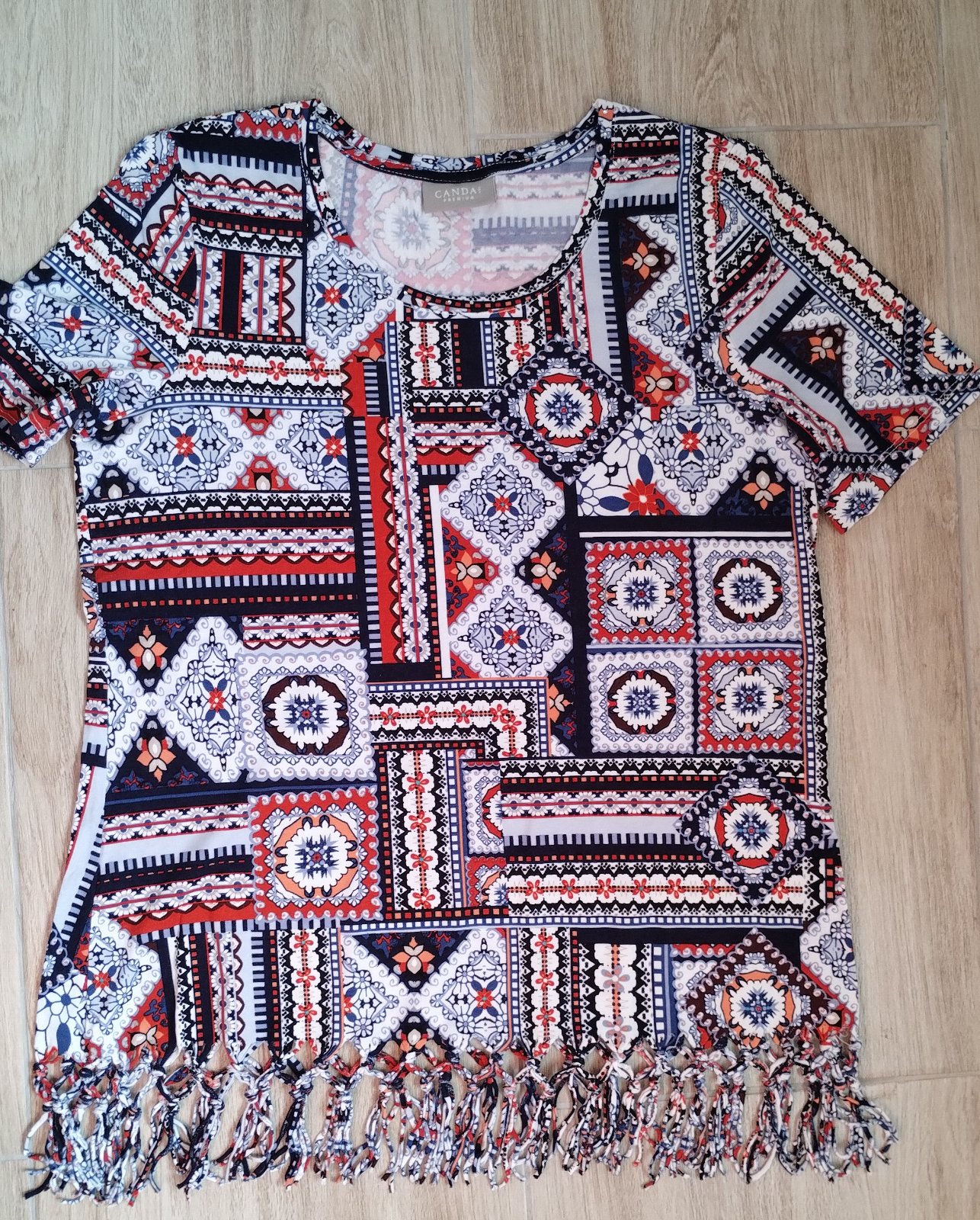 materiál 95% viskóza, 5% elastan, šírka pod pazuchami 49cm v kľude (elastické) , celková dĺžka 62cm (po koniec strapcov)