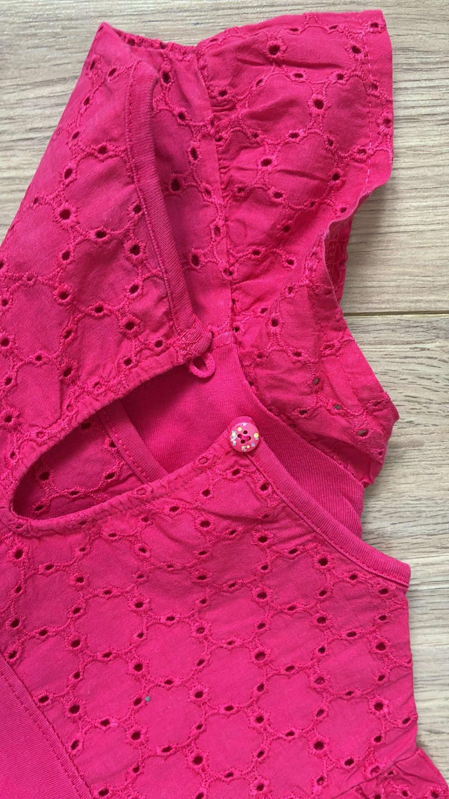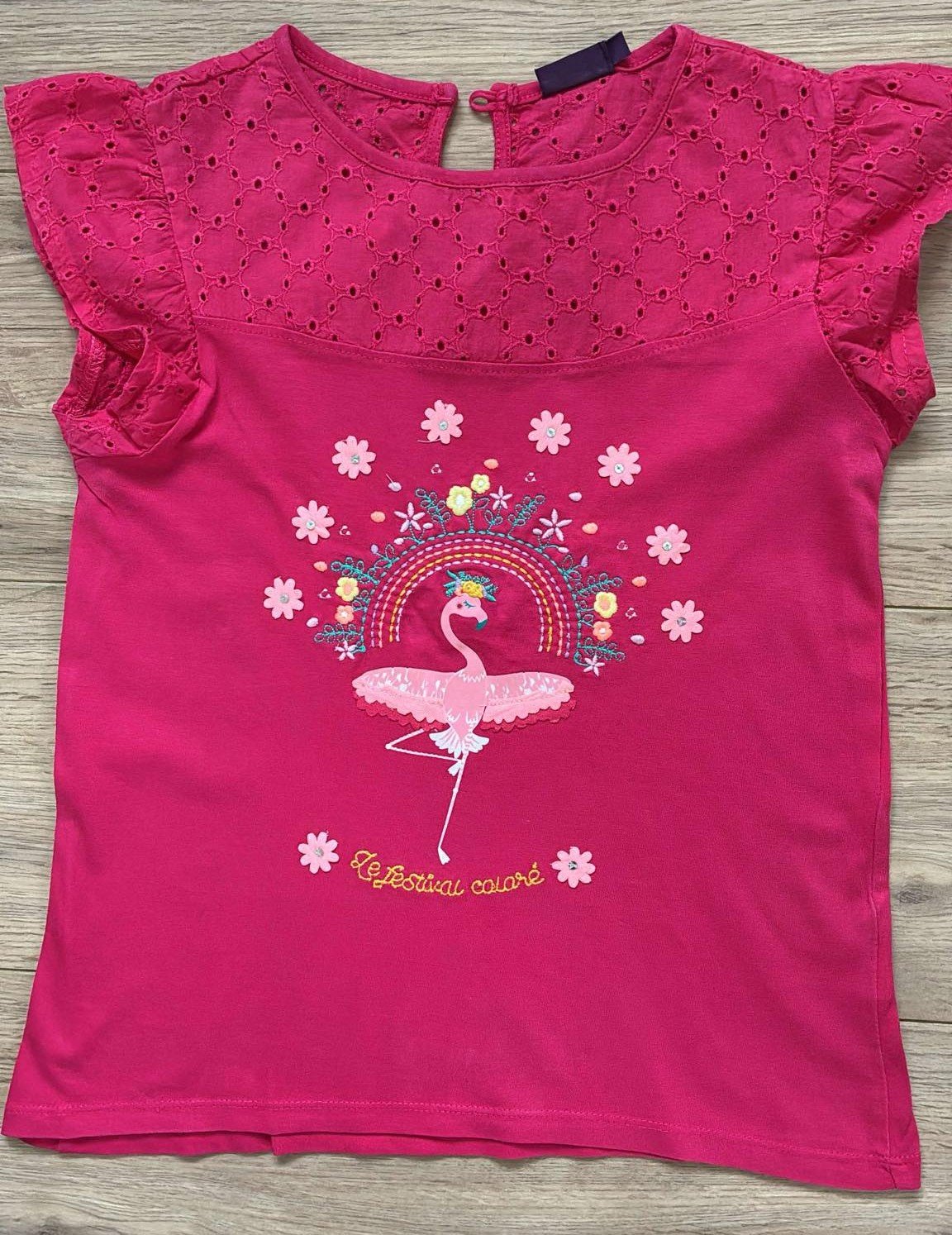 Predám sýtoružové tričko, má jemný dierkovaný vzor na rukávoch a sedielku (broderie anglaise) vpredu aj vzadu a detailnú aplikáciu plameniaka s vyšívaným kvetinovým motívom, zapínanie vzadu na 1 gombík, 100% bavlna, málo nosené d=50cm, š=37cm, top stav.