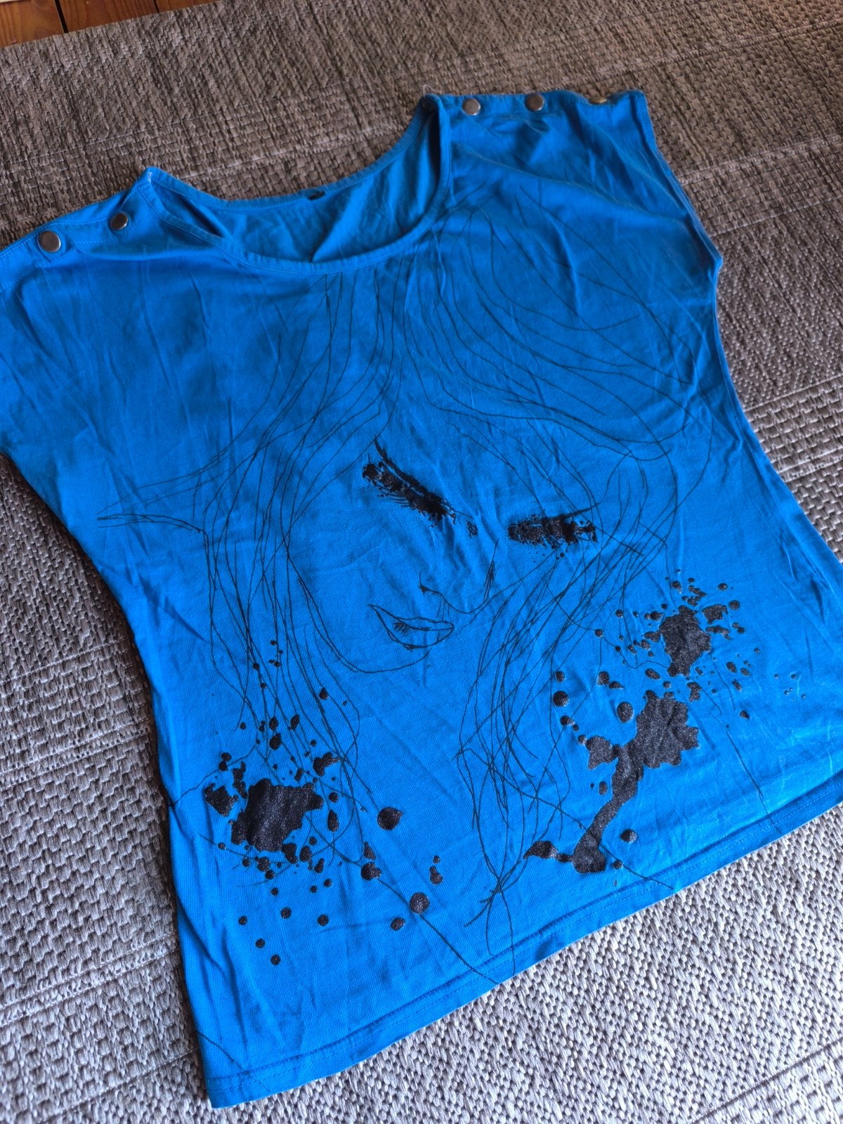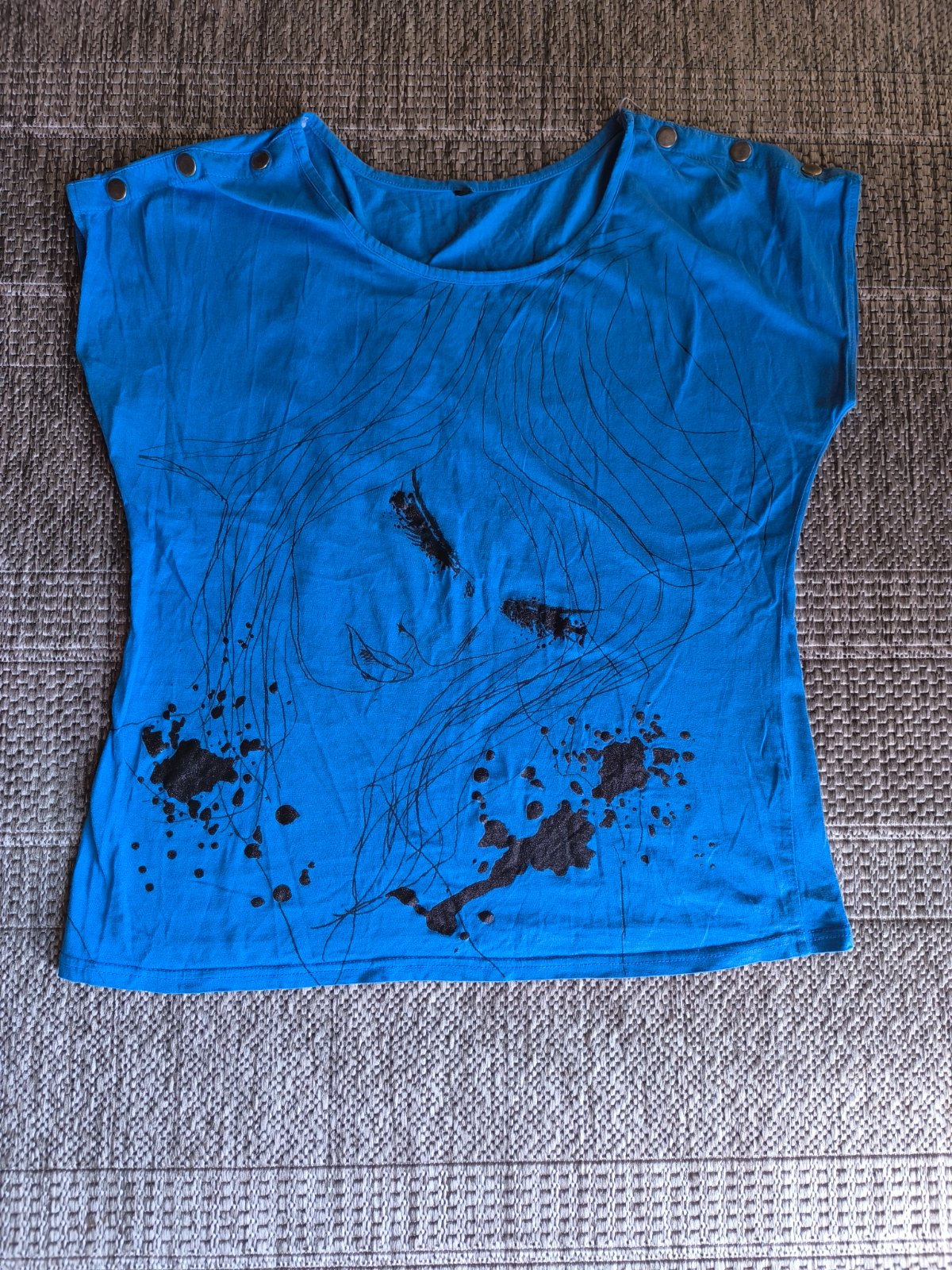 Bavlnený top, tričko v nádhernej sýtej kráľovskej modrej farbe s čiernou potlačou ženskej tváre s trblietavými efektami. Chýba štítok, veľkosť je približne L 40/42, rozmery: dĺžka 67cm, šírka 52cm.