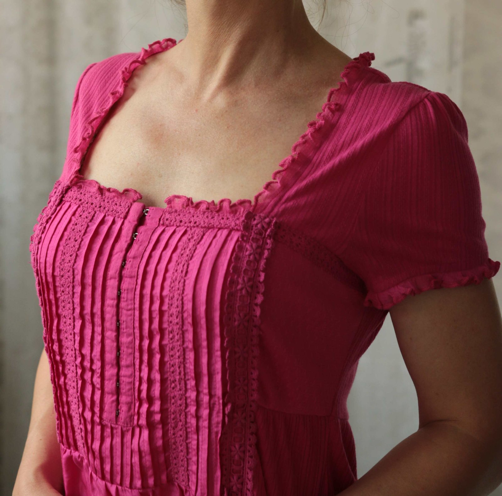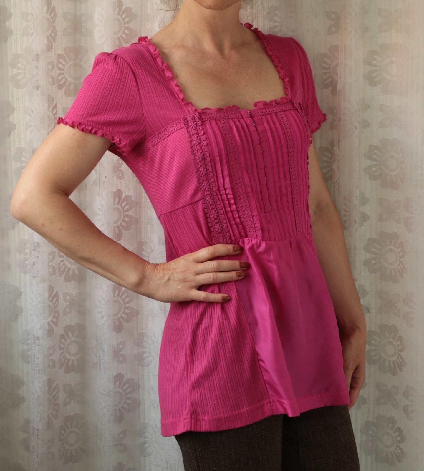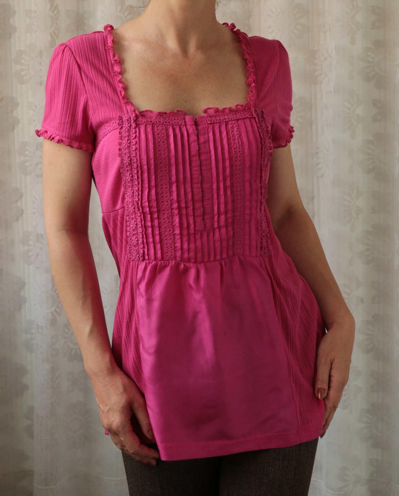 Niečo medzi tričkom a blúzkou zn. Next, materiál je z veľkej části tričkovina 65% polyester, 35% bavlna, na prednom dieli je nariasená časť z čistého hodvábu-silk. Oblieka sa cez hlavu, ale háčiky na predku sú funkčné. Mierne princesový strih. Pekne vypracovaná, volánky, čipka. Top stav. Rozmery rada zašlem. Odeslanie poštou, Balíkoboxom alebo Packetou. Cenu za odoslanie oznámim vopred.