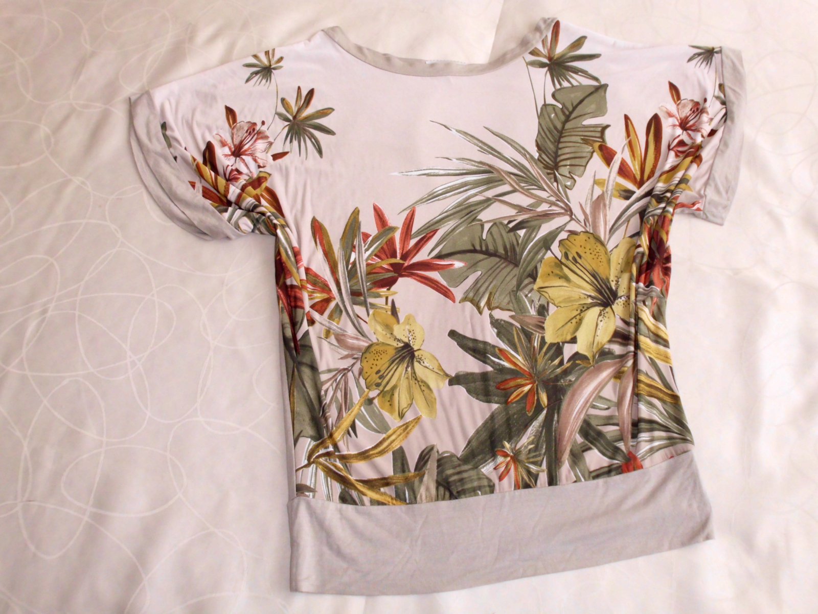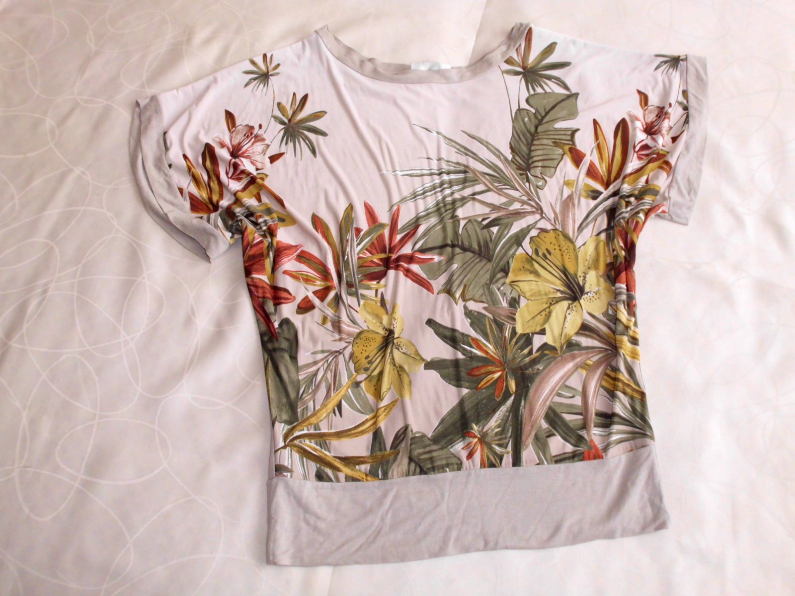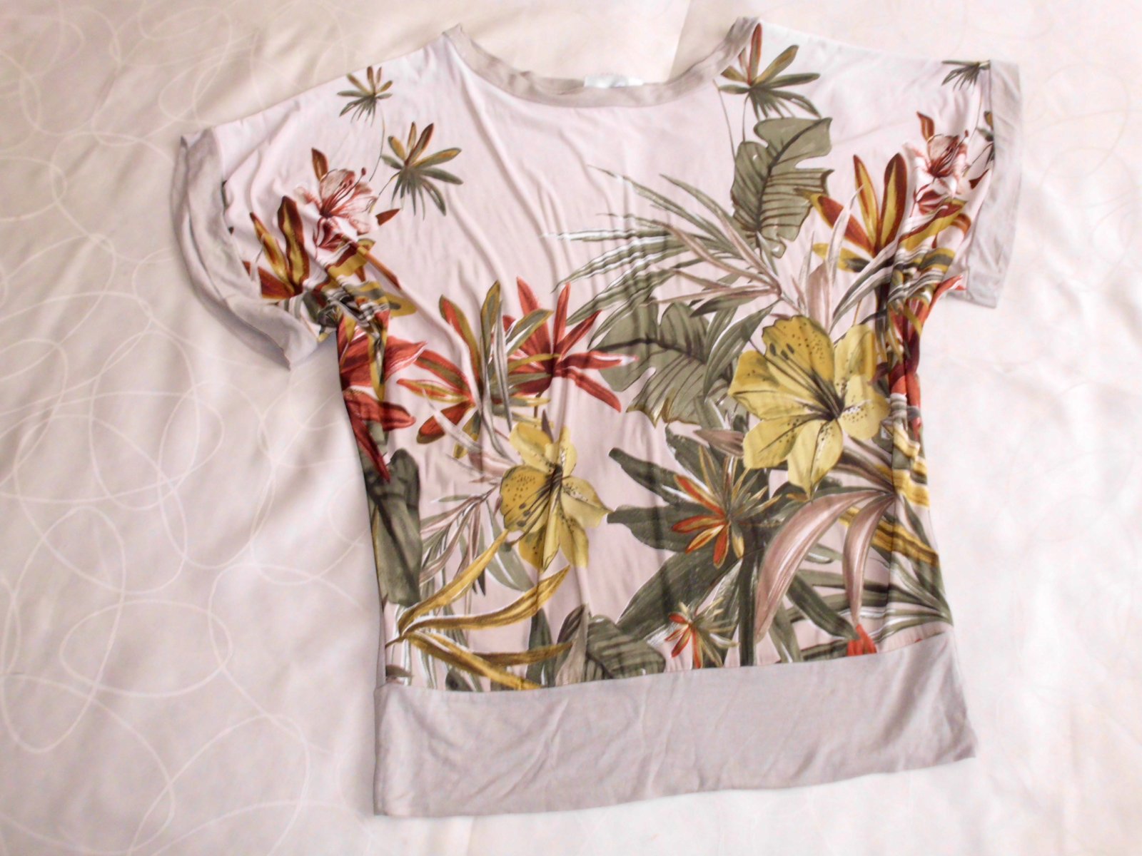 Predám dámske tričko Italy vel. L ale aj na M , šírka 55 cm, dĺžka 66 cm , rukáv od krku 26 cm, veľmi príjemný tenší pružný materiál , farba ako na foto béžovo sivý podklad + kvety, super stav