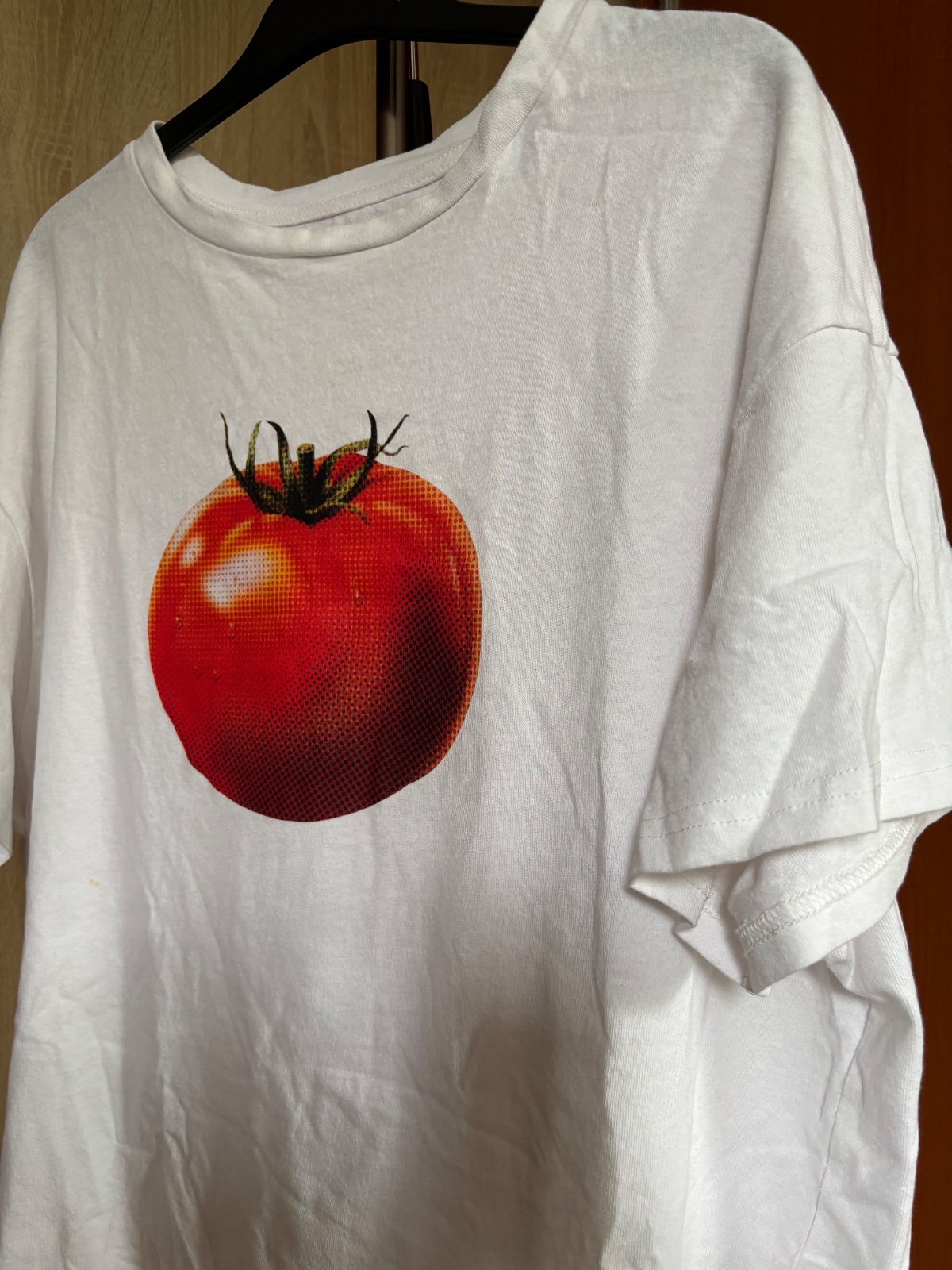 Biele tričko s rajčinou. Výborný stav, veľmi málo nosené. Výborný hrubší materiál - 100% bavlna.