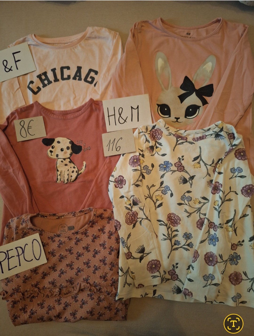 Obľúbené tričká H&M, veľkosť 110/116 v peknom nosenom stave. Na ružovom drobný fliačik, viď foto. Spolu za 4€.