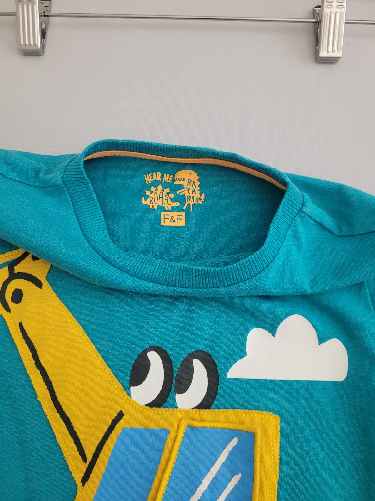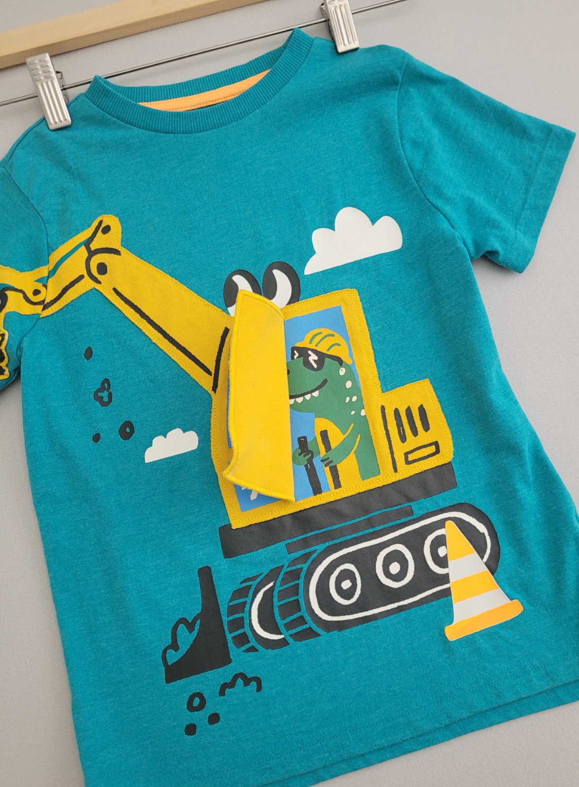 Velmi mile tričko bager ma otvaracie dvere a sedi vnom dinosaurus
