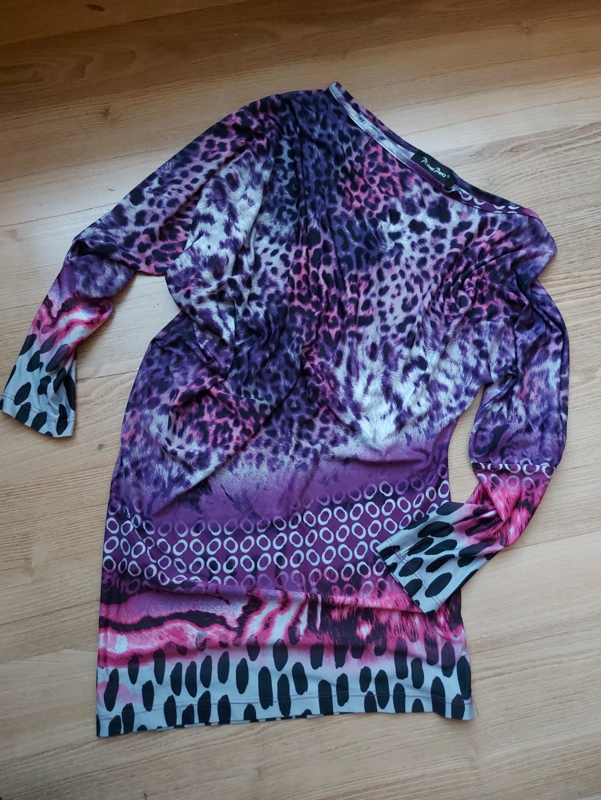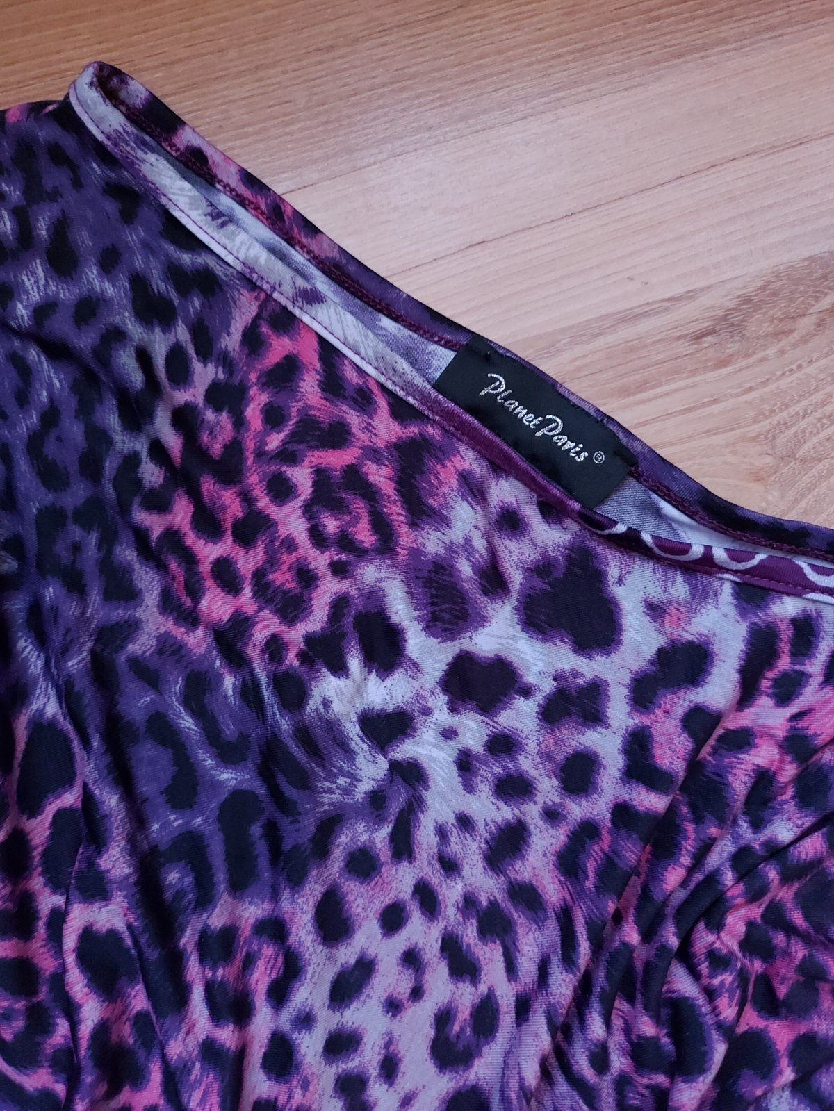 Veľmi pekná potlač so zlatistou/trblietavou farbou. v 100% stave. Materiál: 94% viskóza, 6% elastan. /zn. Moda Plus RK/
