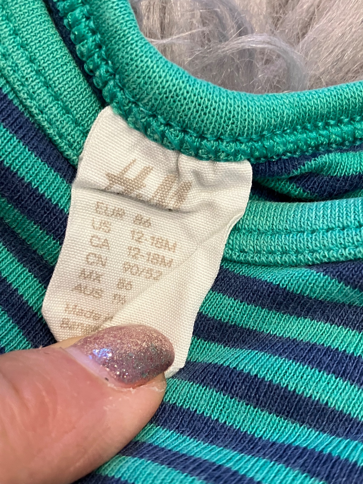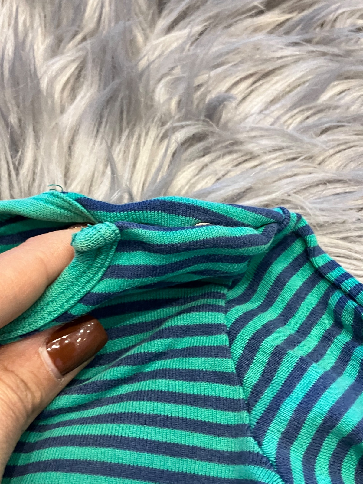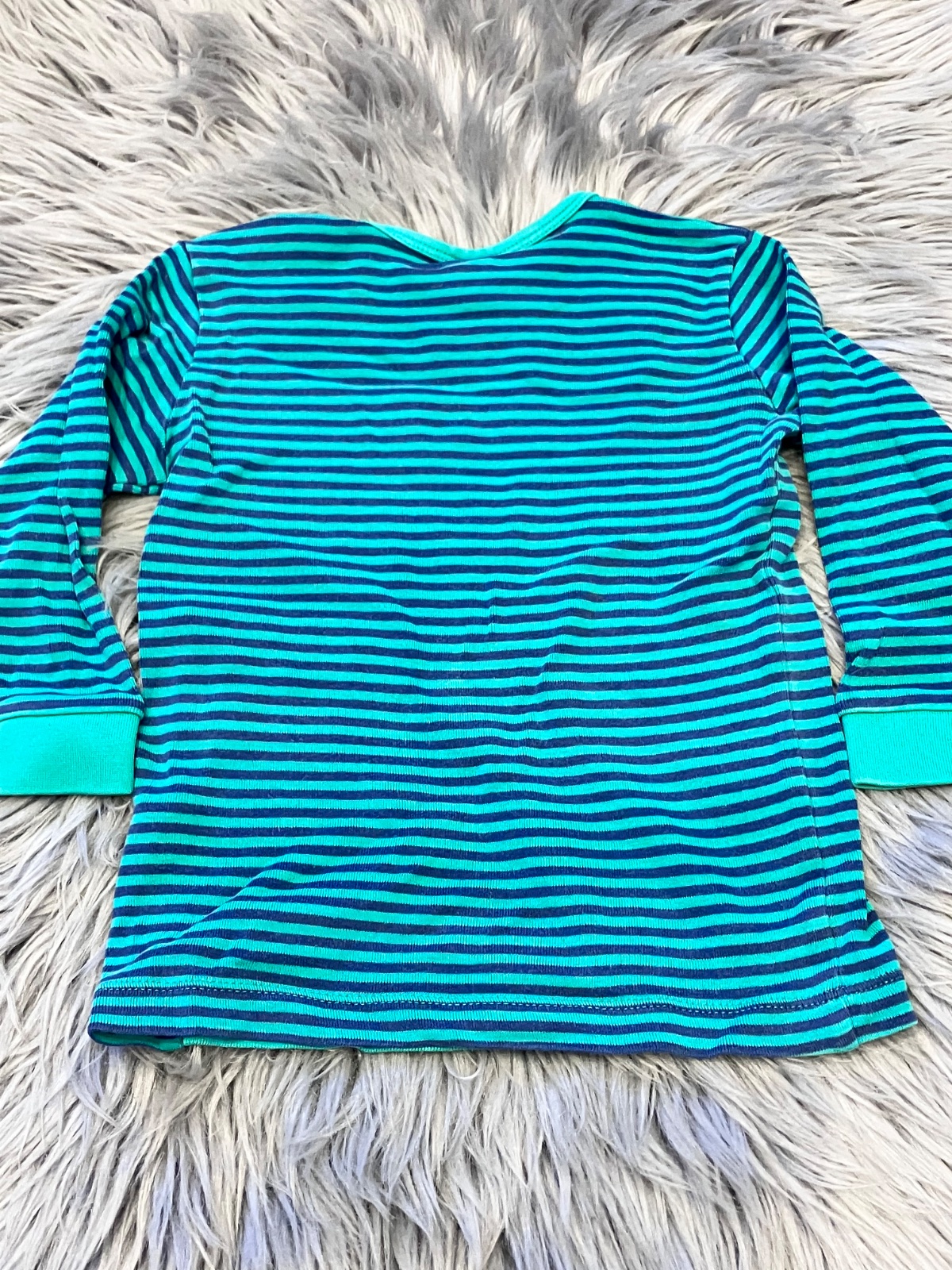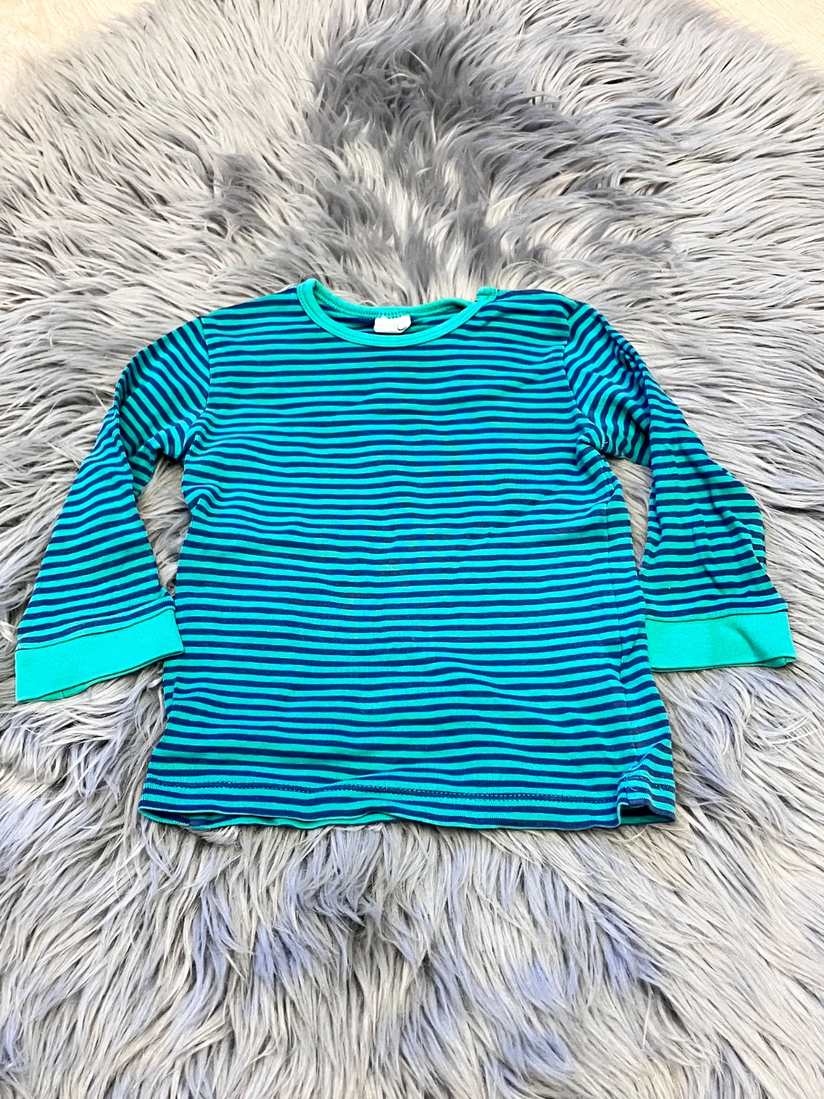 Chlapčenské pásikavé tričko s dlhým rukávom, elastické, zapínanie na ramene na cvoky, materiál 100%bavlna. Farba tmavomodro-tmavozelená.