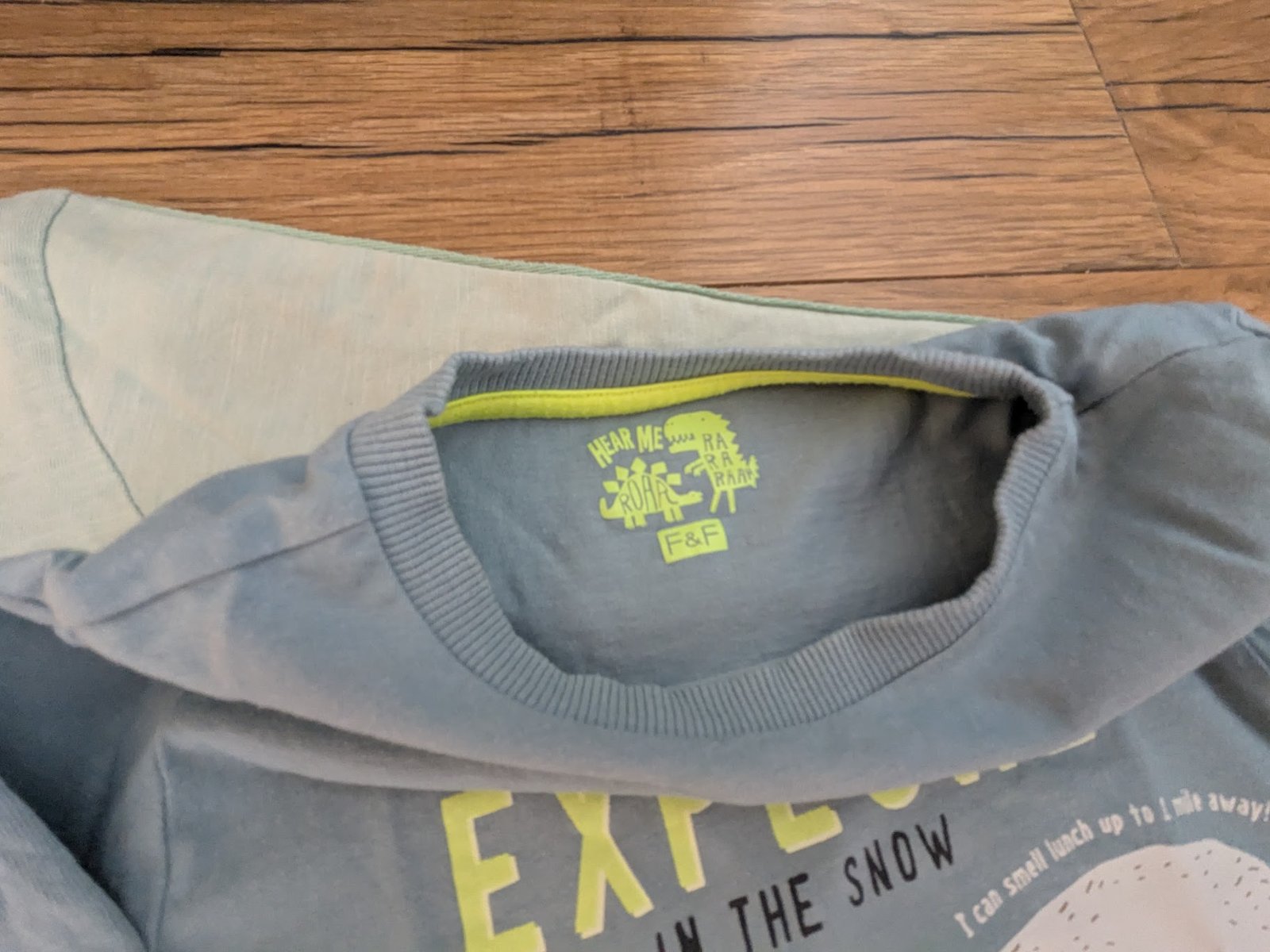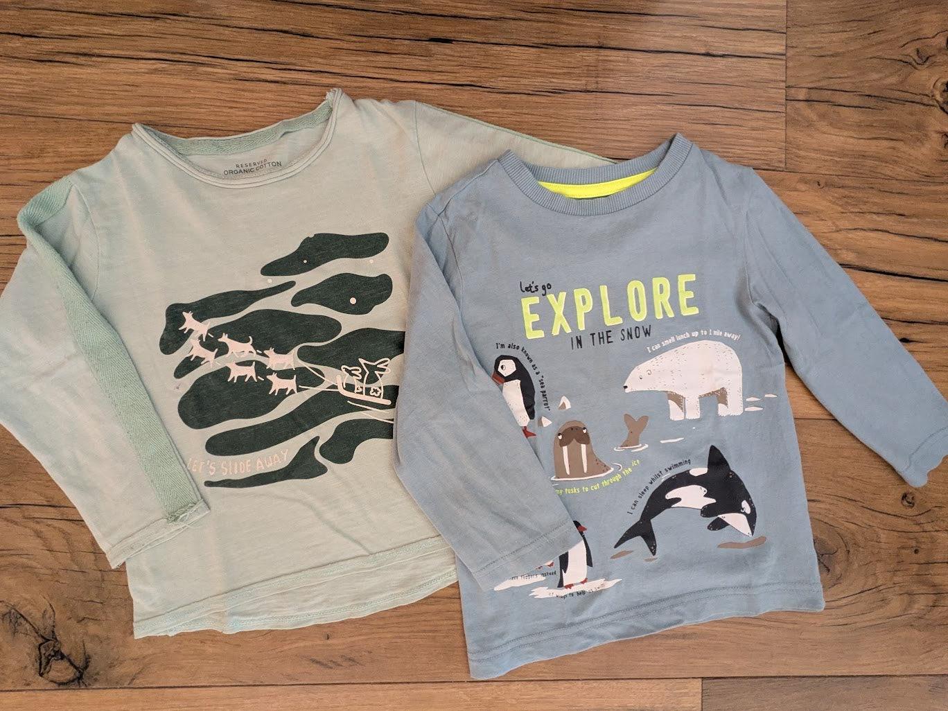 Tričká so zimným motívom, bledomodré dobrý stav, zelené pridávam zdarma, má fliačiky, akoby od fixky.