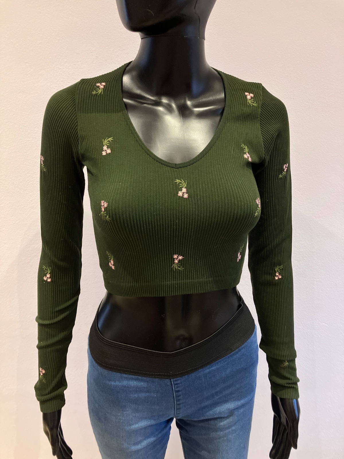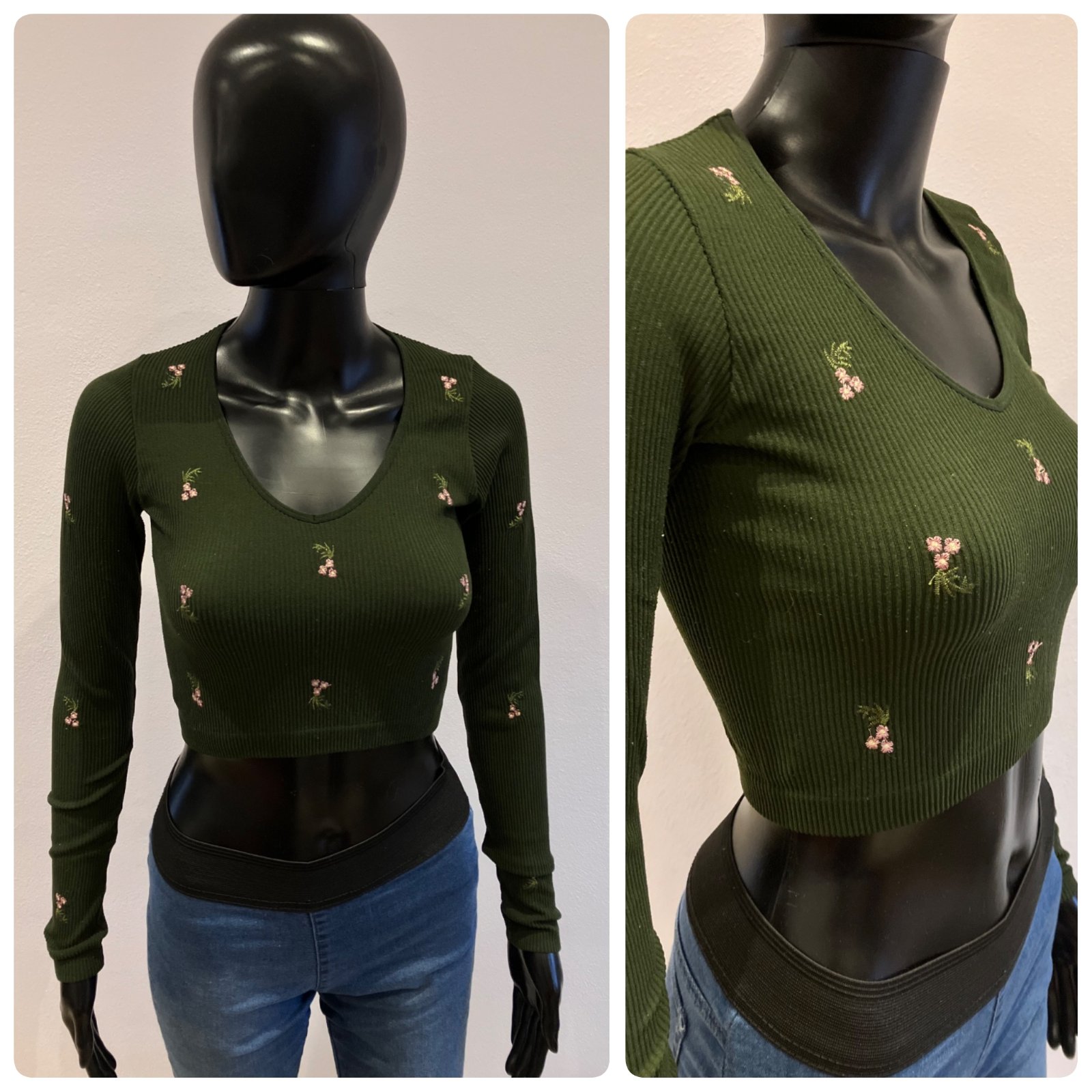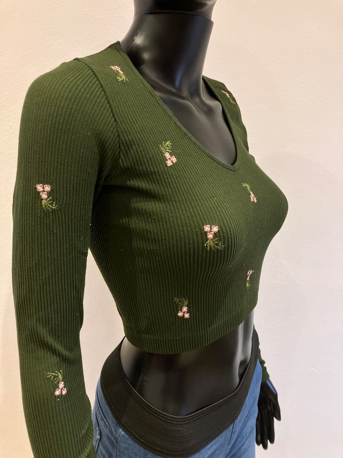 Dámsky crop top s dlhým rukávom, rebrovaný, tmavozelený s farebnými vyšívanými kvetmi, elastický, V výstrih.