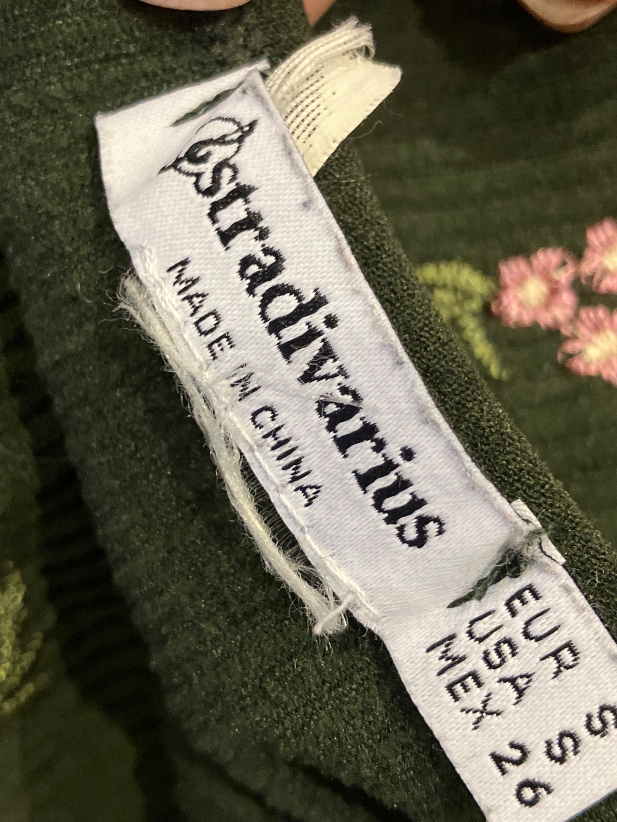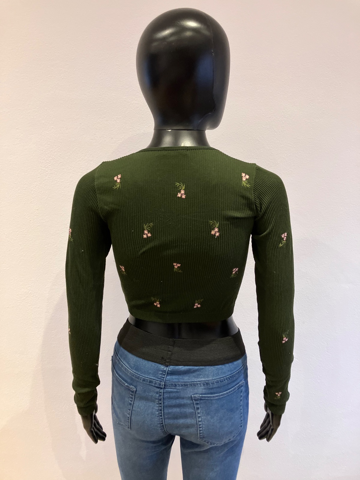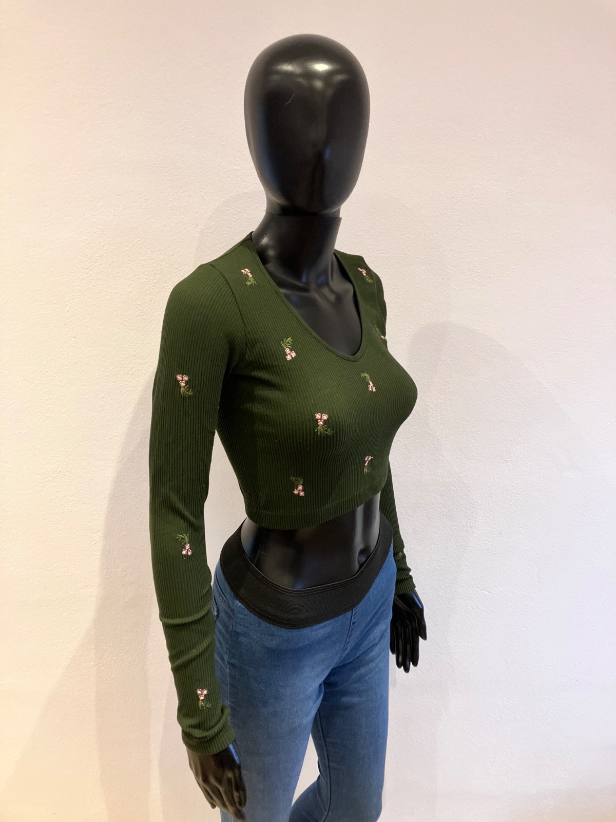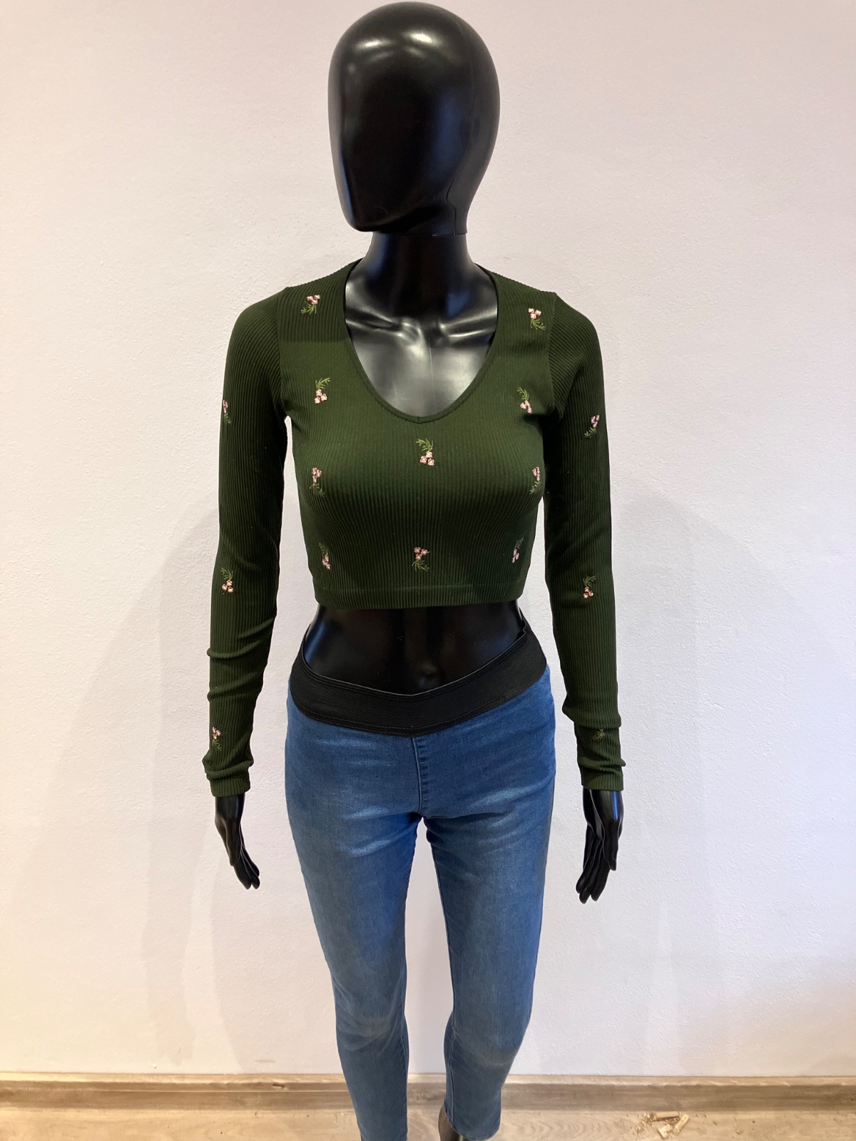 Dámsky crop top s dlhým rukávom, rebrovaný, tmavozelený s farebnými vyšívanými kvetmi, elastický, V výstrih.