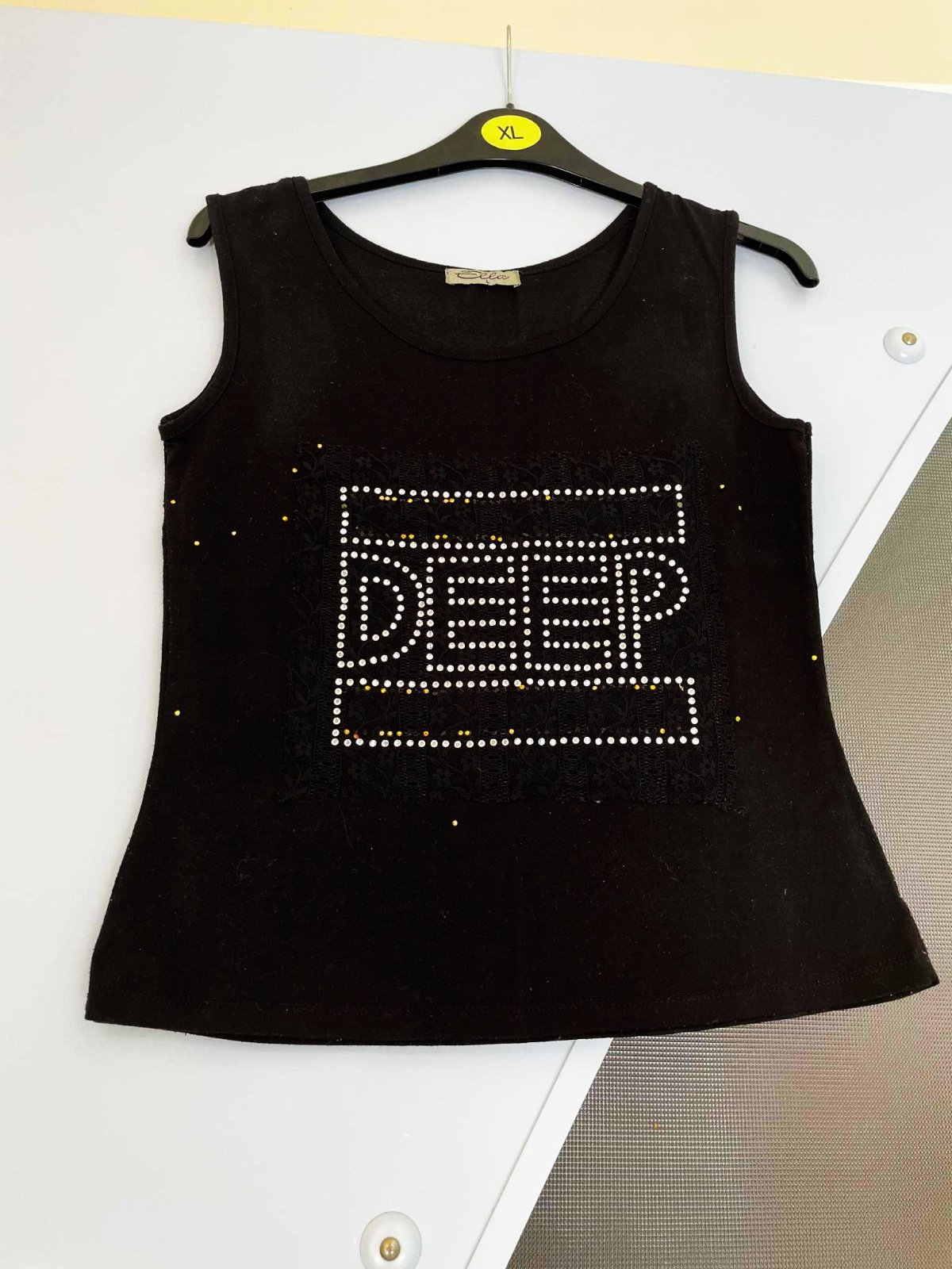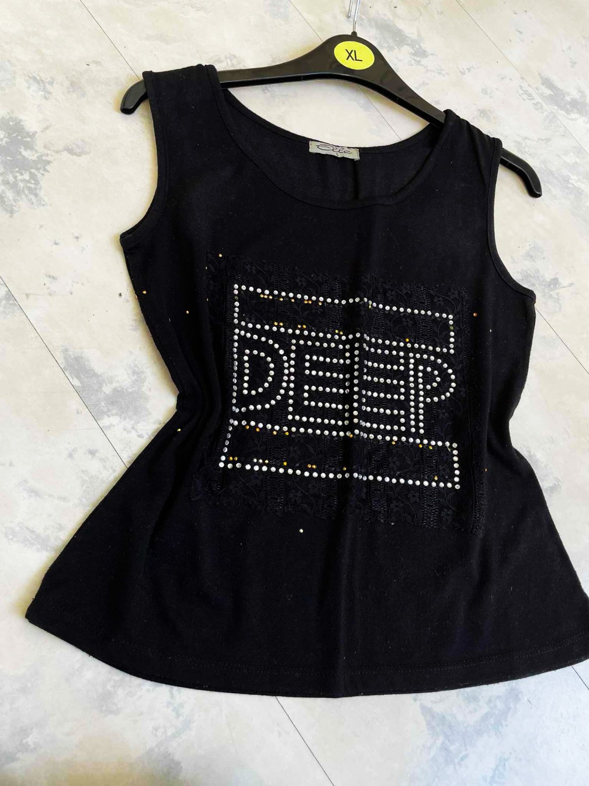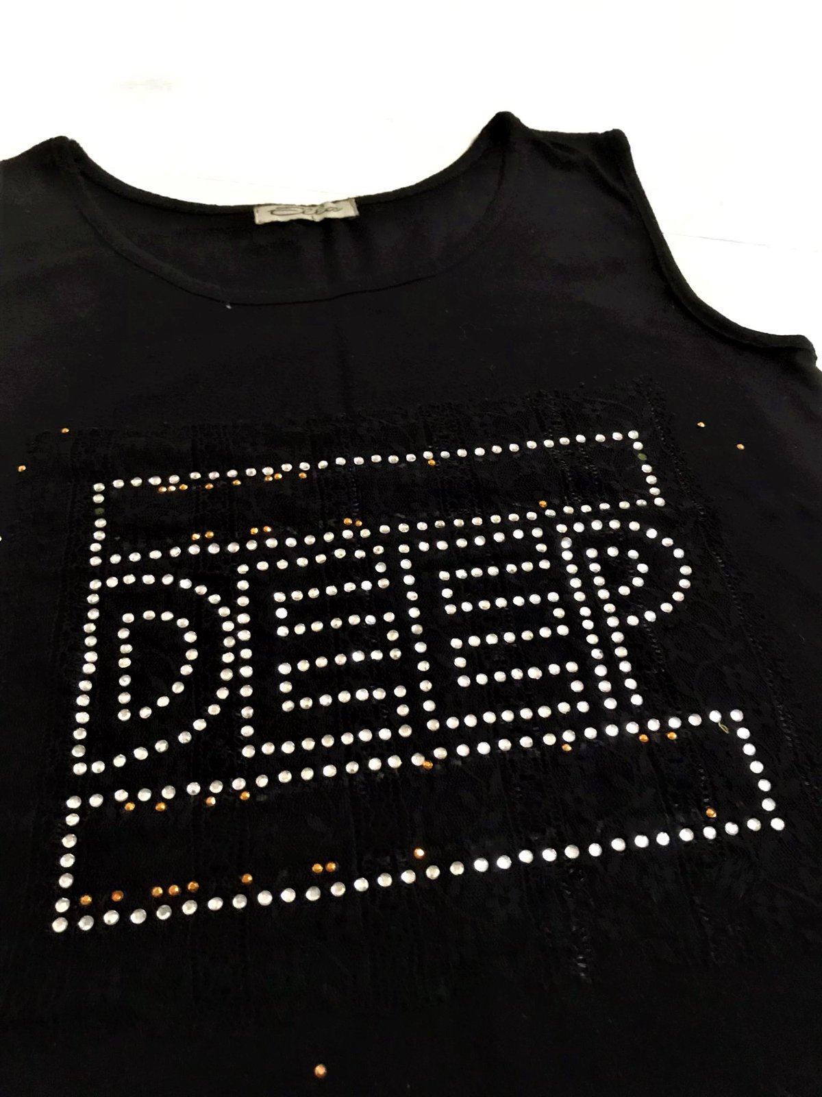 zachovalé,veľmi efektné a zaujímavé tričko = rockový štýl,vpredu nášivka - obdlžnik z čipky,trblietavé vybíjané kamienky,vzadu jemne prsknuté medené cvočky