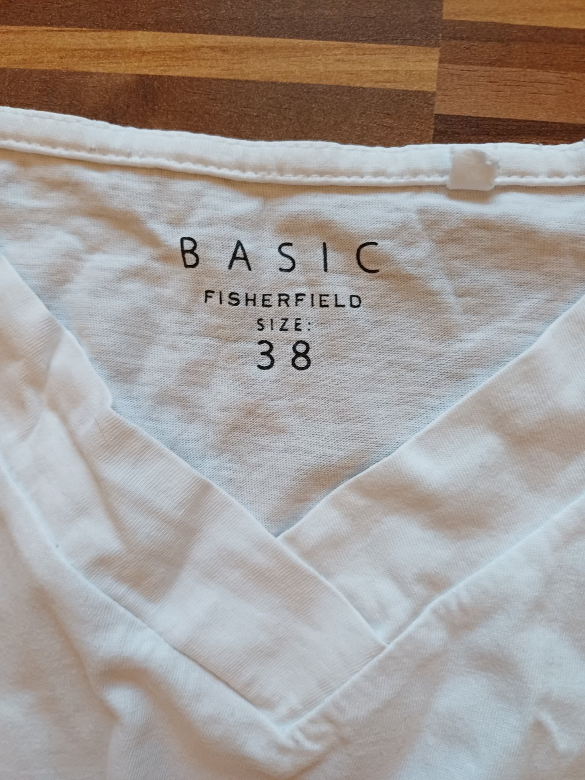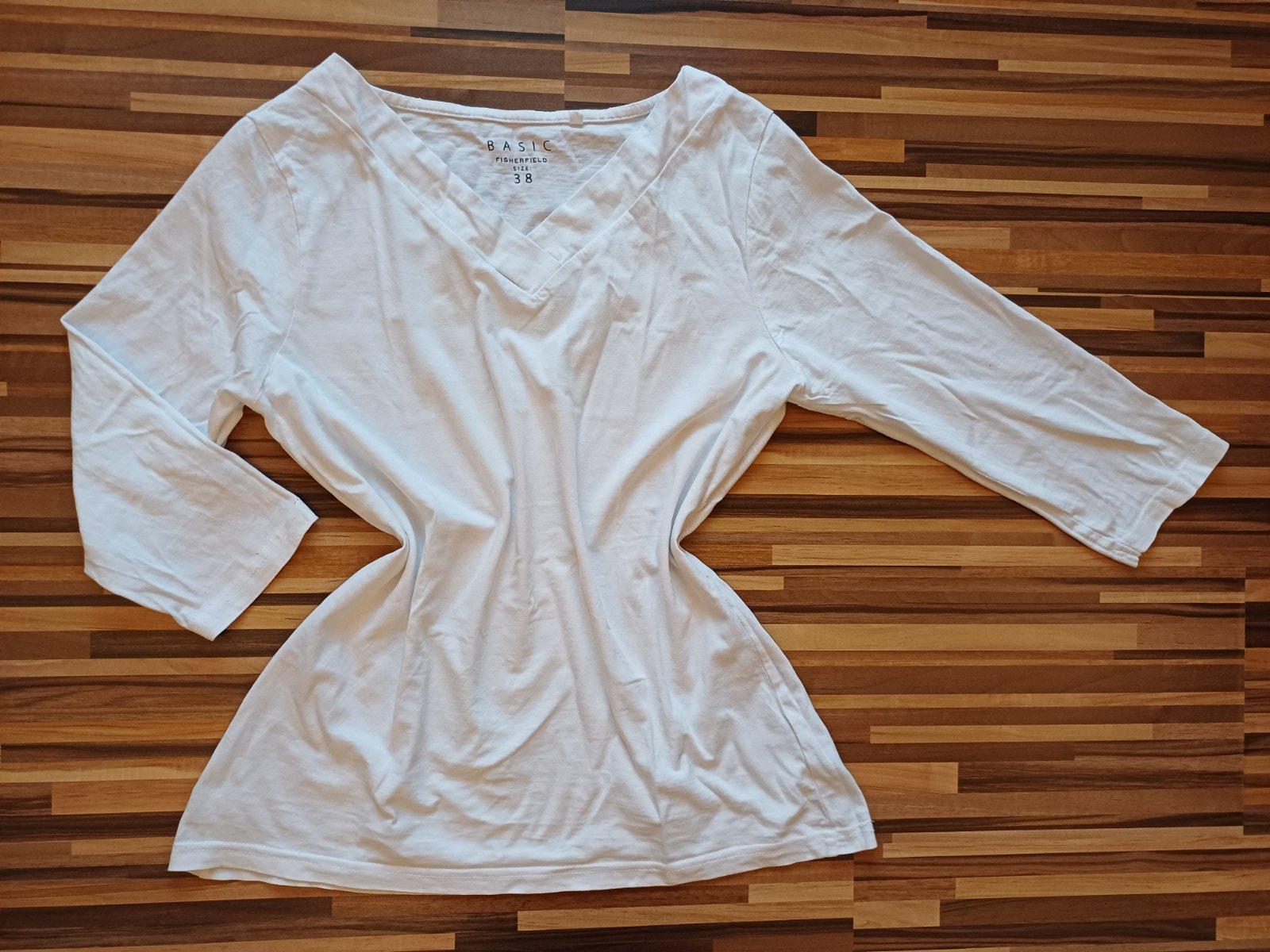 Basic tričko zn. Fisherfield, veľ. 38. Biele, 3/4 rukáv, výstrih do V. Rozmery: dĺžka od ramena po spodný okraj 56 cm, šírka cez prsia 41 cm, dĺžka rukáva 39 cm.