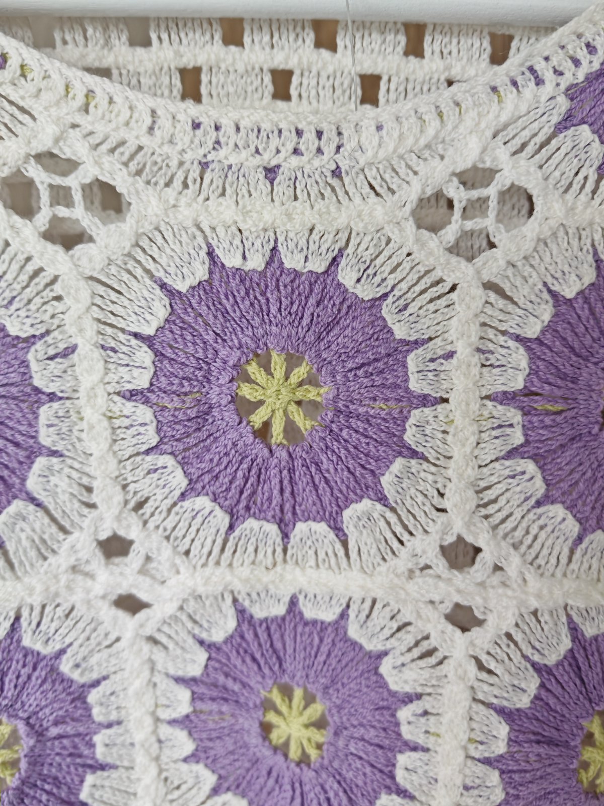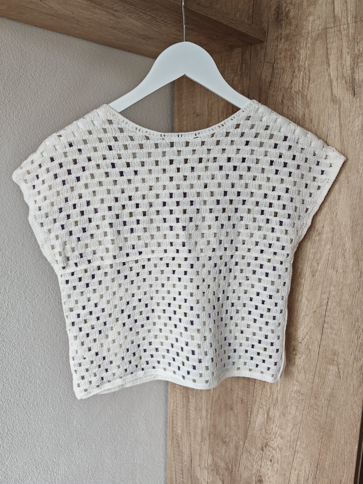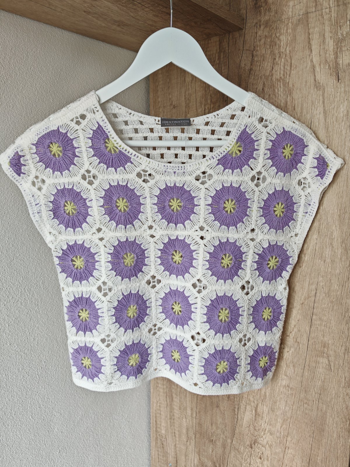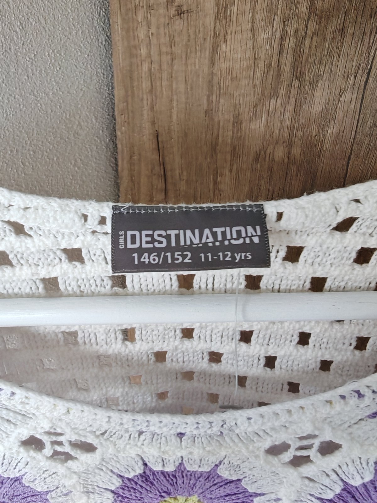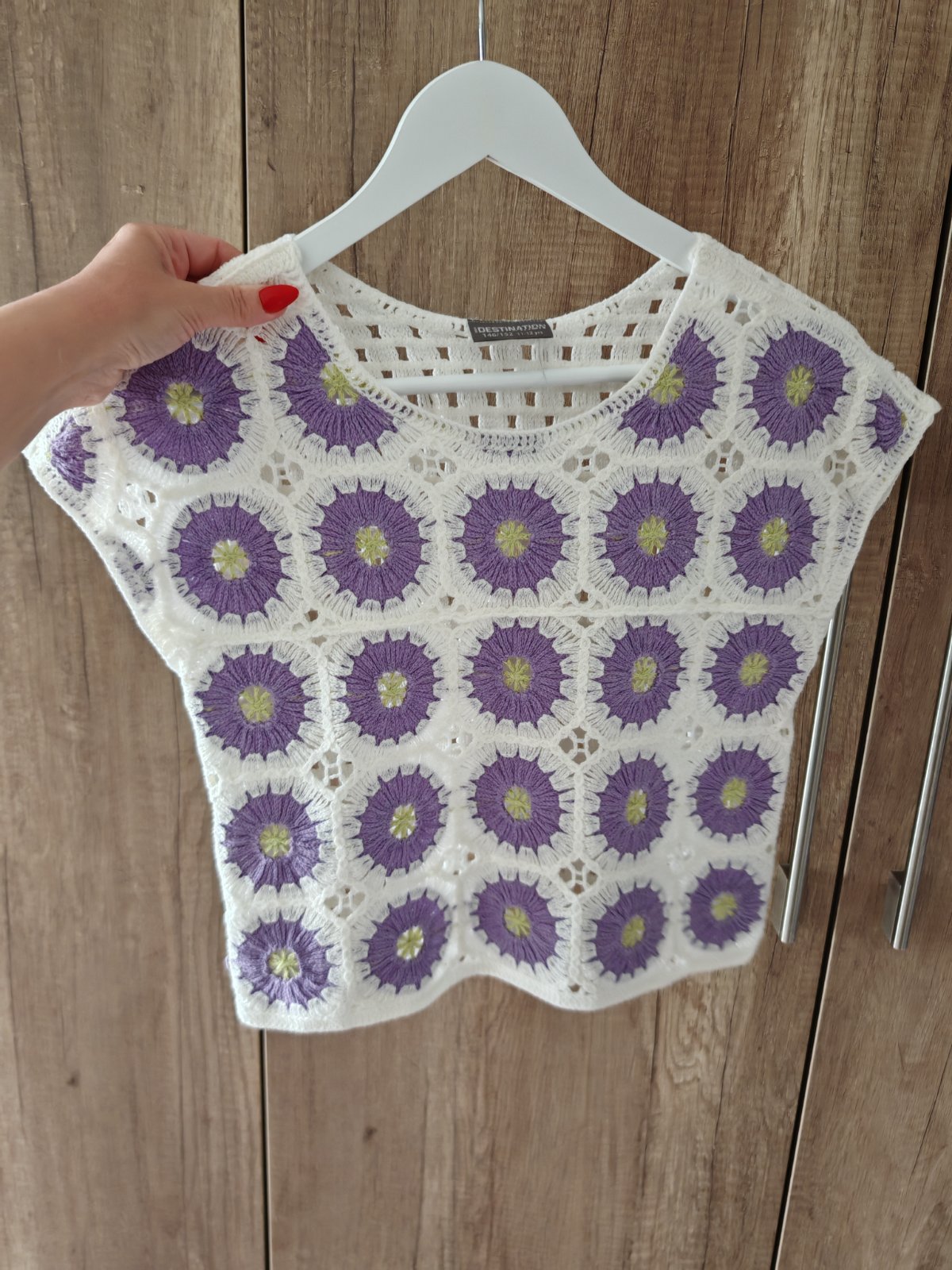 veľkosť 146/152 cm, svetlo fialový top na ramienka s farebným motívom ozdobený kamienkami, pekný, málo nosený, príjemný kvalitný materiál, 100 % bavlna, porovnaj si miery. Merajte: šírka pod pazuch...