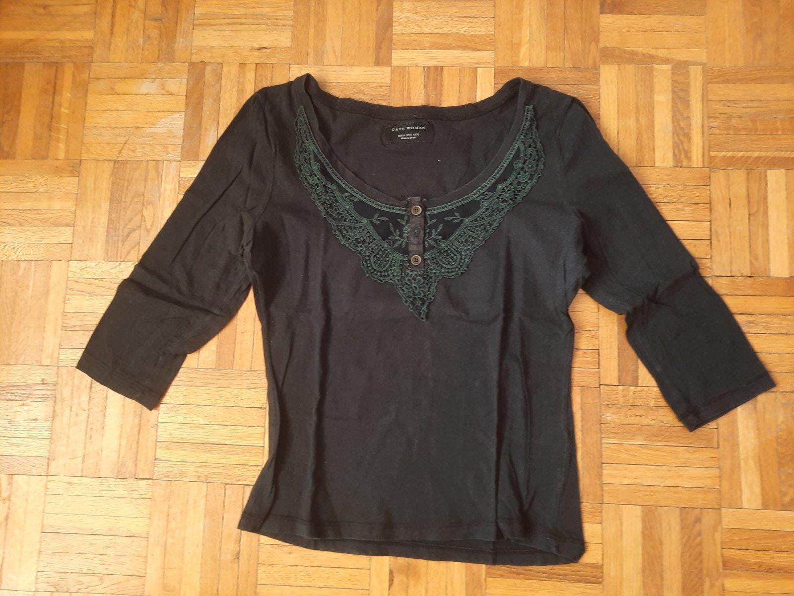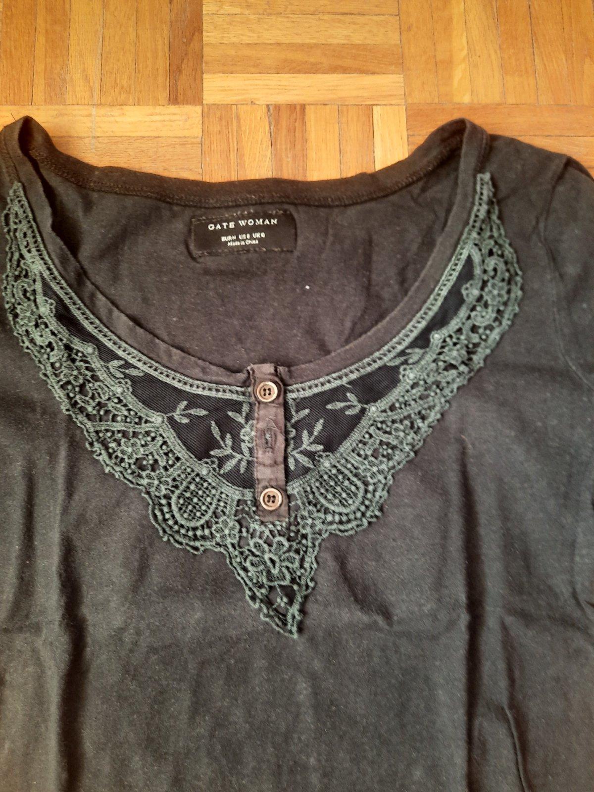 krasne cierne tricko velmi zaujimaveho volnejsieho strihu. no na spodnom leme je gumicka, takze aj ked je volnejsie sedi perfektne. nad gombikmi je efektna snurka. oblecene bolo 2 krat. velkost ...