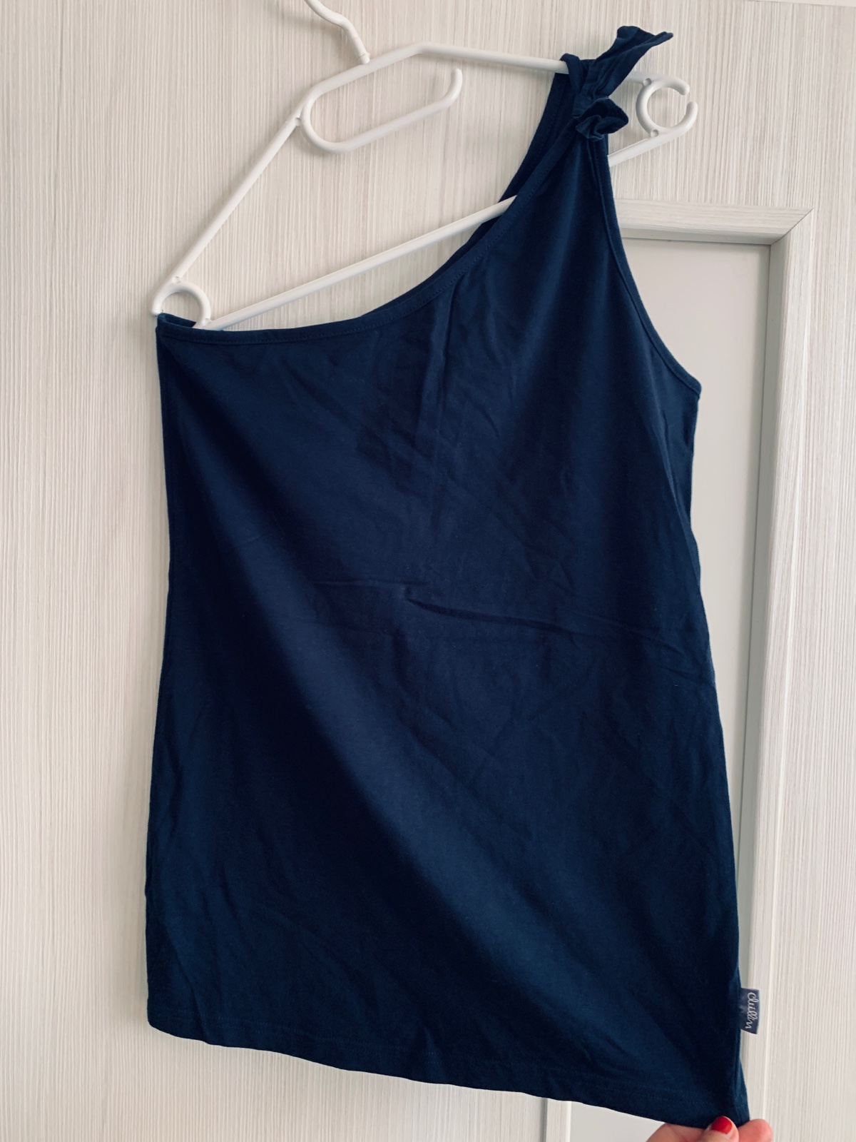 Tmavomodré tielko na jedno ramienko, s mašličkou, myslím, že nebolo nikdy oblečené, veľ. uvedená XL, ale skôr M-L