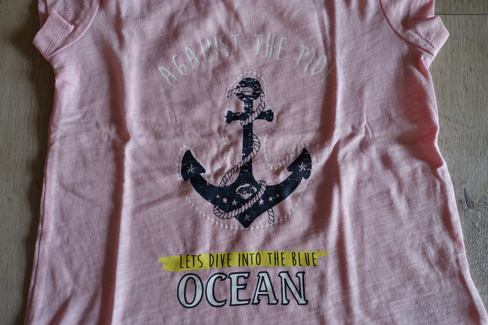 Predám krásne tričenko s kotvou vo veľkosti 110/116. Podtlač je krásna, nepoškodená. Mali sme ho 1x, je top stav. Nemá fľaky, ani dierky, ani žmolky. Dĺžka je 47 cm a šírka 32 cm. (G)